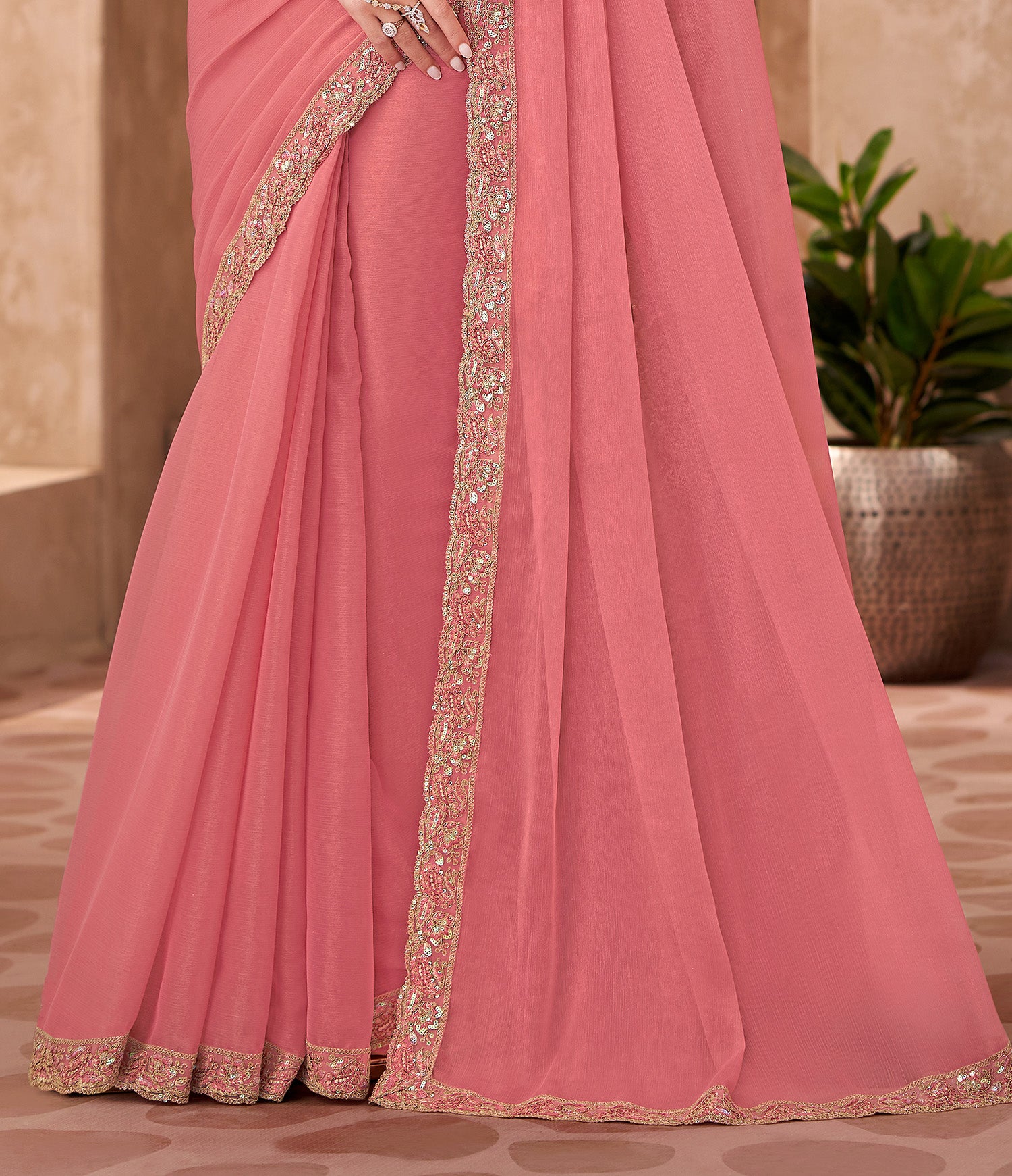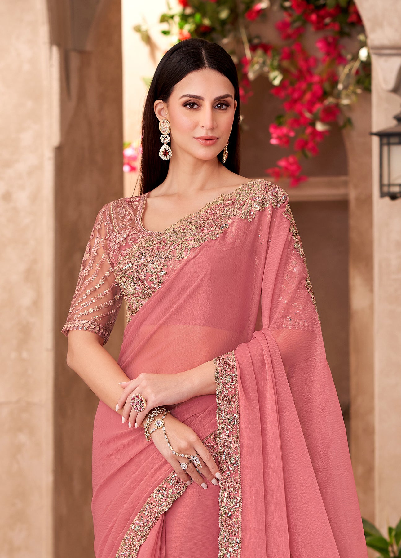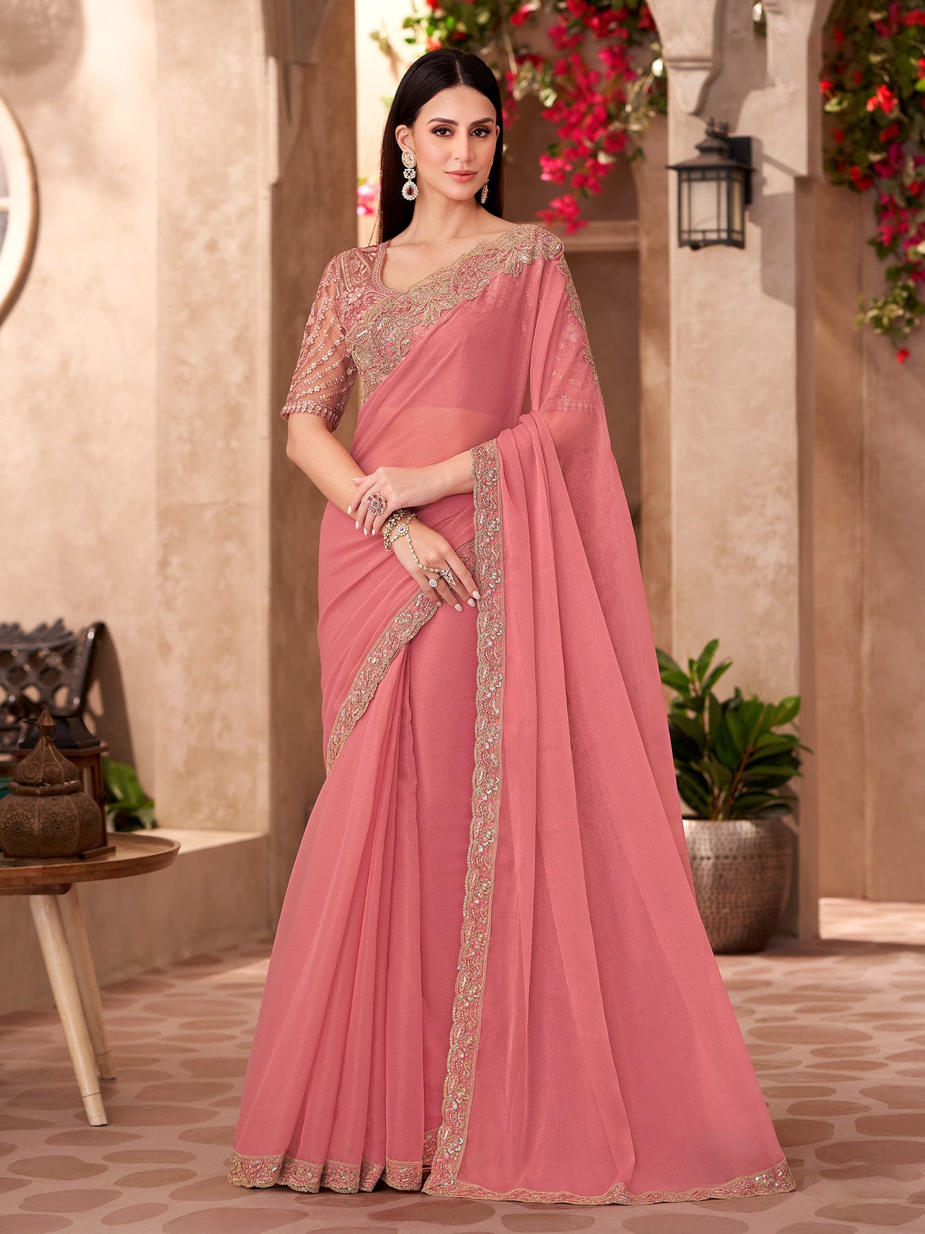 Peach Georgette Silk Heavy Embroidery and Sequin Work Partywear Saree