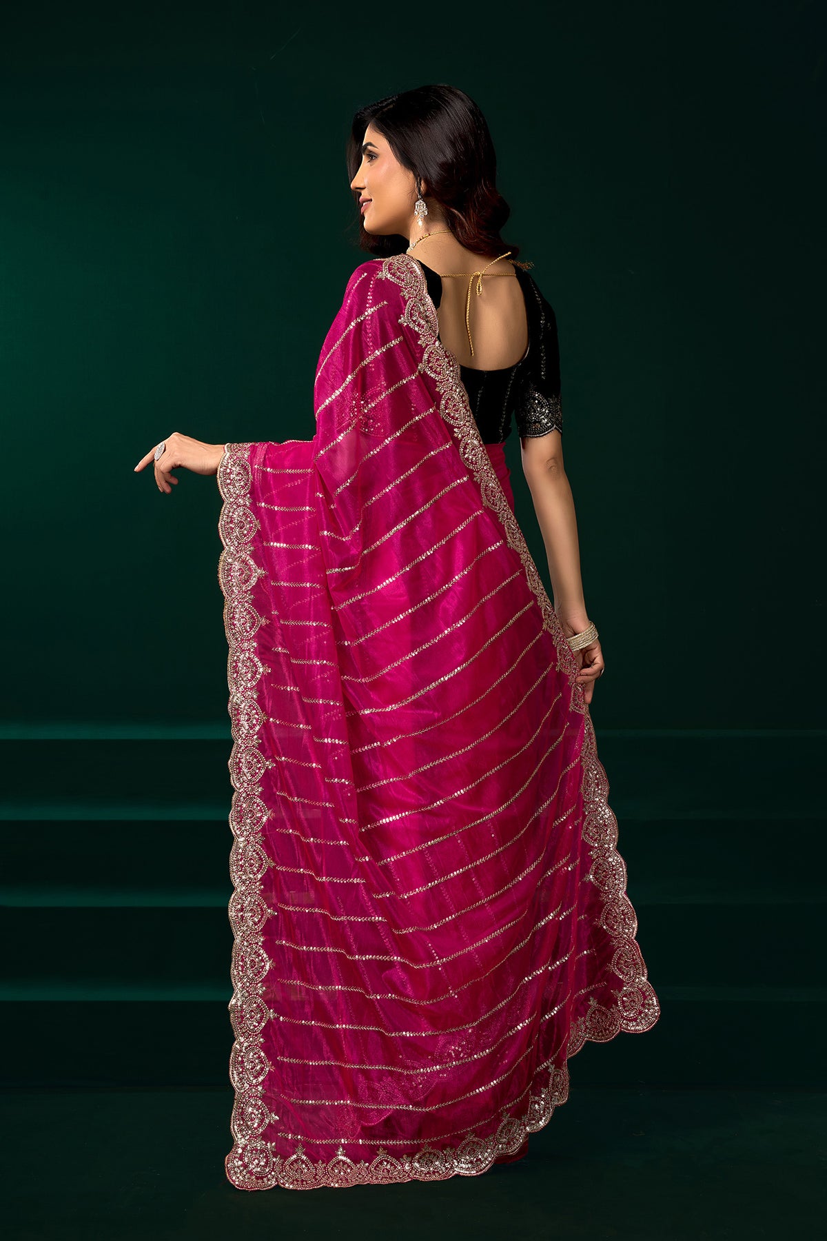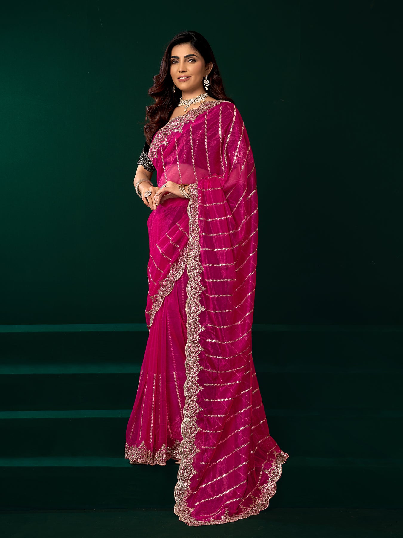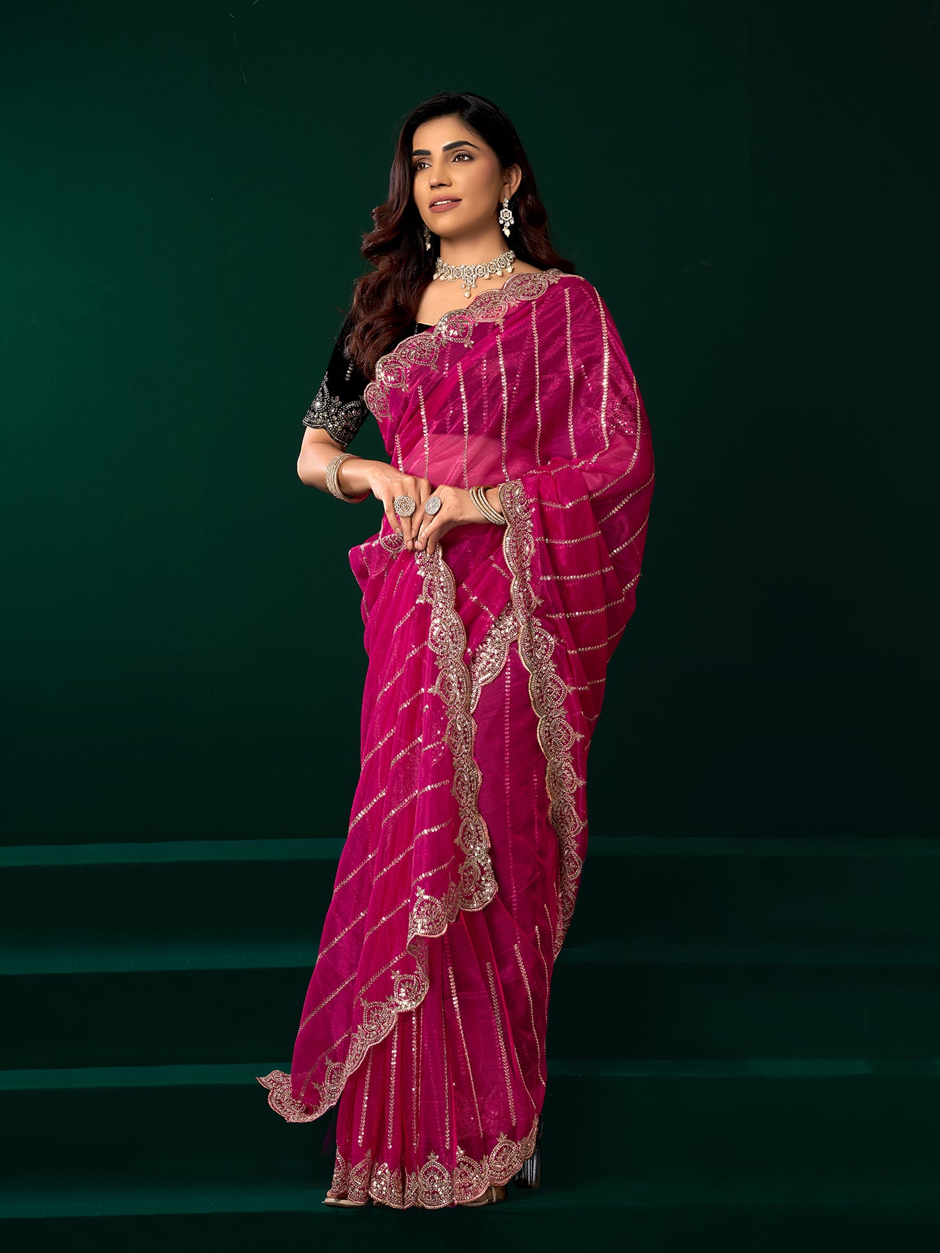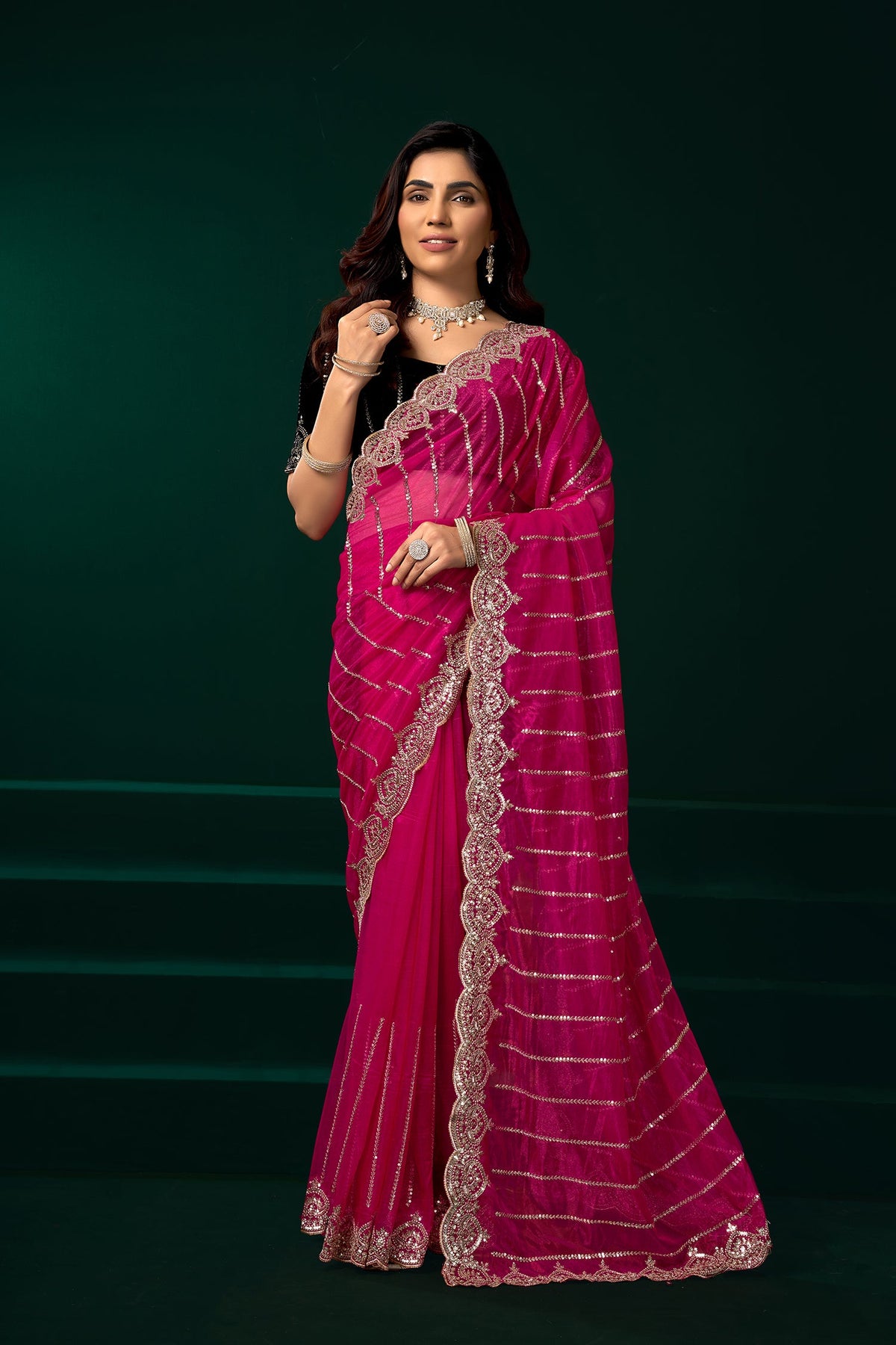 Rani Pink Net Shimmering Lines Sequence Embroidery Party Wear Saree