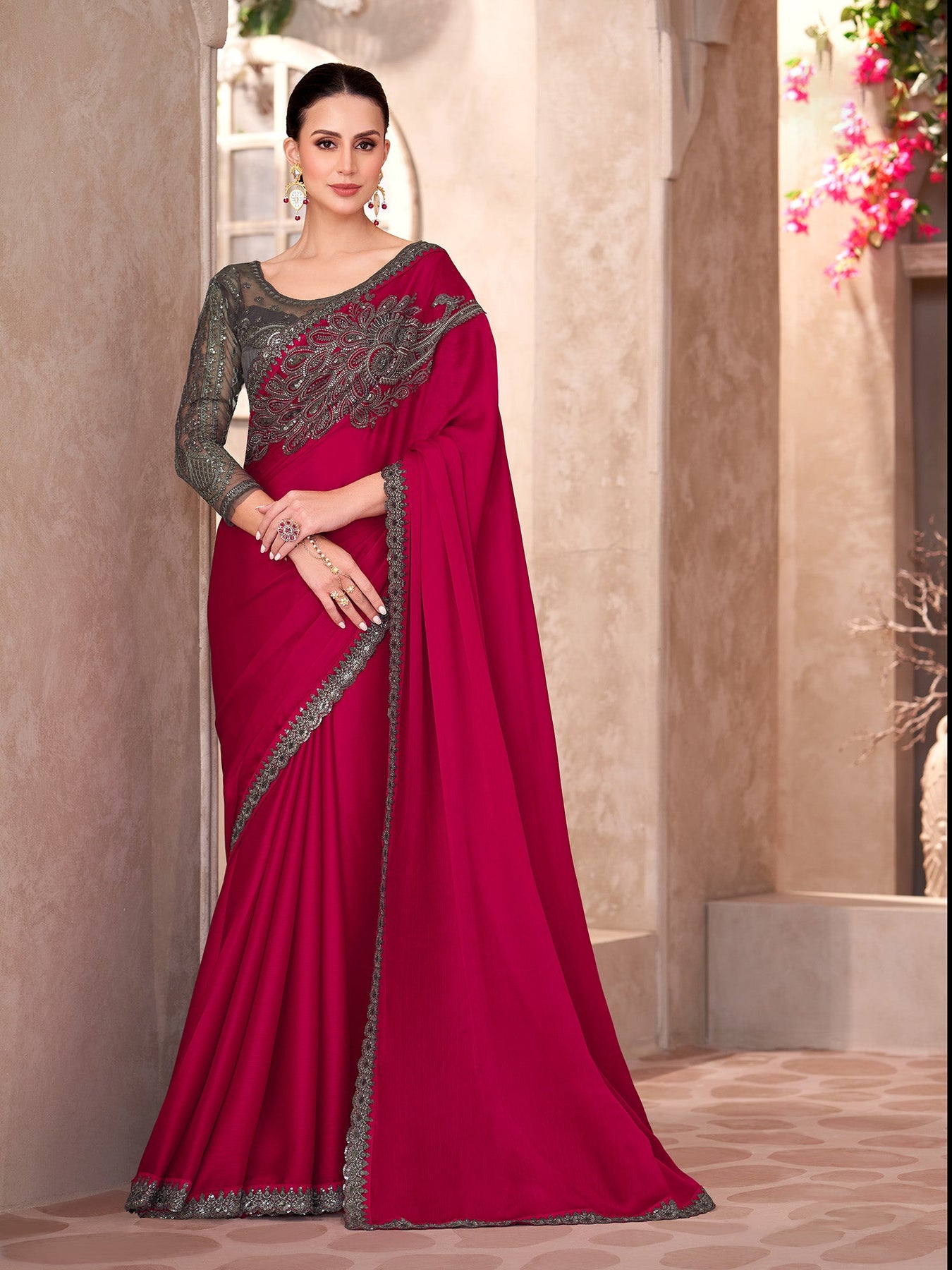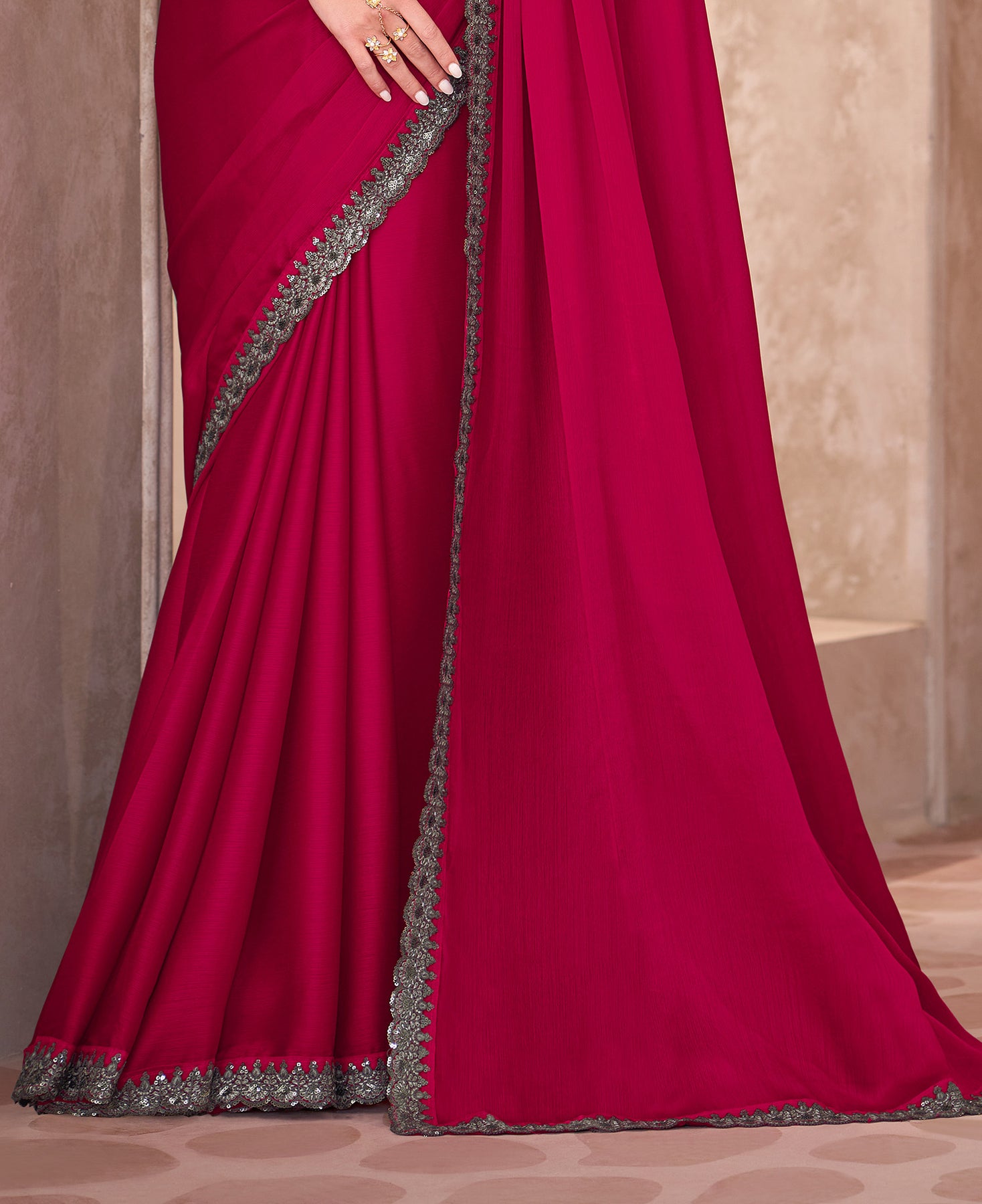 The soft chiffon silk drapes gracefully, offering comfort and style. Its rich red shade with intricate detailing makes it perfect for evening events, receptions, and traditional occasions.