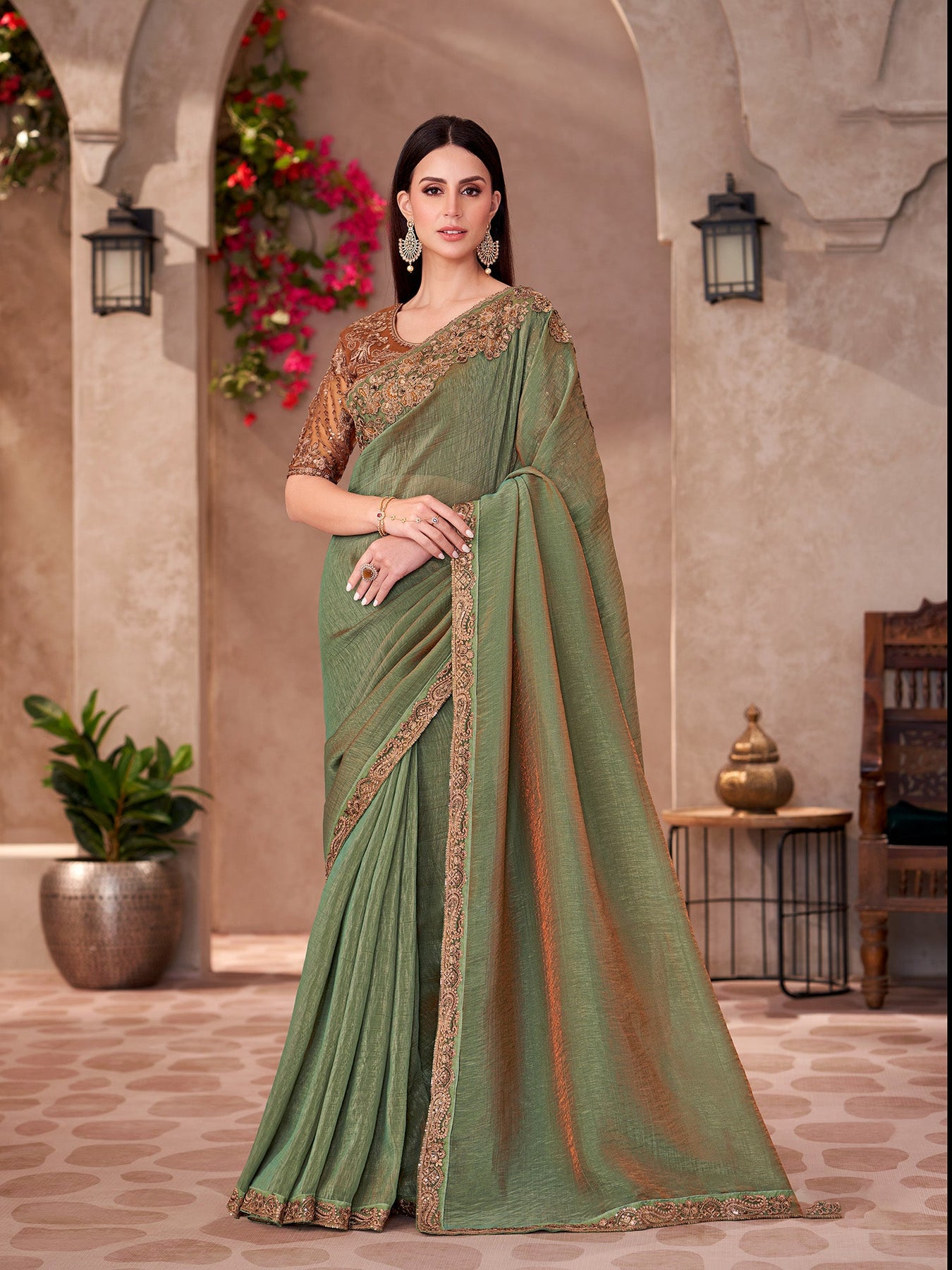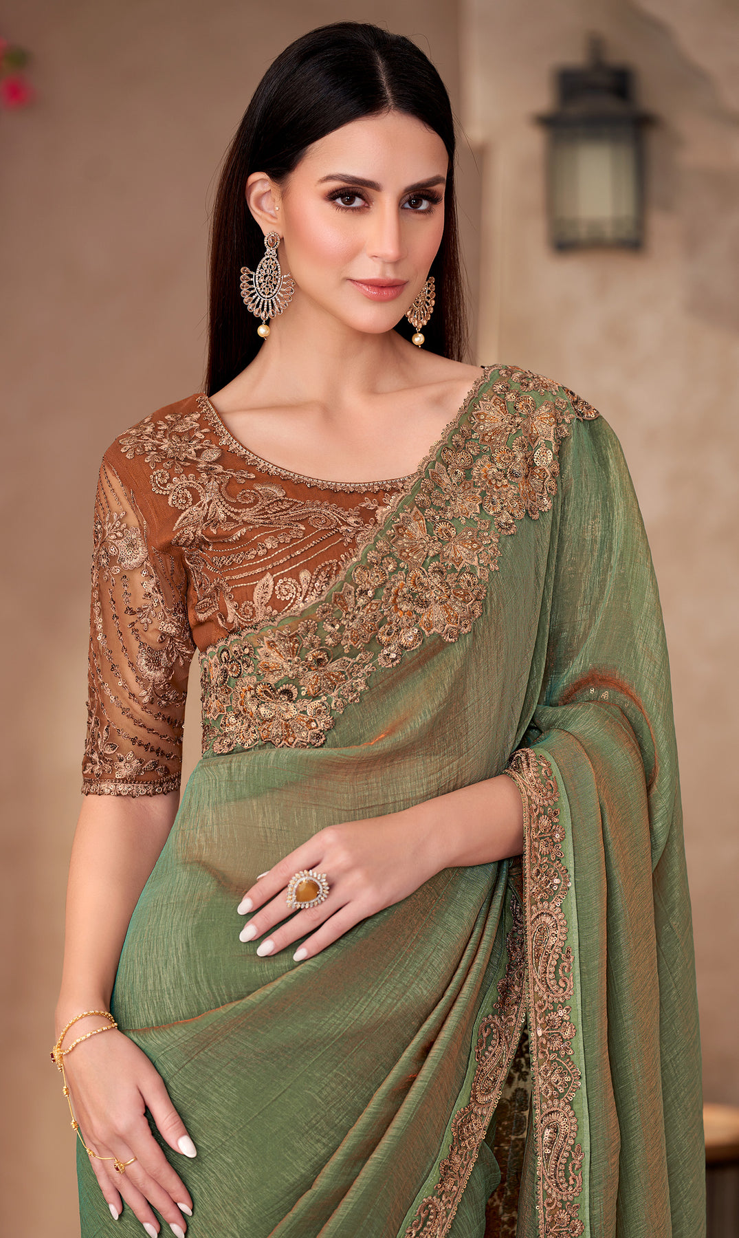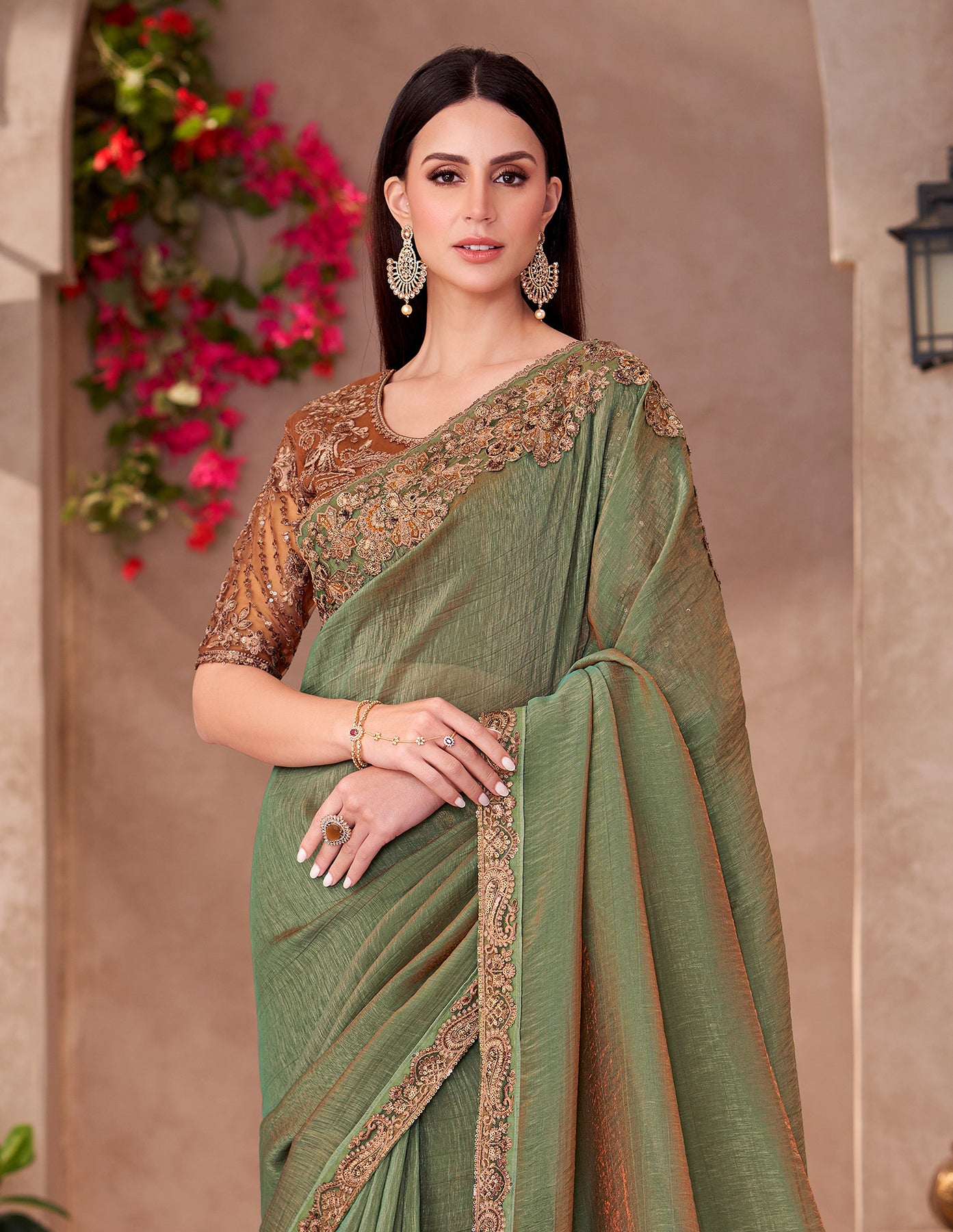 Sage Green Golden Shine Georgette Heavy Embroidery and Sequin Work Partywear Saree