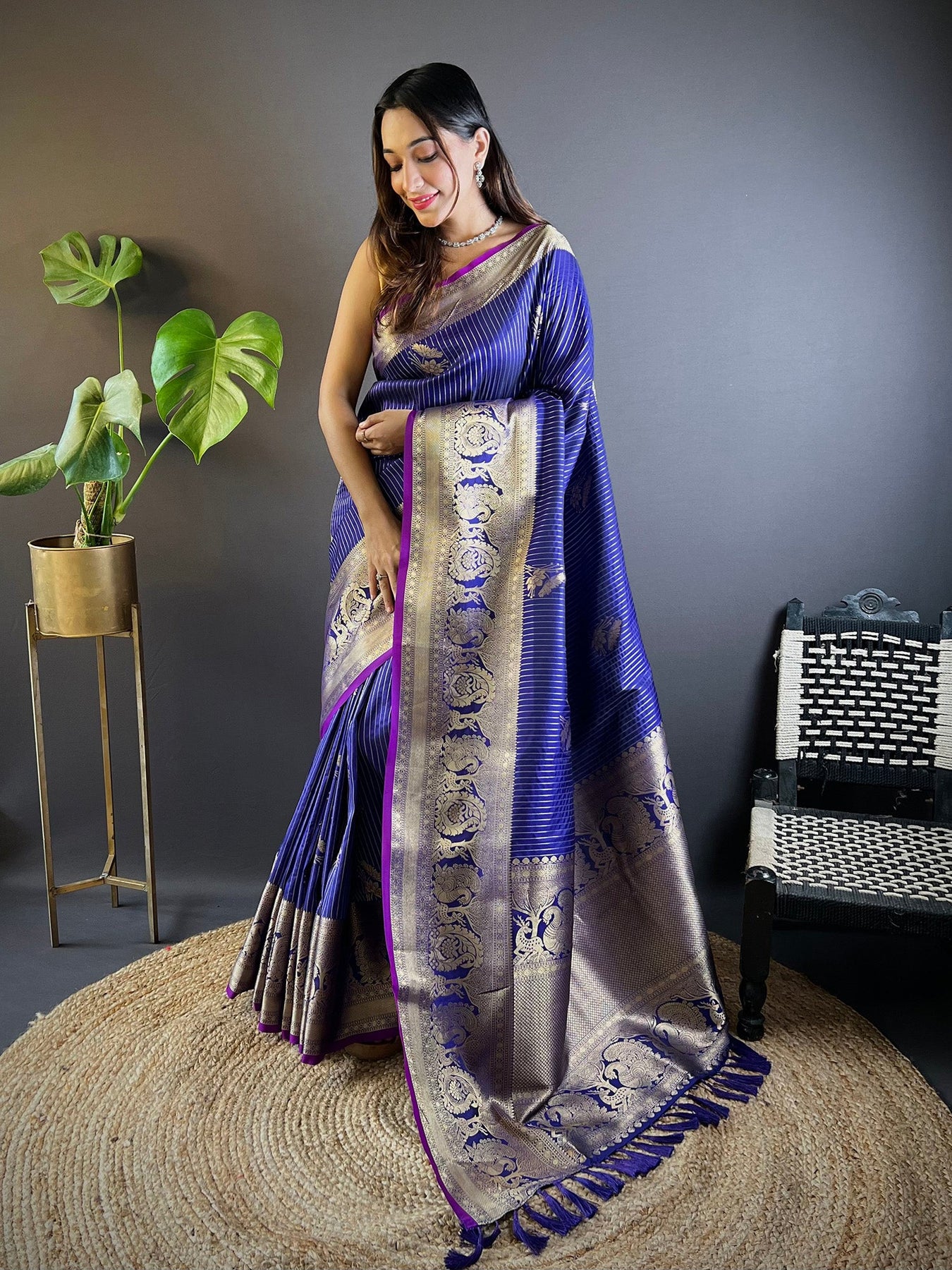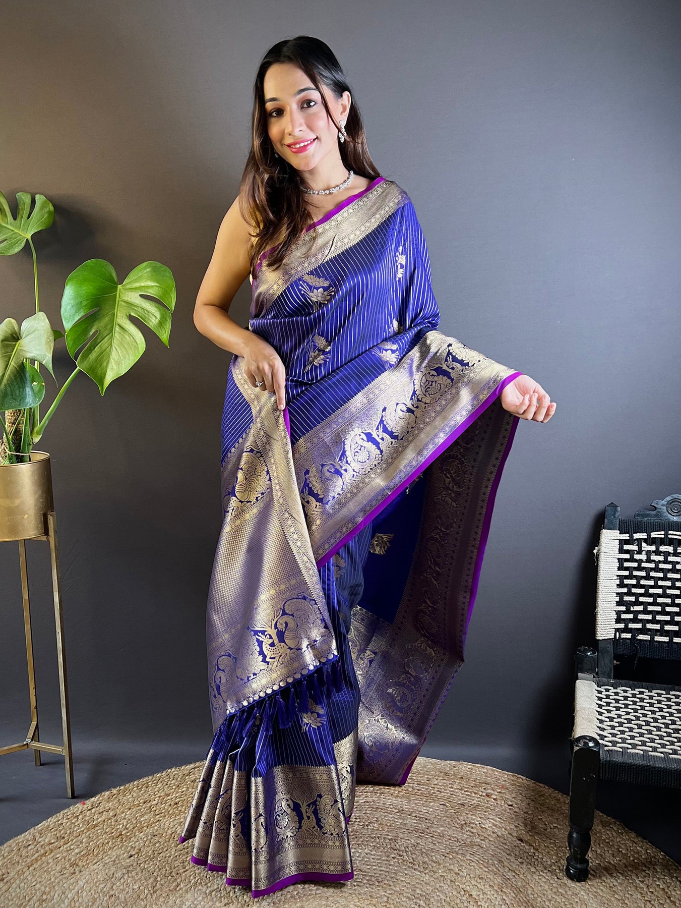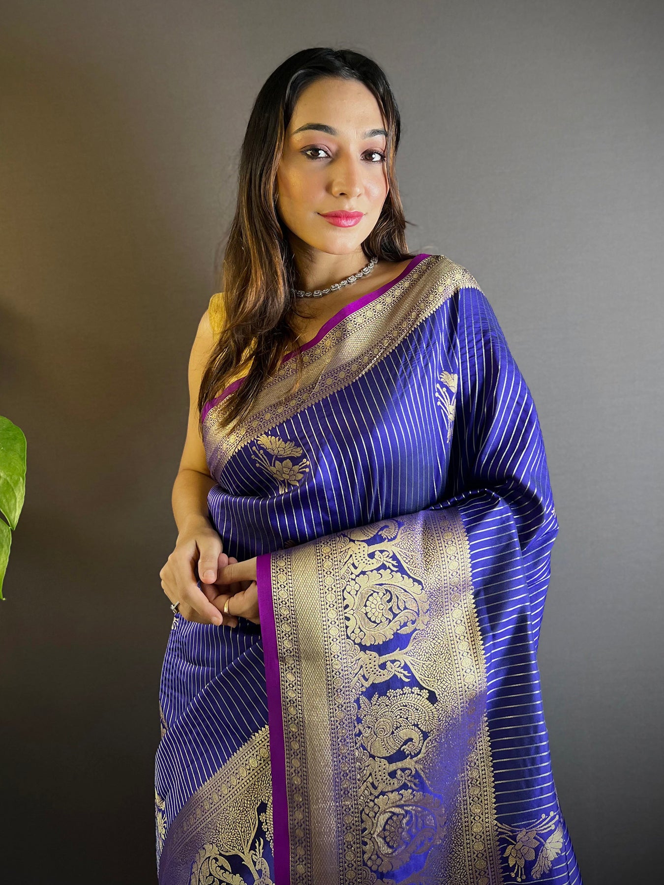 Royal Blue Soft Silk Striped With Floral Motifs Zari Jacquard Weaving Leheriya Saree