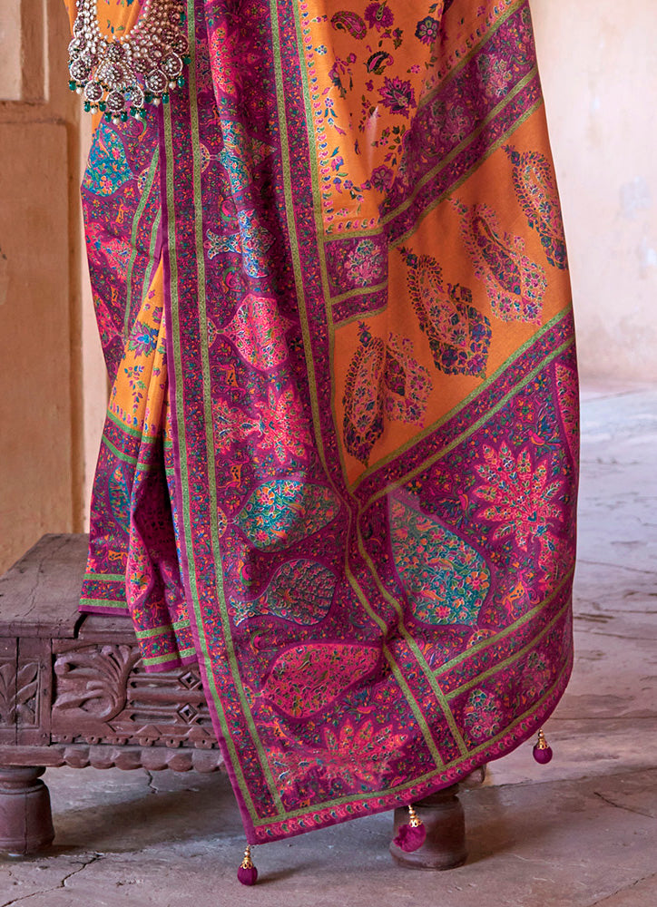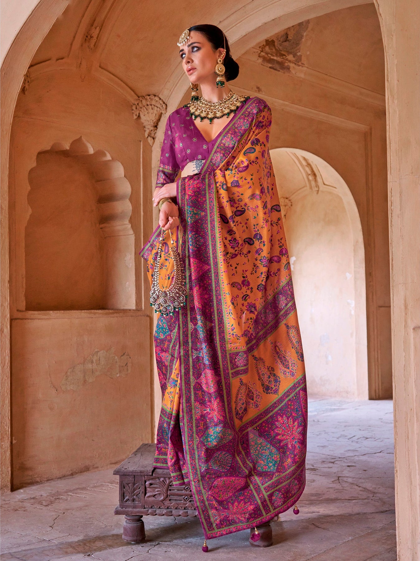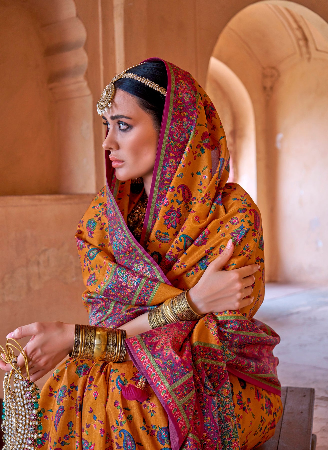 Mustard Yellow Soft Silk Floral and Paisley Printed kashmiri Jamewar Saree