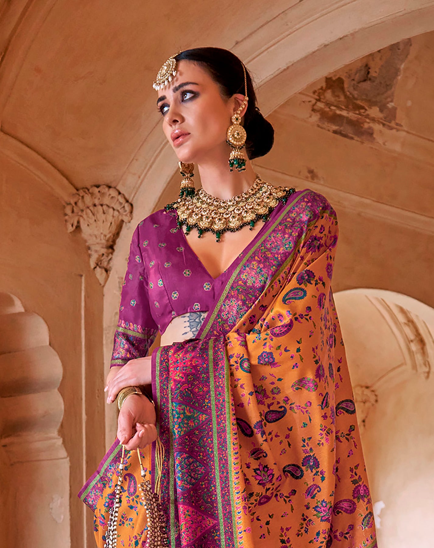 Elevate your ethnic collection with this Mustard Yellow Soft Silk Kashmiri Jamewar Saree. Its floral and paisley prints bring elegance and charm, perfect for weddings, parties, or festive occasions.