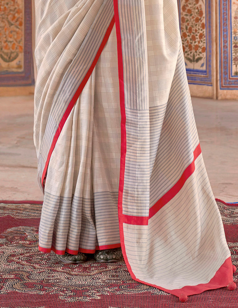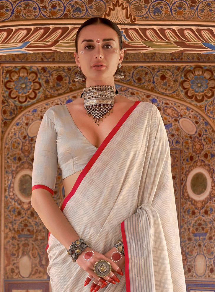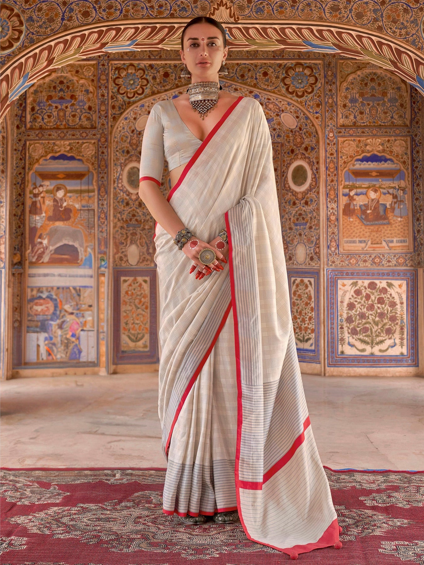 Off White Poly Viscose Silk Checks Kanjeevaram Zari Weaving Saree