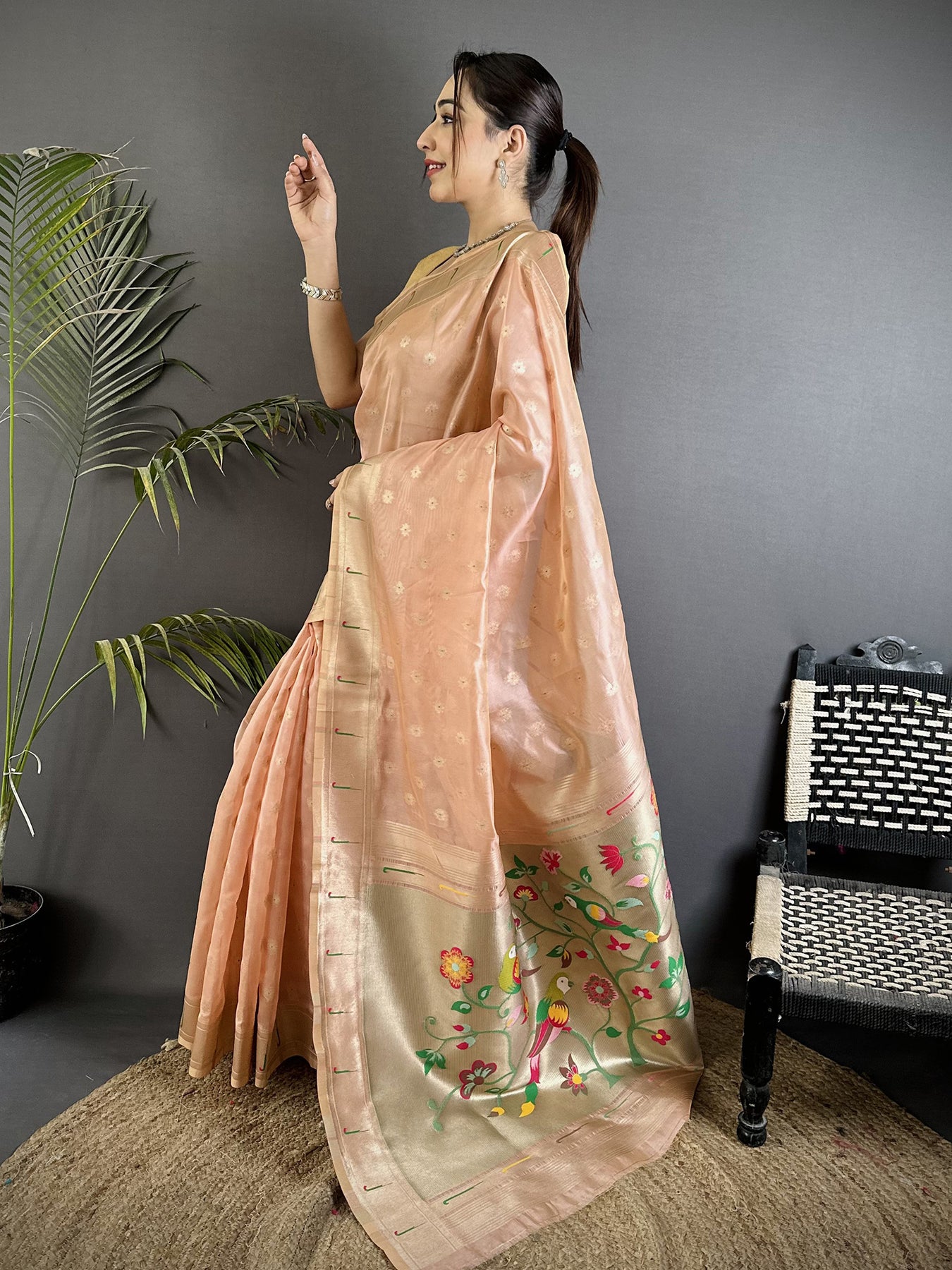 Coral Pink Tissue Parrot & Floral Woven Design Paithani Saree brings timeless Maharashtrian charm to your wardrobe. The soft tissue silk fabric shines with grace and feels light for long festive wear.