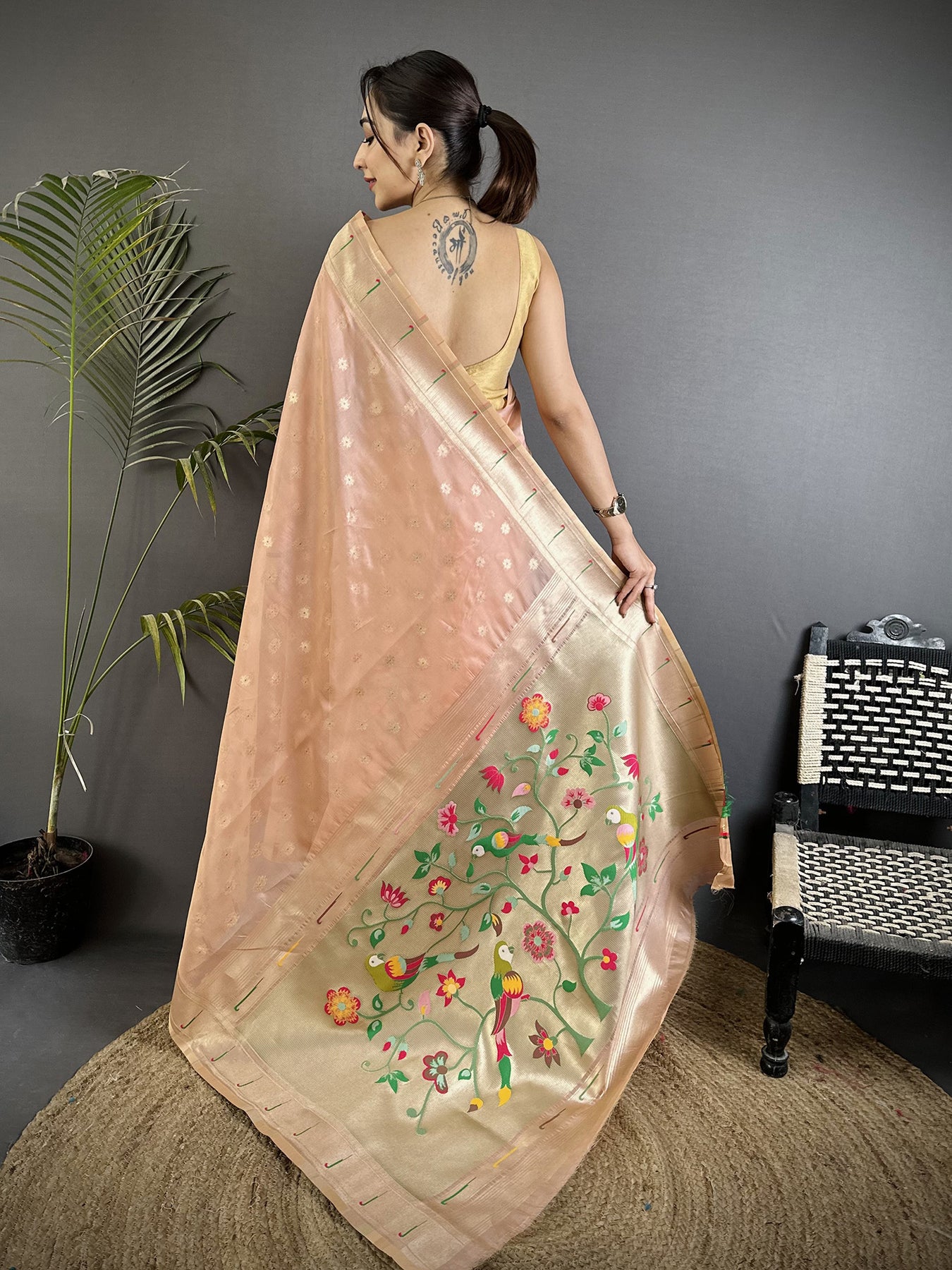 Coral Pink Tissue Parrot & Floral Woven Design Paithani Saree