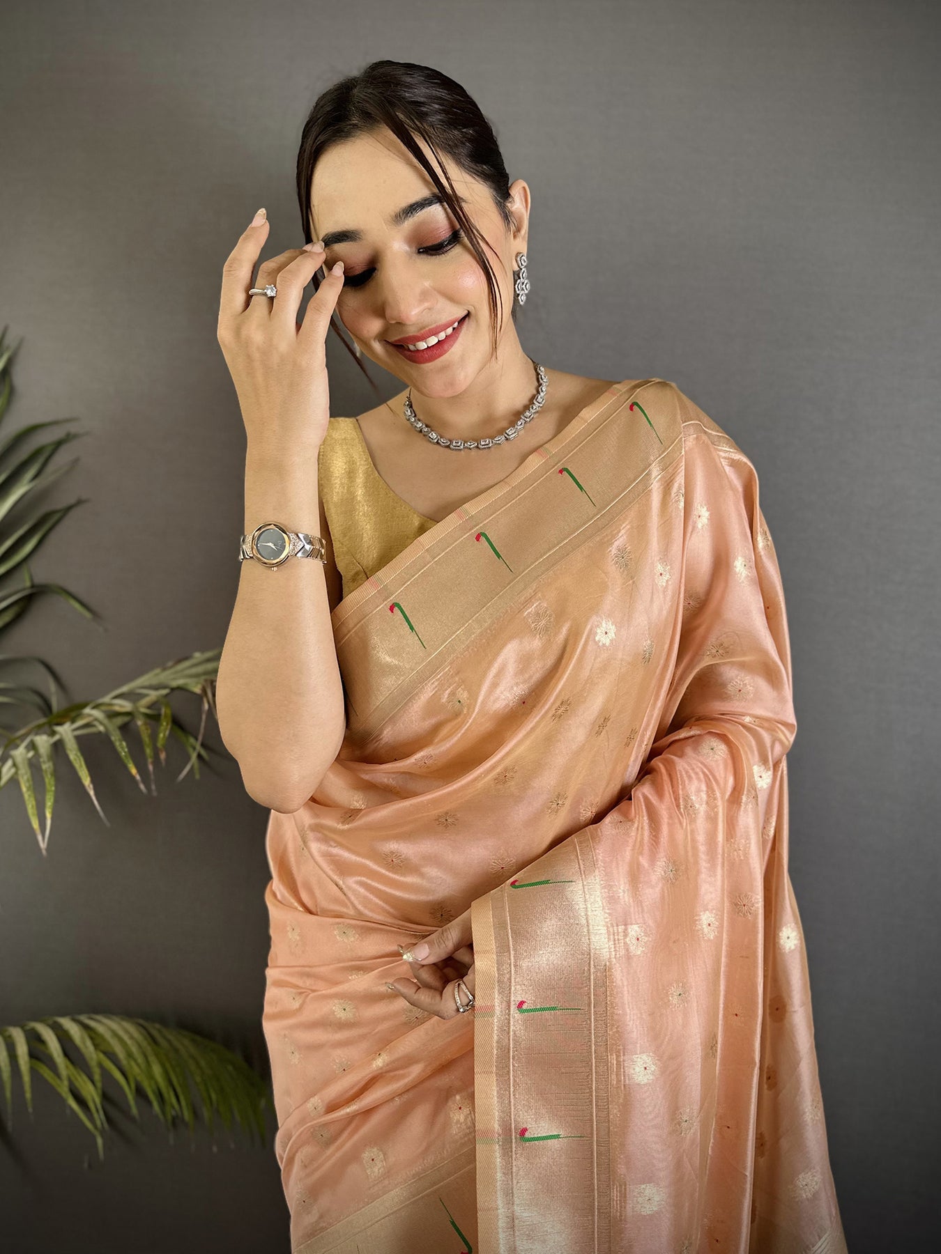 Style this Coral Pink Tissue Paithani Saree with classic gold jewelry for a royal look. Ideal for brides, festivals, and parties, it blends tradition and modern elegance in every drape.