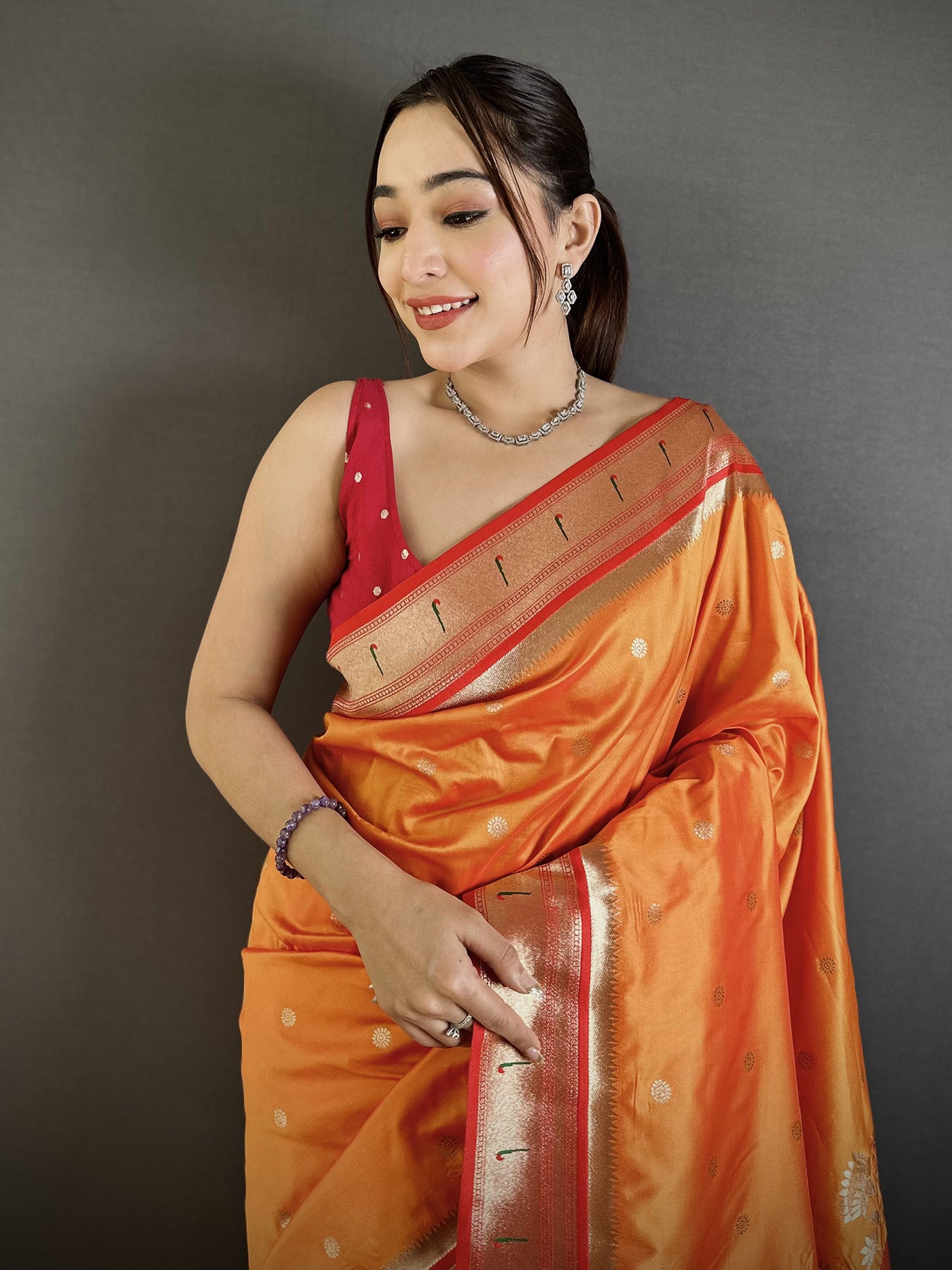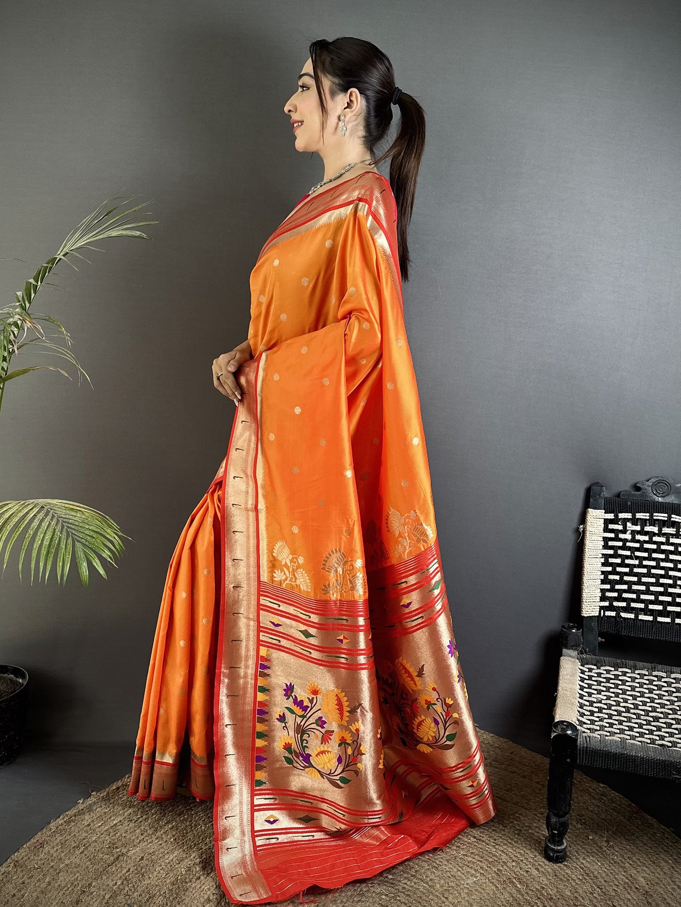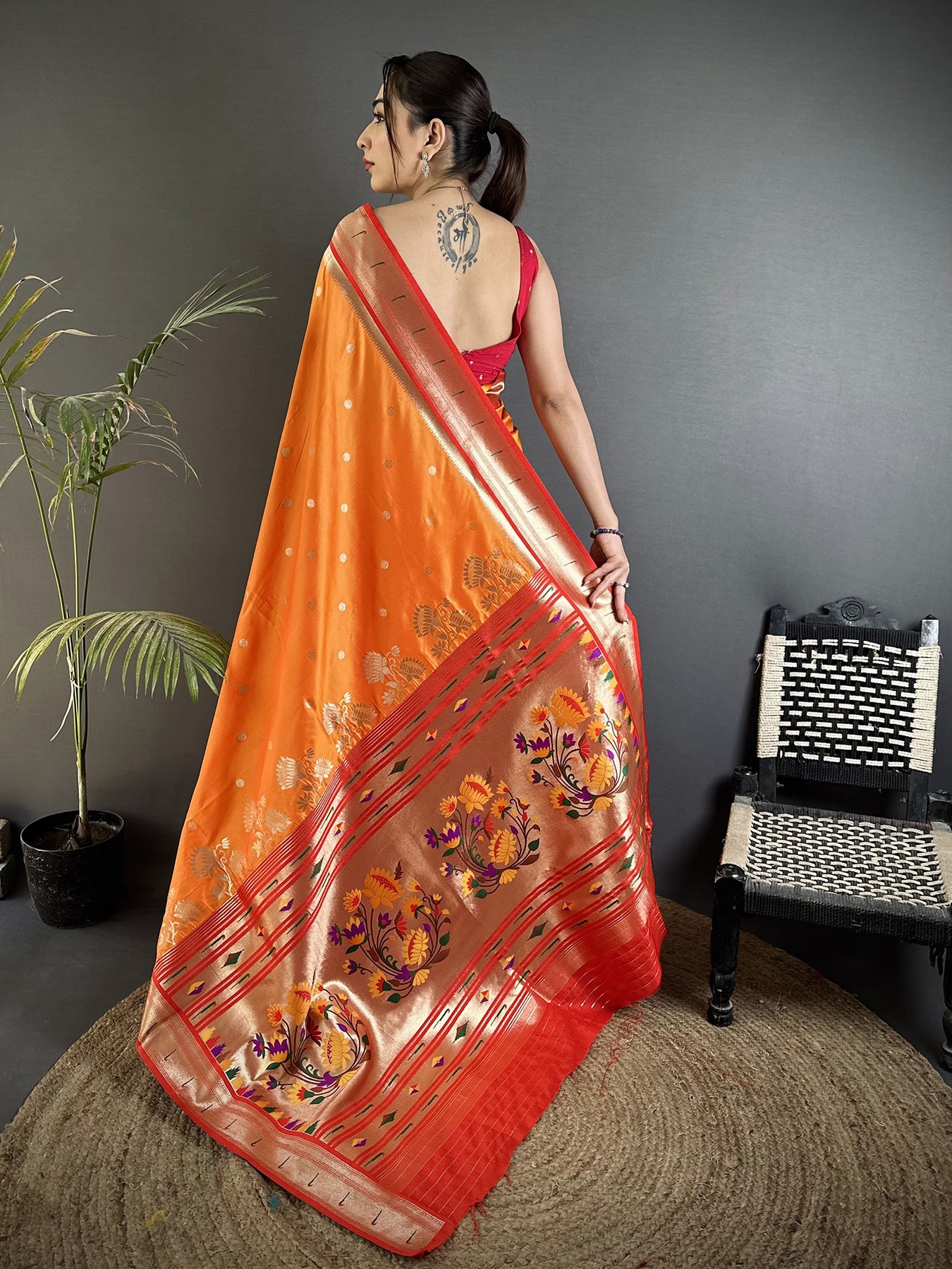 Orange Lichi Silk Floral Motifs Zari Weaving Paithani Saree