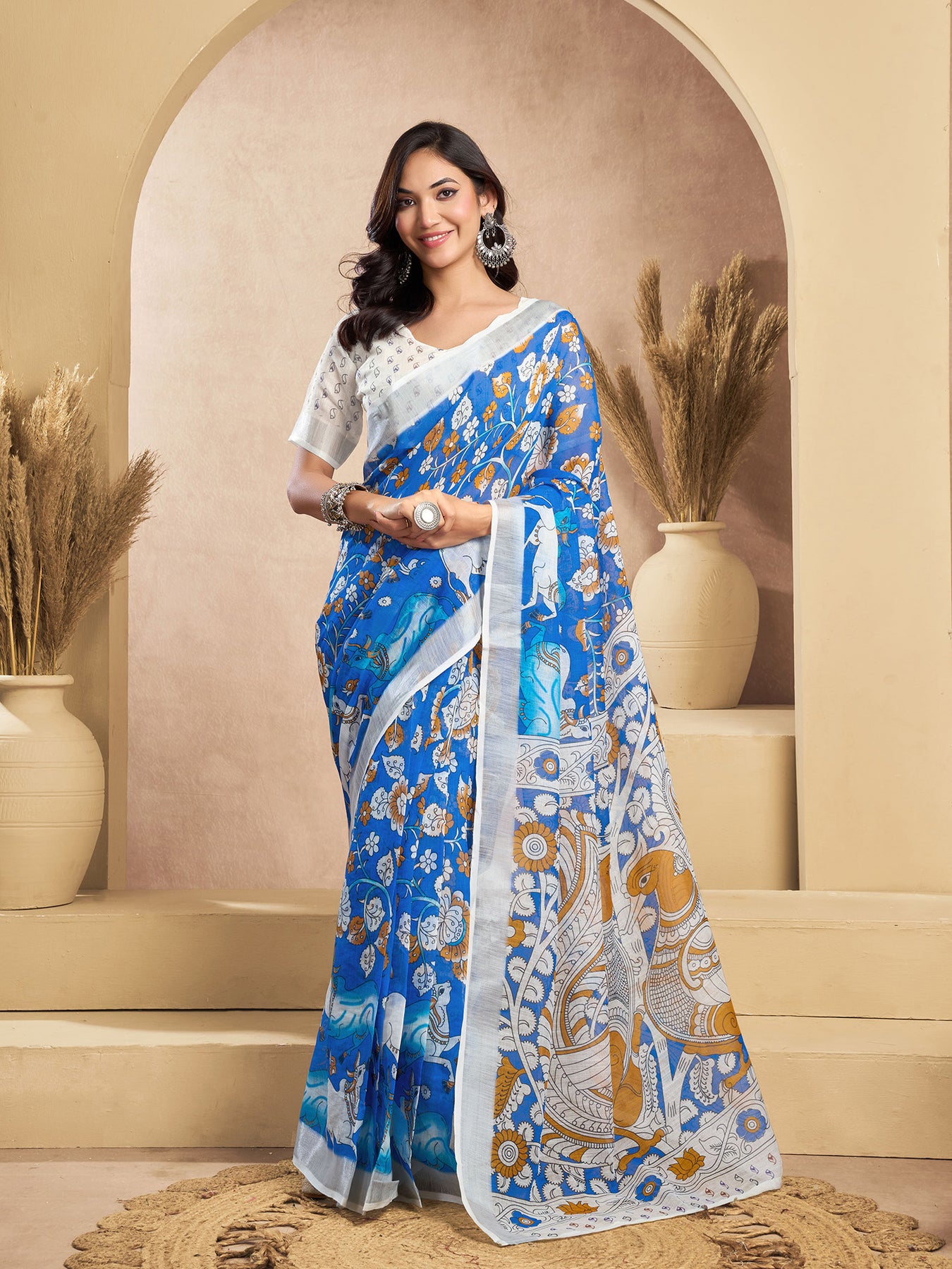 Blue & White Linen Kalamkari Printed Ready To Wear Saree