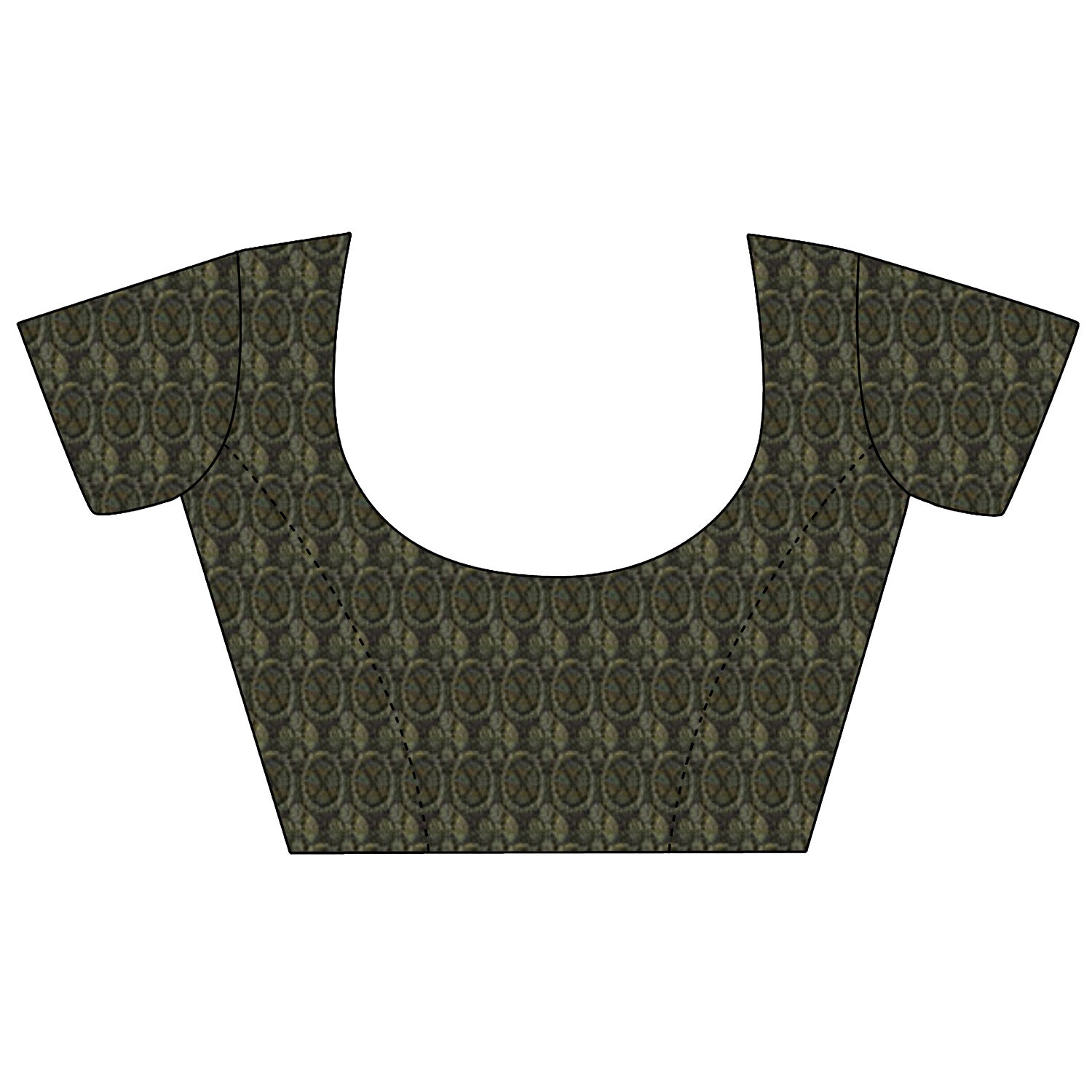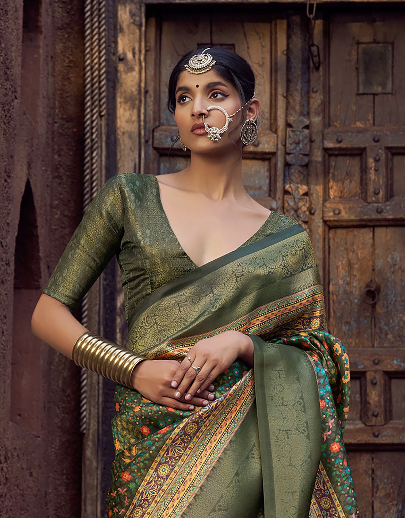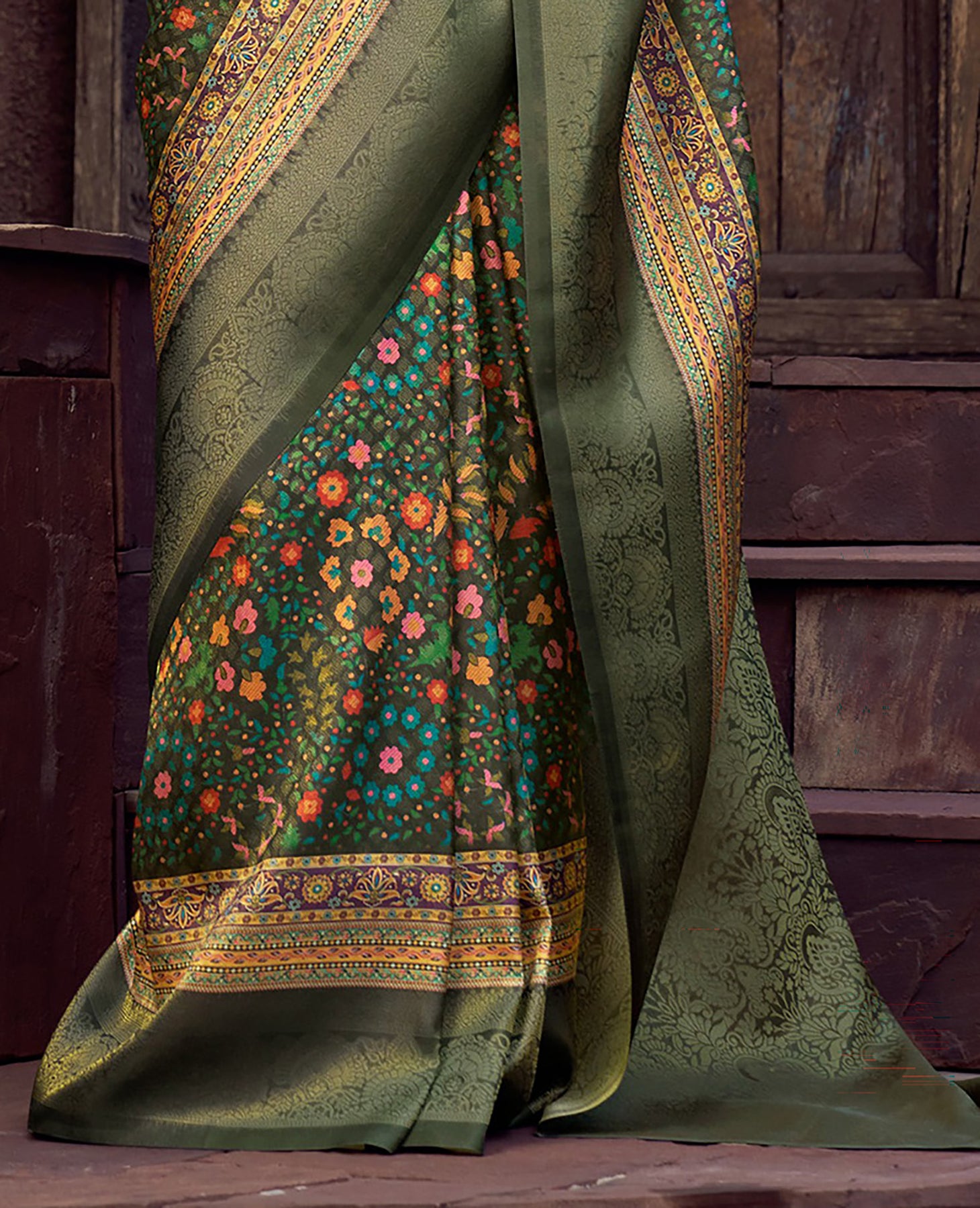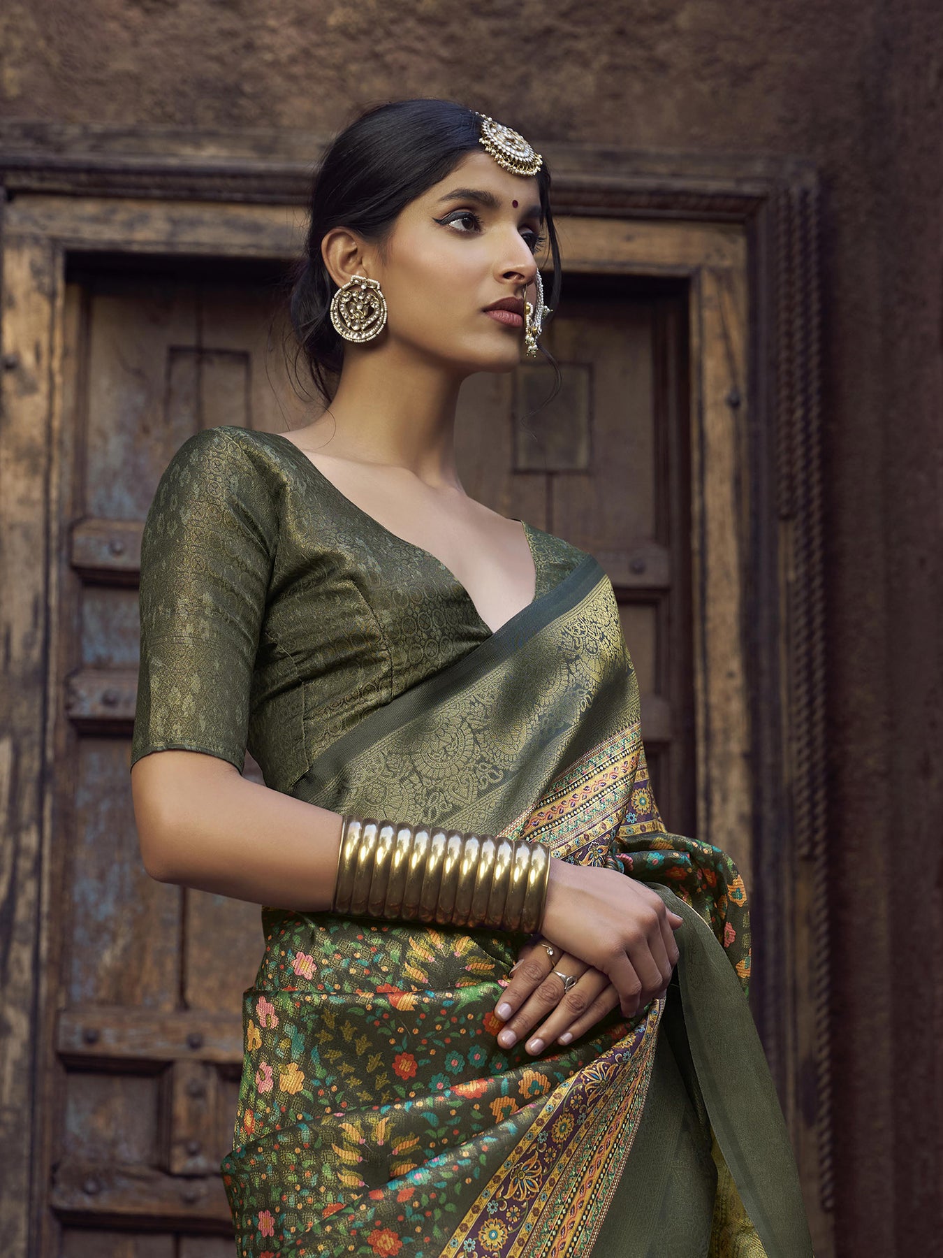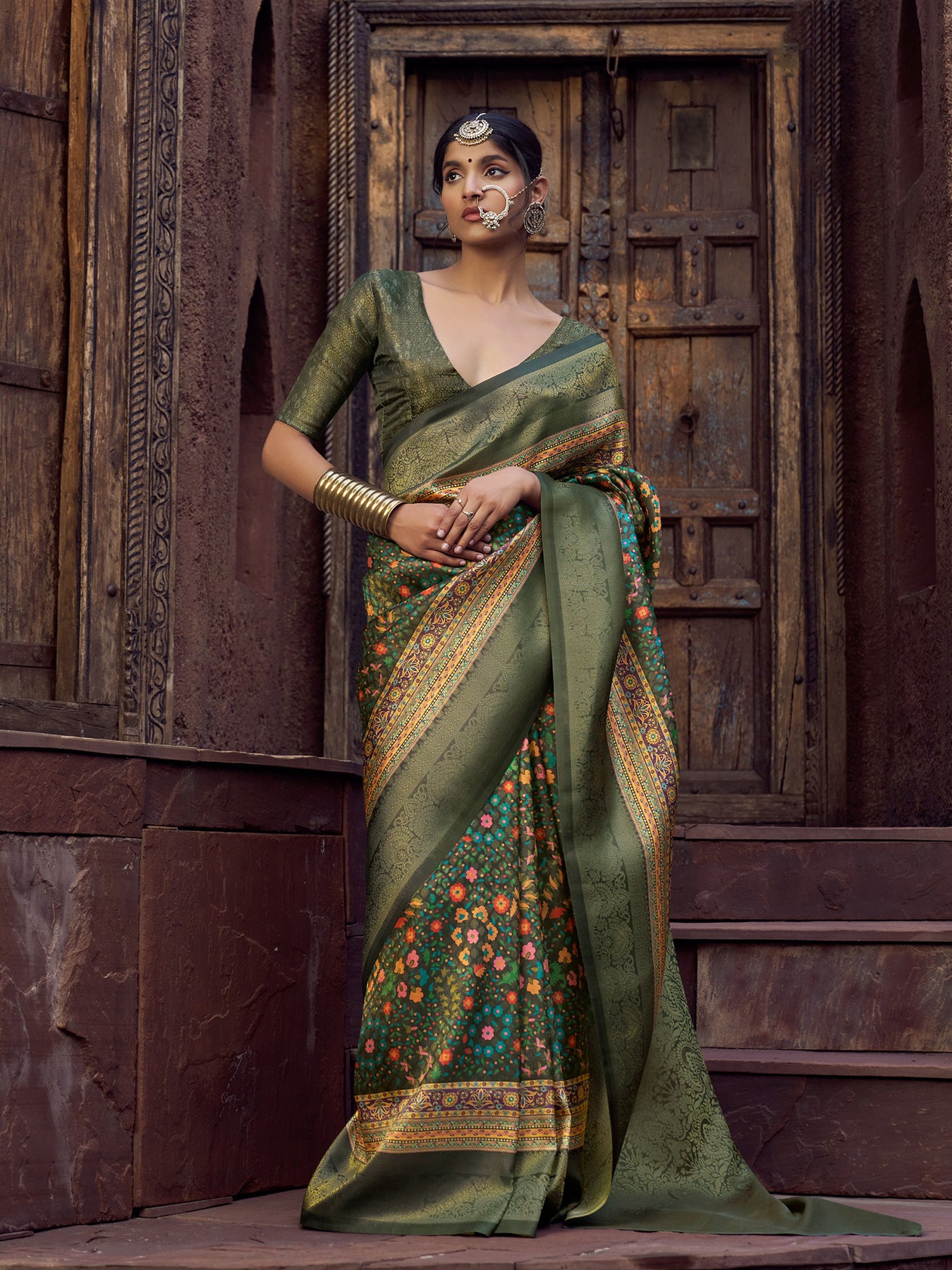 Olive Green Jacquard P V Silk Digital Floral Print Zari Weaving Bollywood Saree