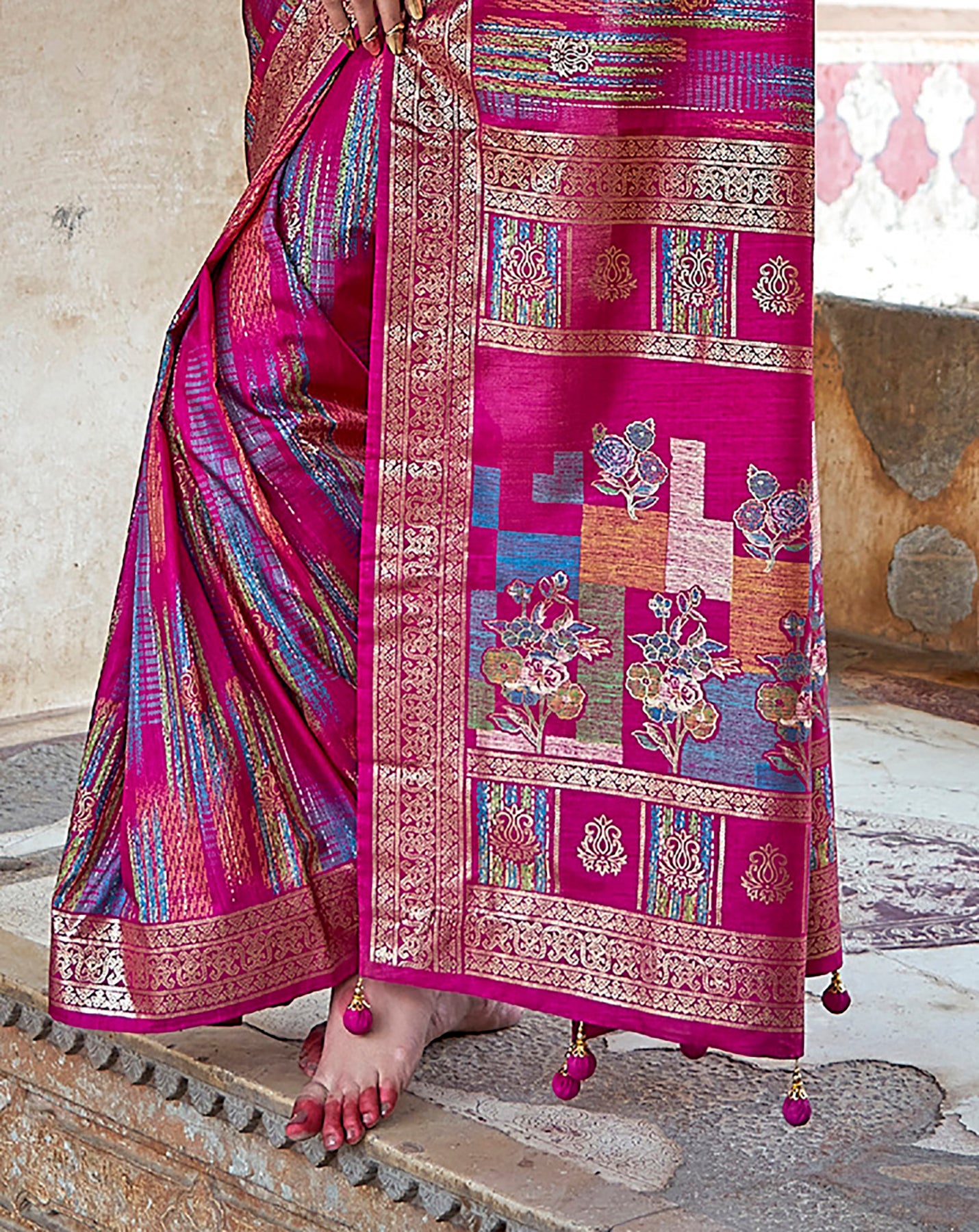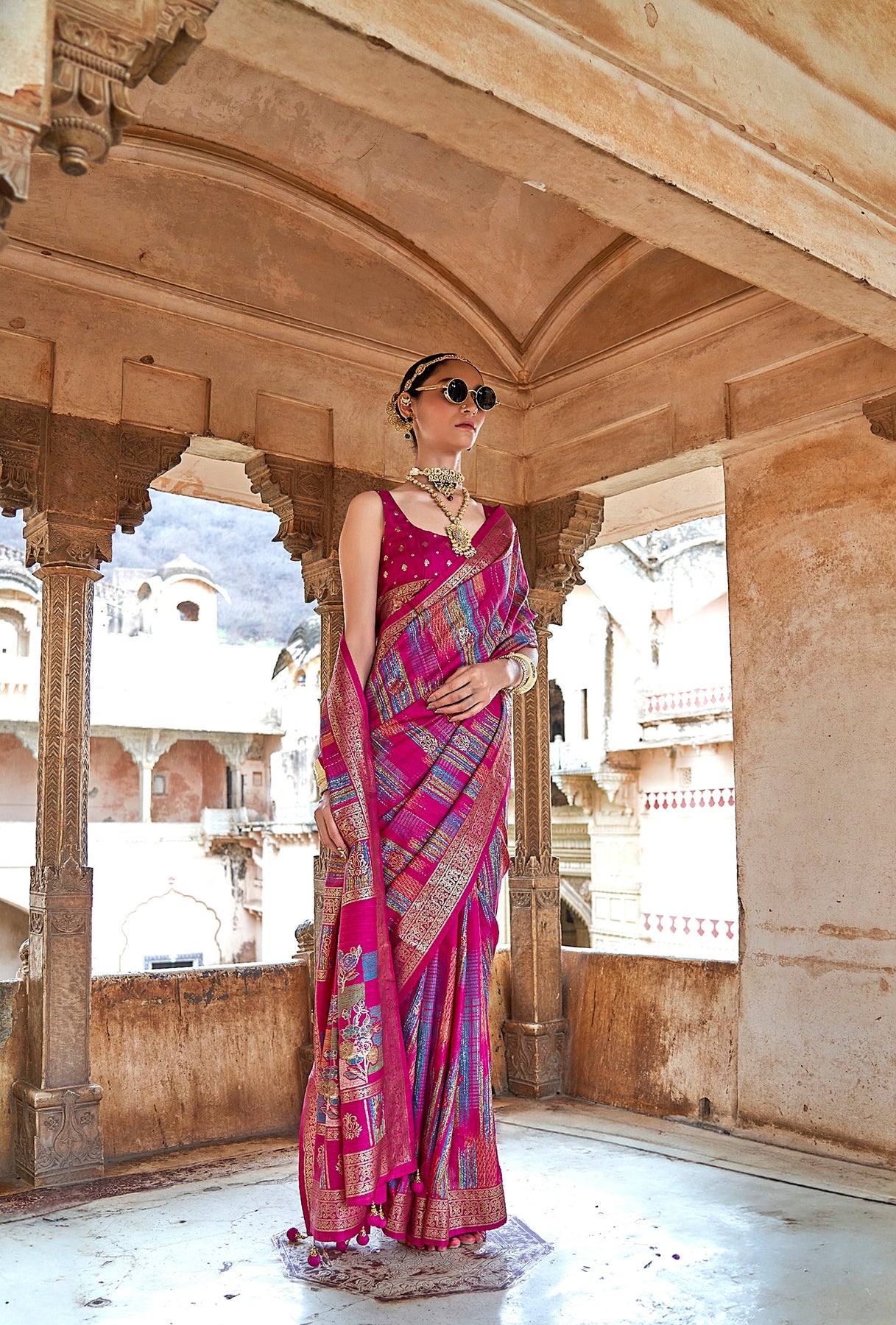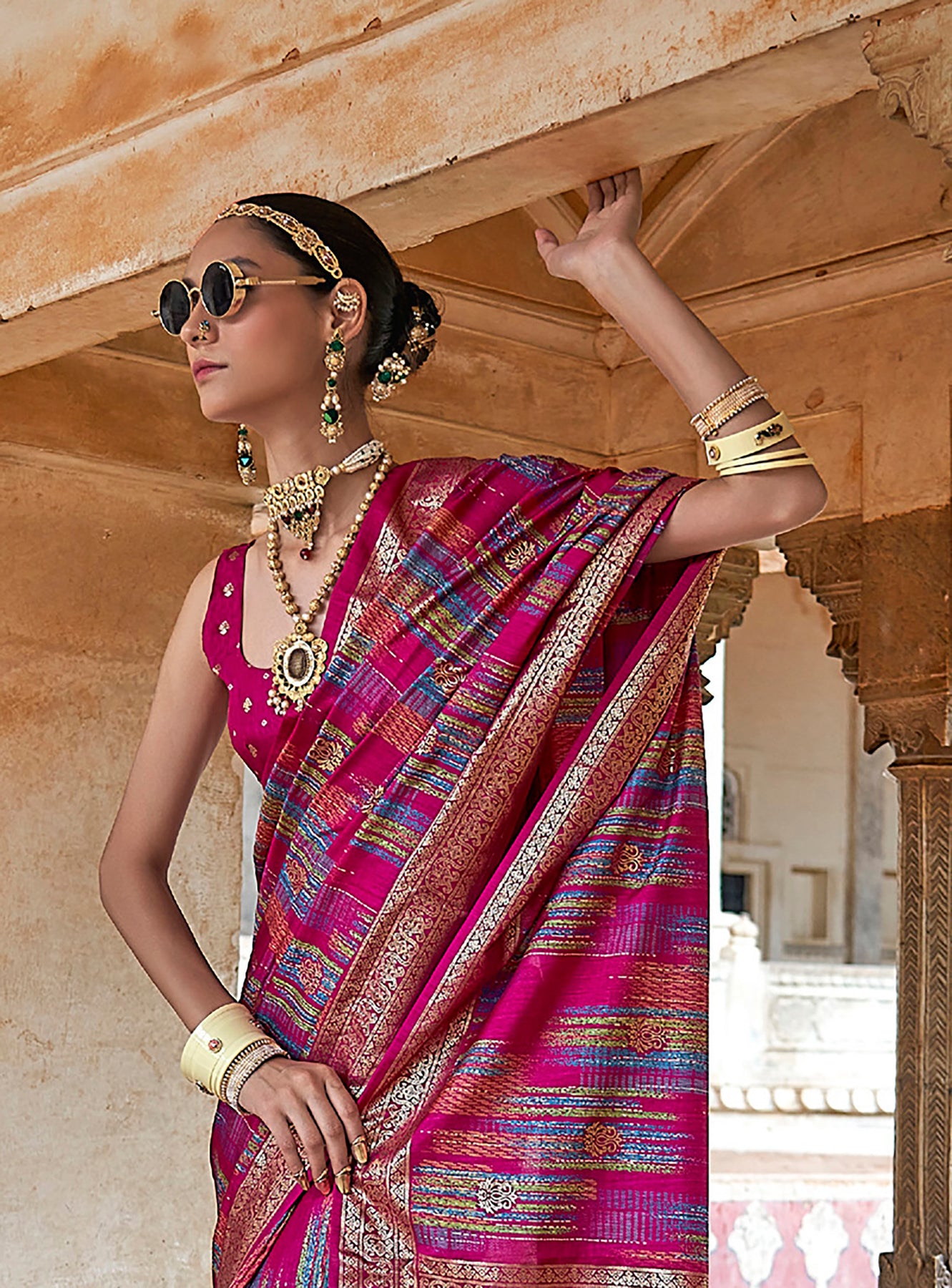 Add elegance to your ethnic collection with this Pink Soft Silk Woven Patola Printed Saree. Its soft pink shade and intricate patola patterns make it perfect for weddings, festivals, and celebrations.