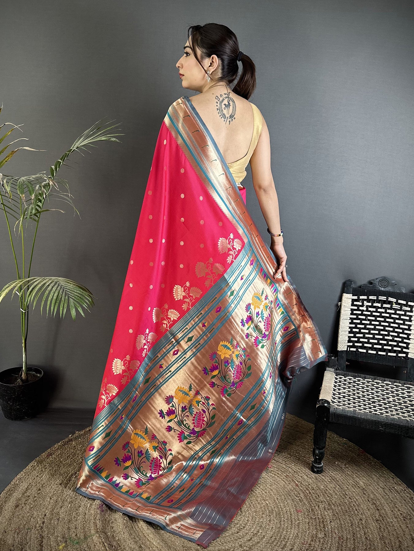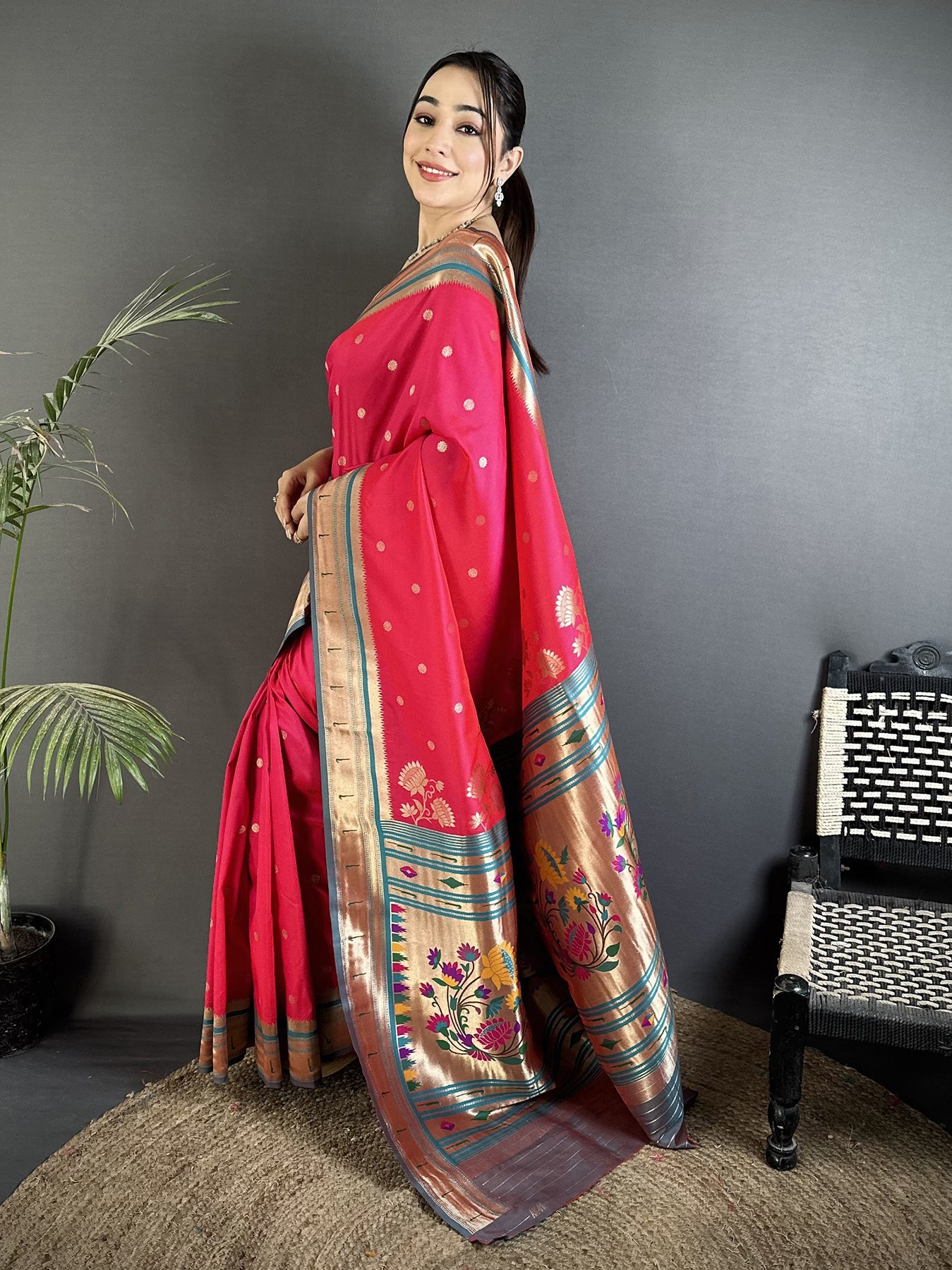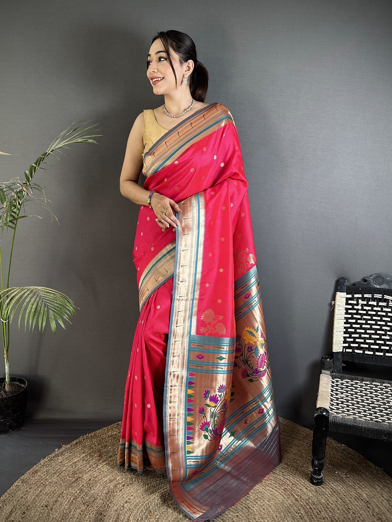 Step into elegance with this Rani Pink Lichi Silk Floral Motifs Zari Weaving Paithani Saree. Made from smooth lichi silk, it feels soft and rich. The bright rani pink shade adds charm and makes you stand out at every event.