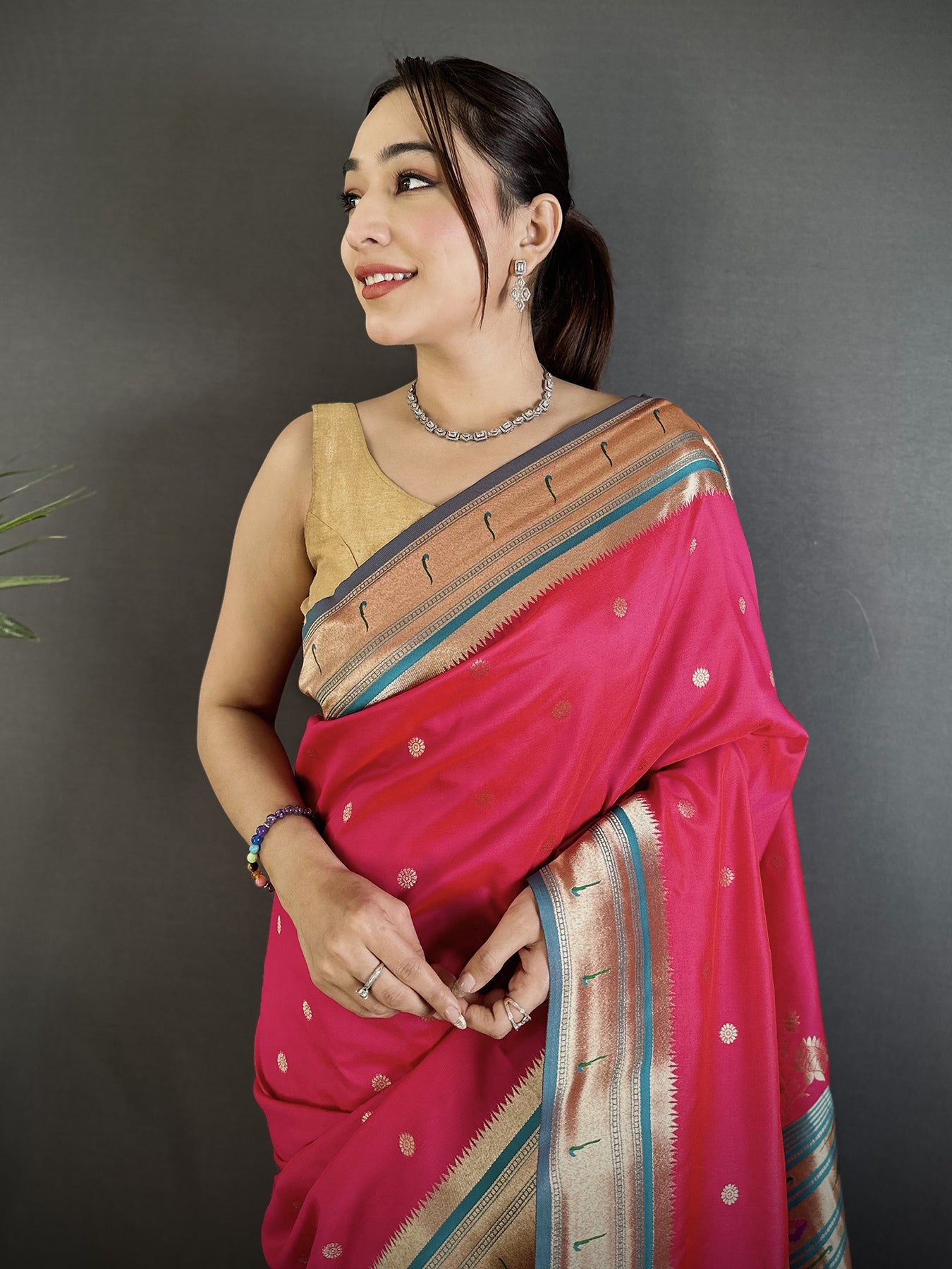 This silk saree is lightweight, easy to drape, and comfortable for long hours. Pair it with classic jewelry for a complete look. Buy this Rani Pink Paithani saree online to upgrade your ethnic wardrobe with timeless beauty.
