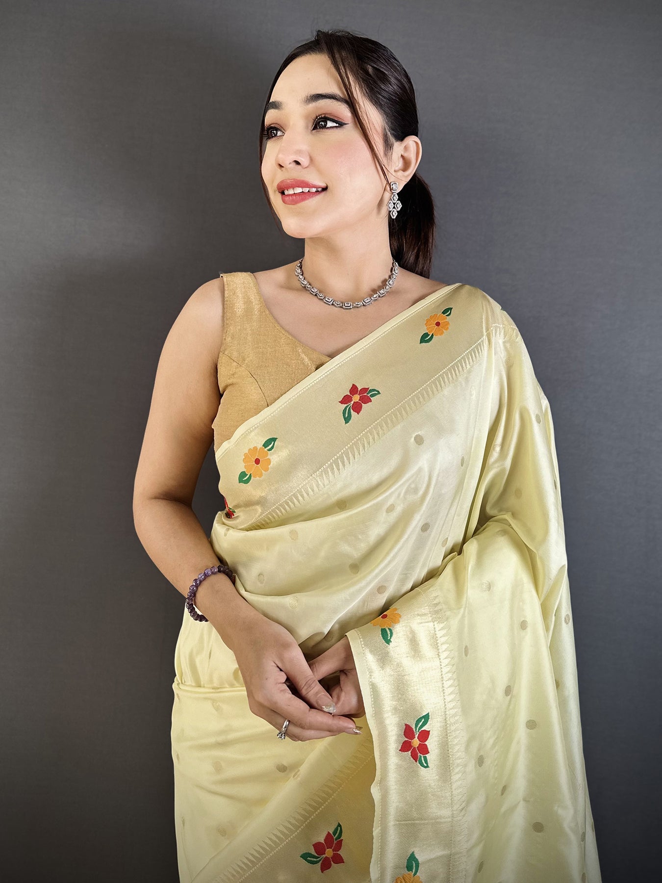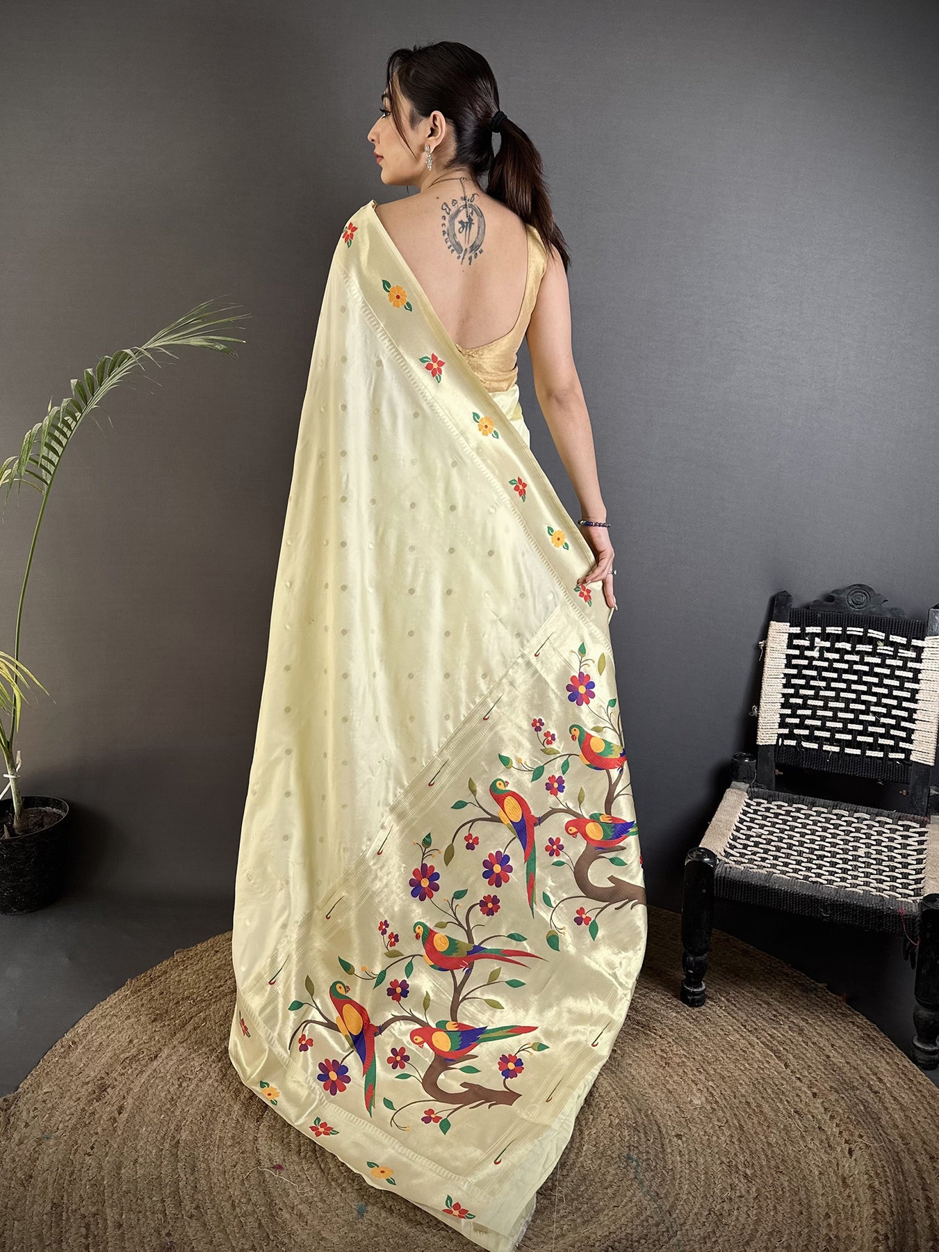 Cream Lichi Silk Parrot & Floral Woven Design Zari Weaving Paithani Saree