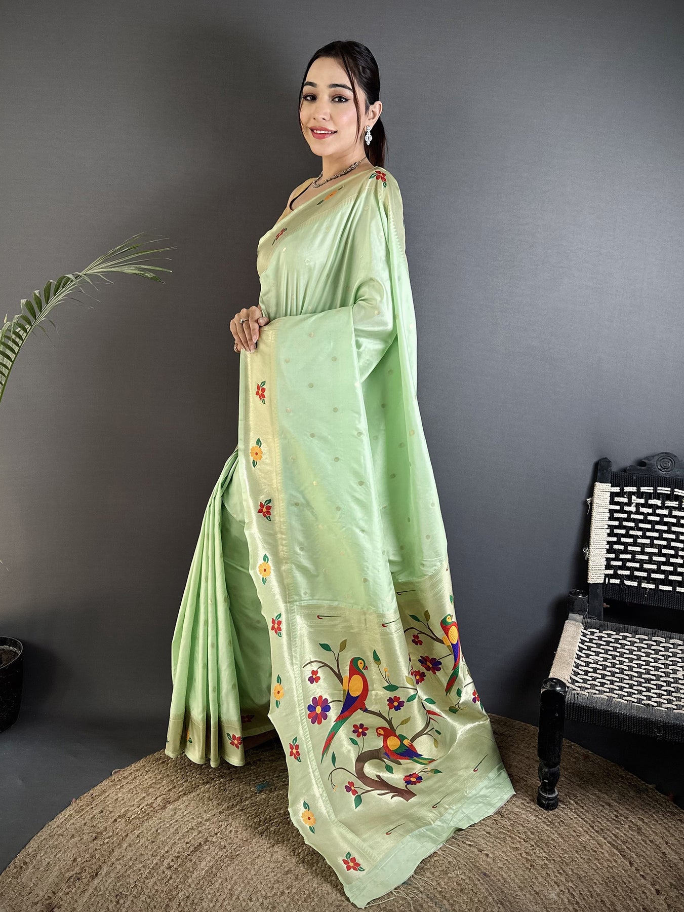 Mint Green Lichi Silk Parrot & Floral Woven Design Zari Weaving Paithani Saree