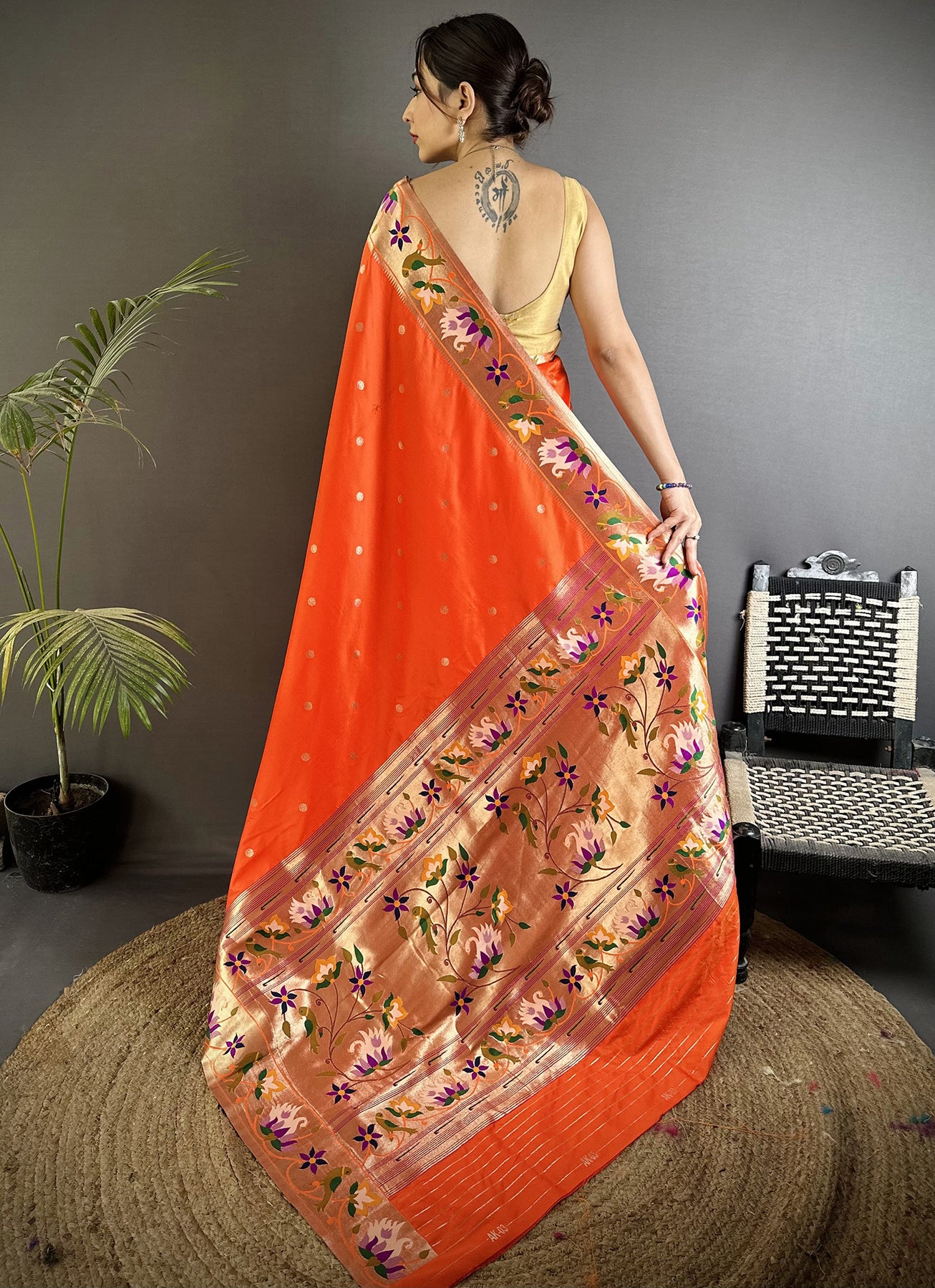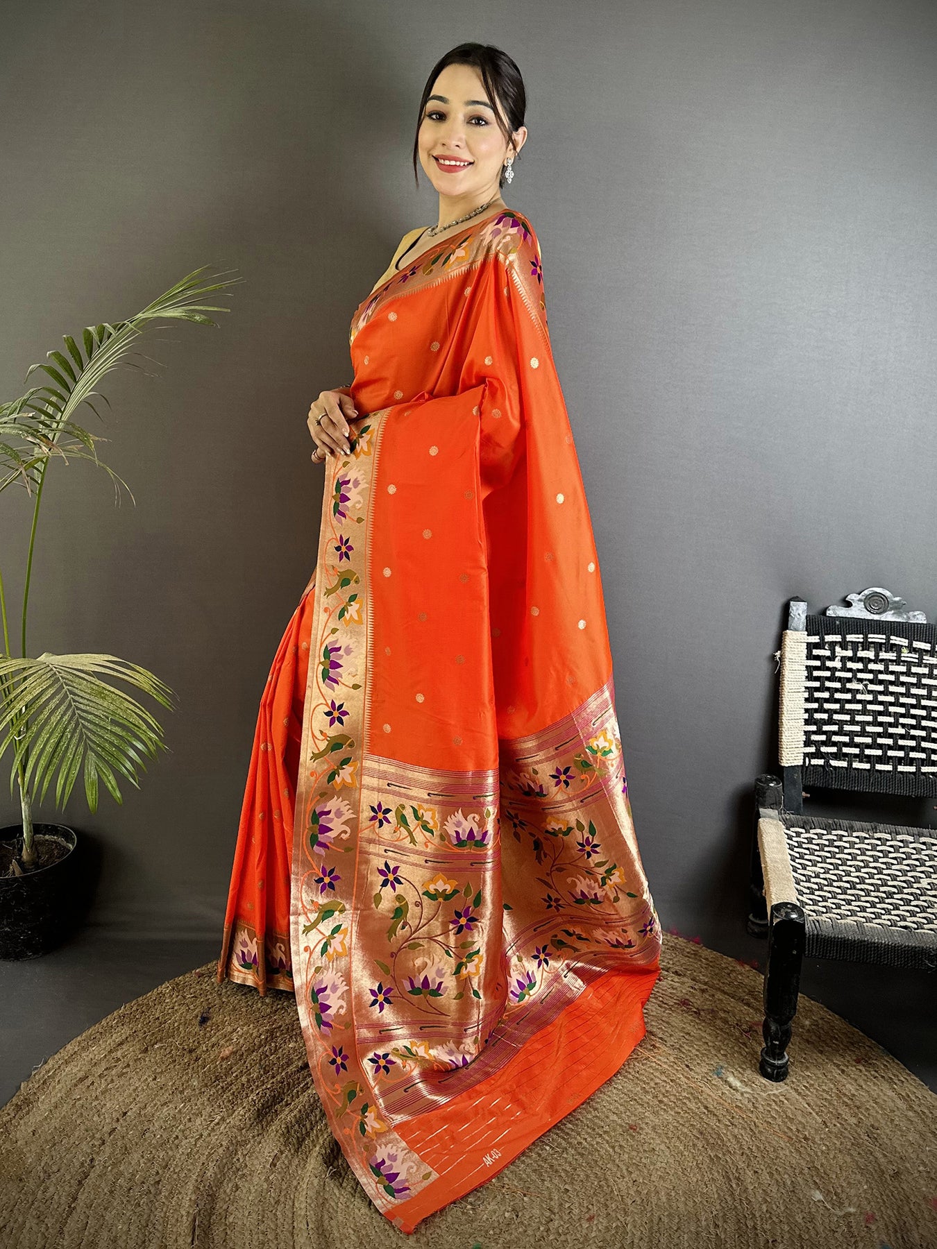 Orange Lichi Silk Floral & Meena Weaving Zari Worked Paithani Saree