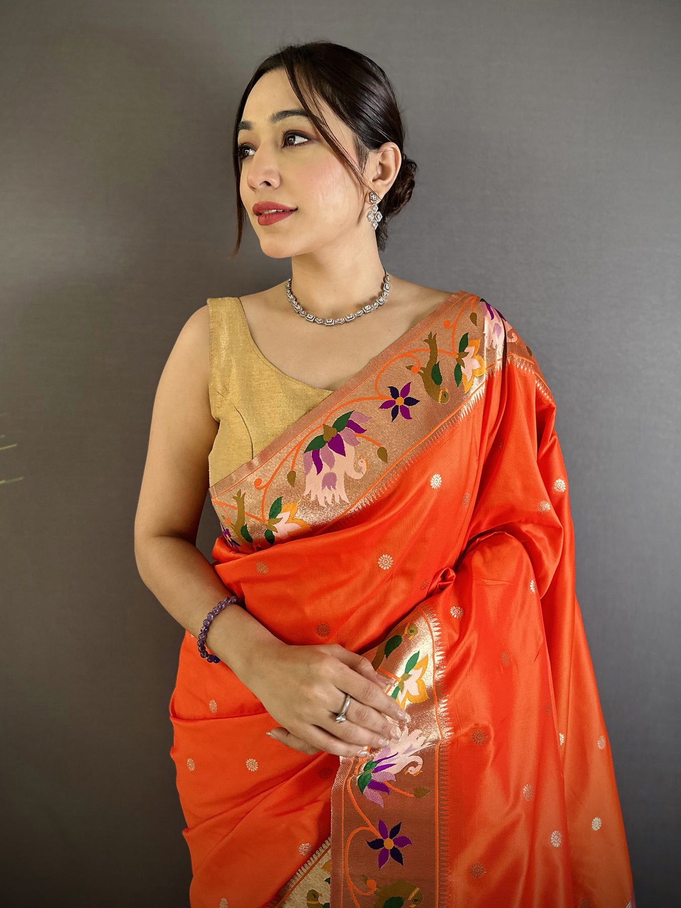 Brighten every celebration with this Orange Lichi Silk Floral & Meena Weaving Zari Worked Paithani Saree. Crafted from soft lichi silk, it offers a smooth texture, rich shine, and a graceful drape for festive wear.Elegant floral designs with detailed Meena weaving add depth and vibrant charm. Fine zari work enhances its royal appeal, making this Paithani saree a perfect choice for weddings, parties, and traditional events.Lightweight yet luxurious, this orange Paithani saree ensures comfort all day. Style it with classic jewelry to create a stunning ethnic look that blends heritage beauty with modern elegance effortlessly.
