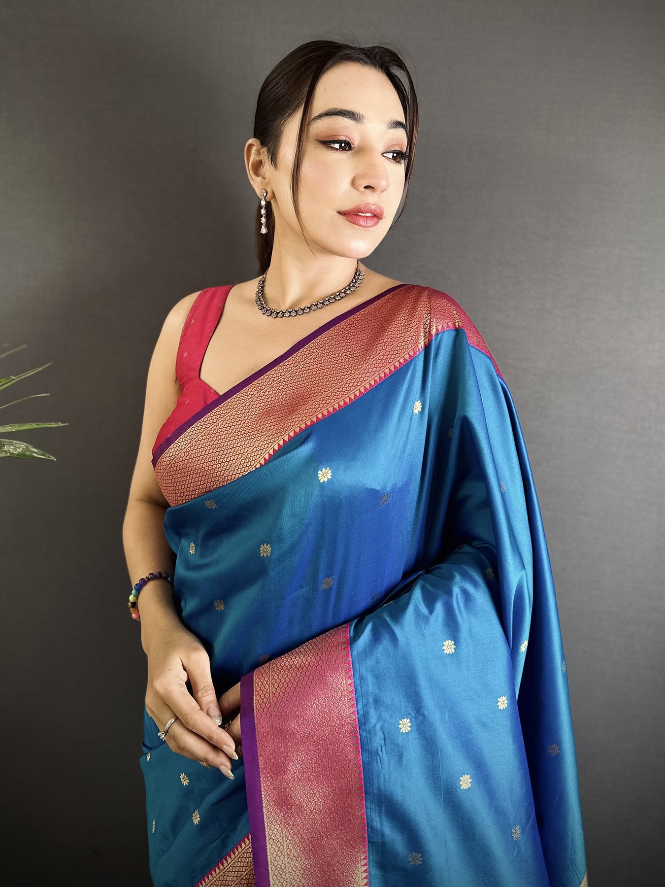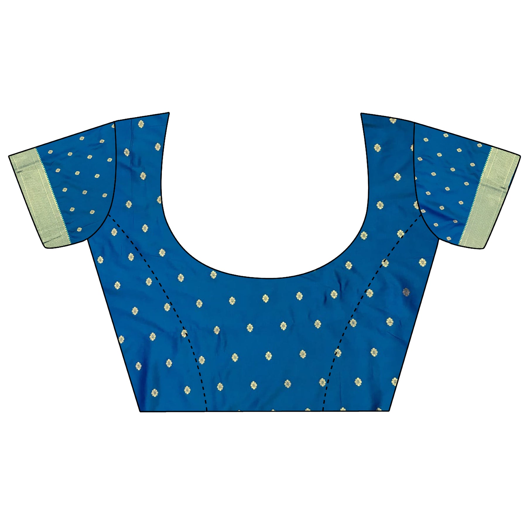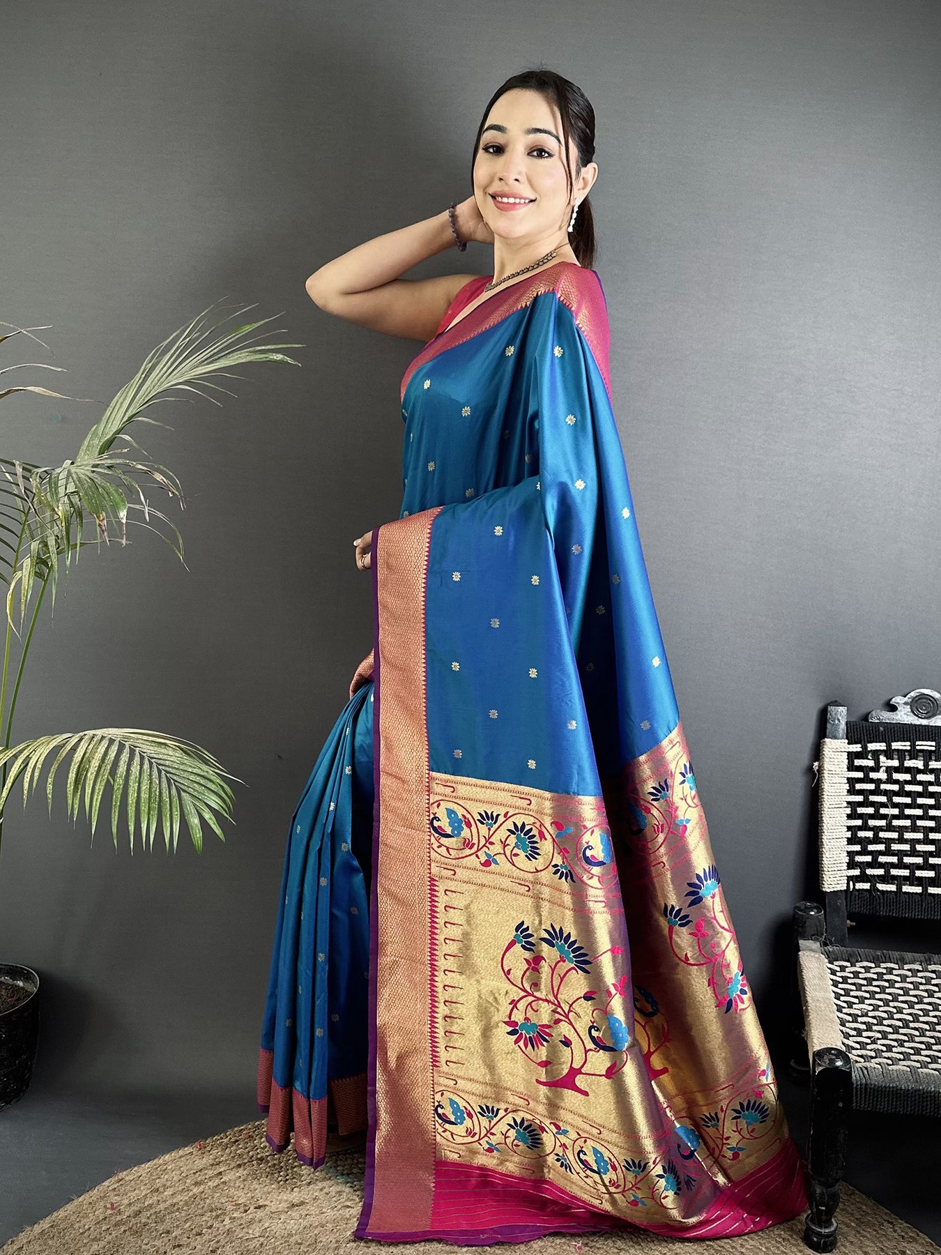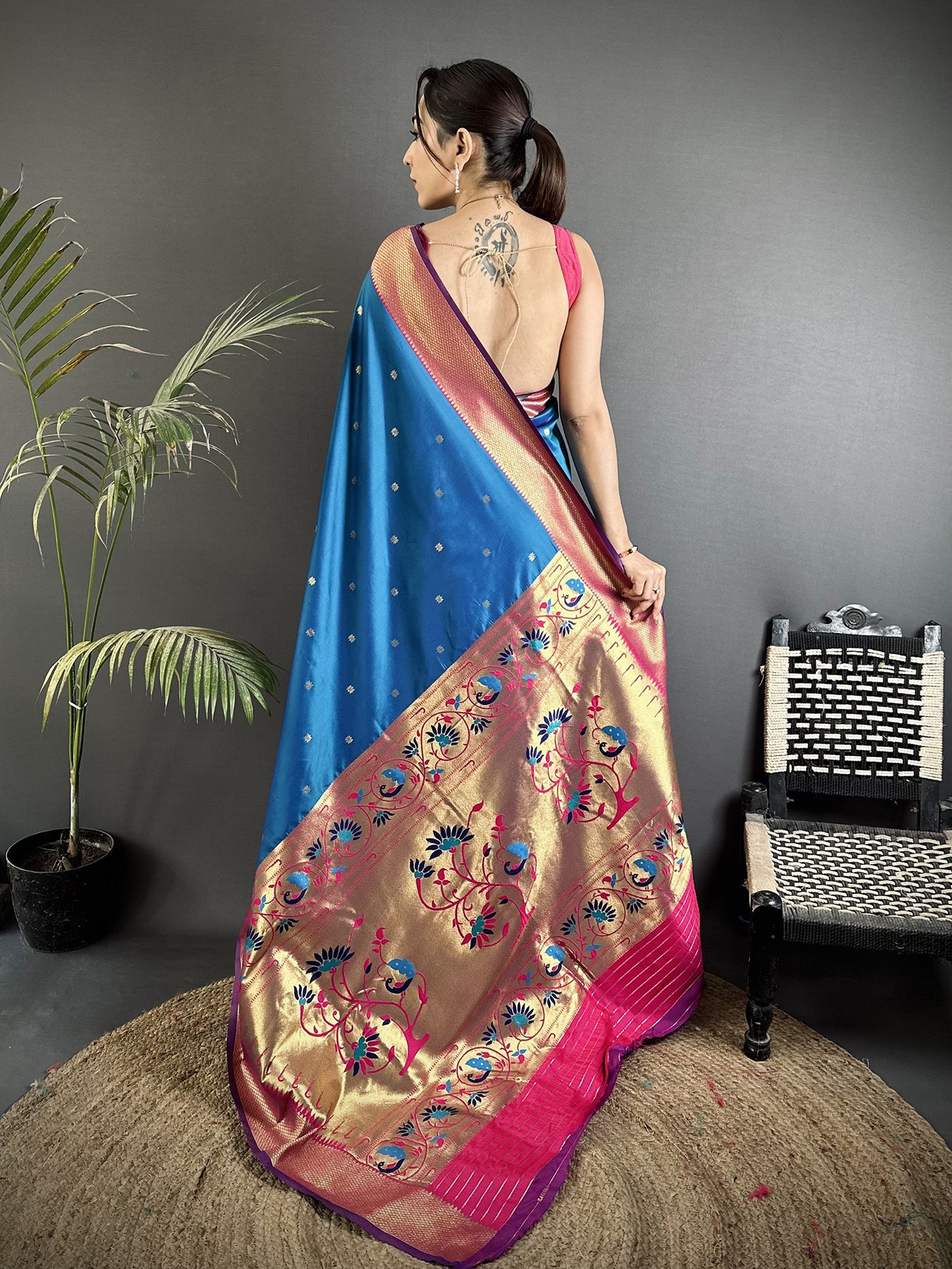 Rama Blue Lichi Silk Peacock Motifs Zari weaving Paithani Saree