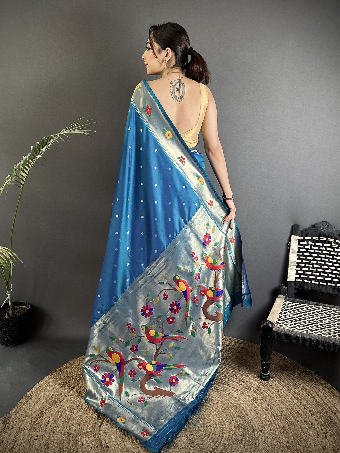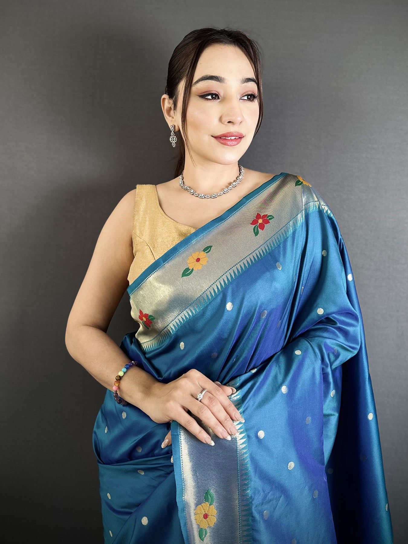 Adorn yourself in this Teal Blue Lichi Silk Paithani Saree, featuring elegant parrot and floral woven designs. The intricate zari work adds a royal touch, perfect for weddings and festive occasions.Handwoven with care, this Paithani saree blends tradition and style. Its vibrant teal blue shade and soft silk fabric make it ideal for ceremonies, parties, and cultural celebrations, offering effortless elegance.The detailed zari weaving enhances durability and charm. This saree celebrates Indian craftsmanship, making it a perfect gift or statement piece while keeping comfort and grace at the forefront.