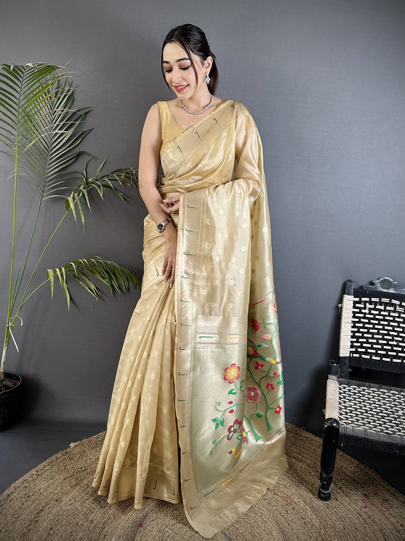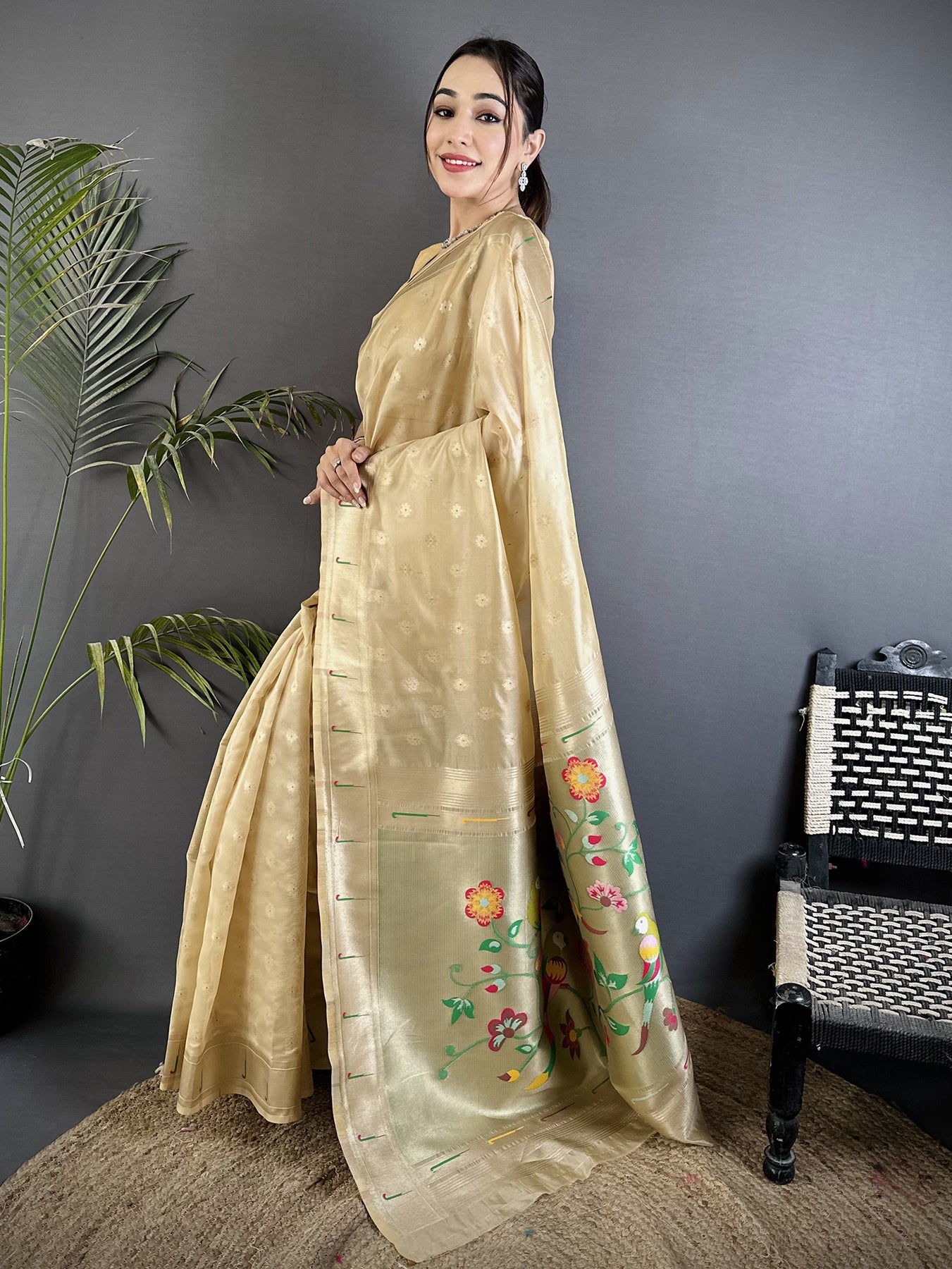 Beige Tissue Parrot & Floral Woven Design Paithani Saree