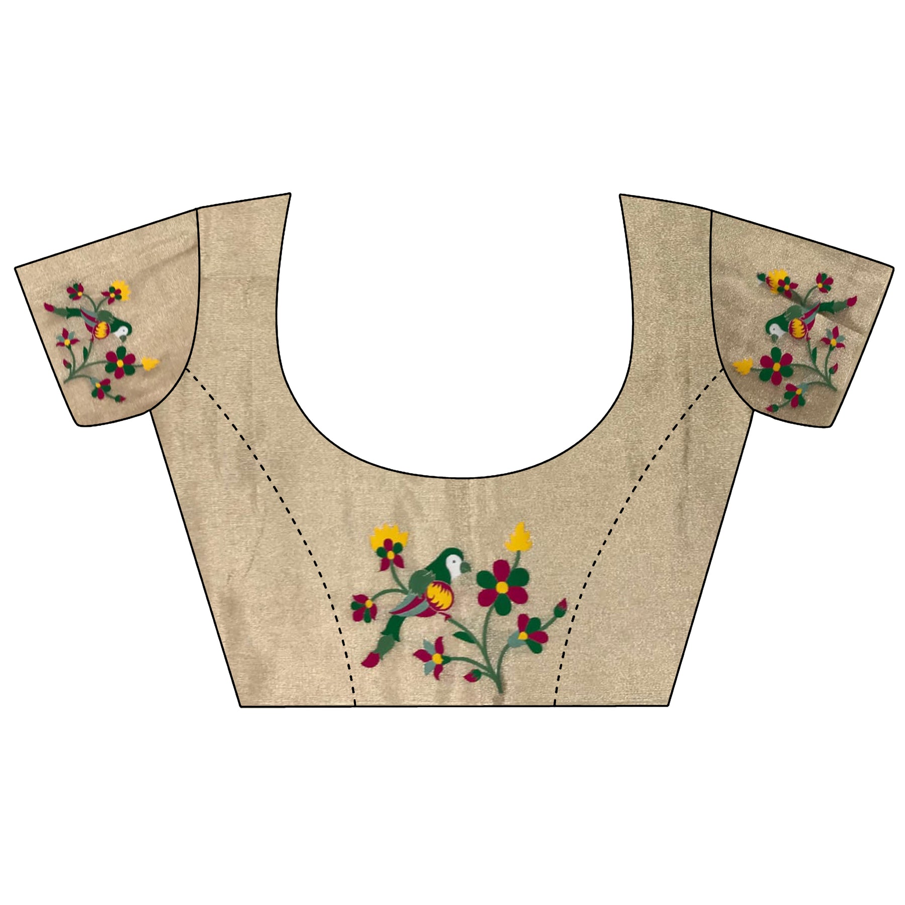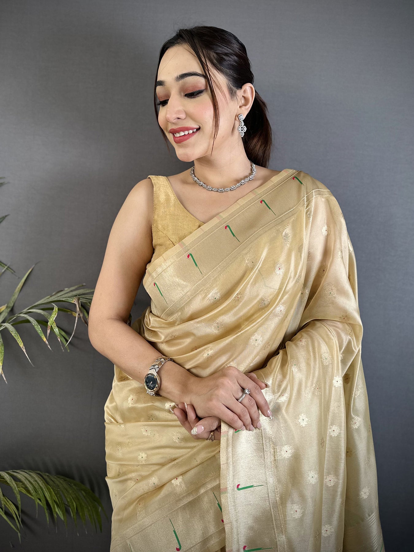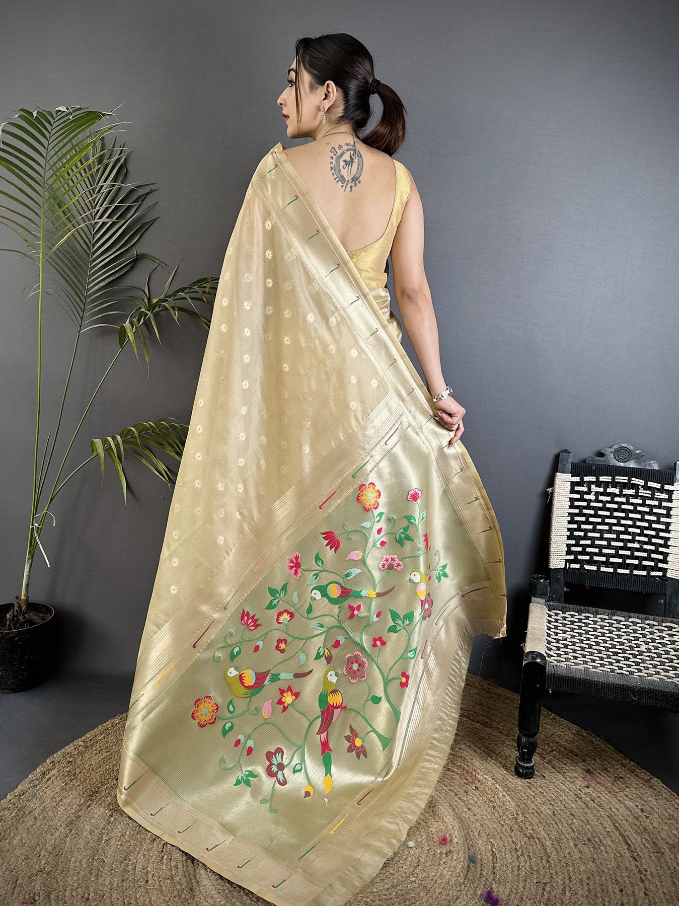 Elevate your ethnic style with this Beige Tissue Parrot & Floral Woven Design Paithani Saree. The soft tissue silk shines with every move, while colorful parrot and floral motifs reflect rich Indian tradition and timeless beauty.