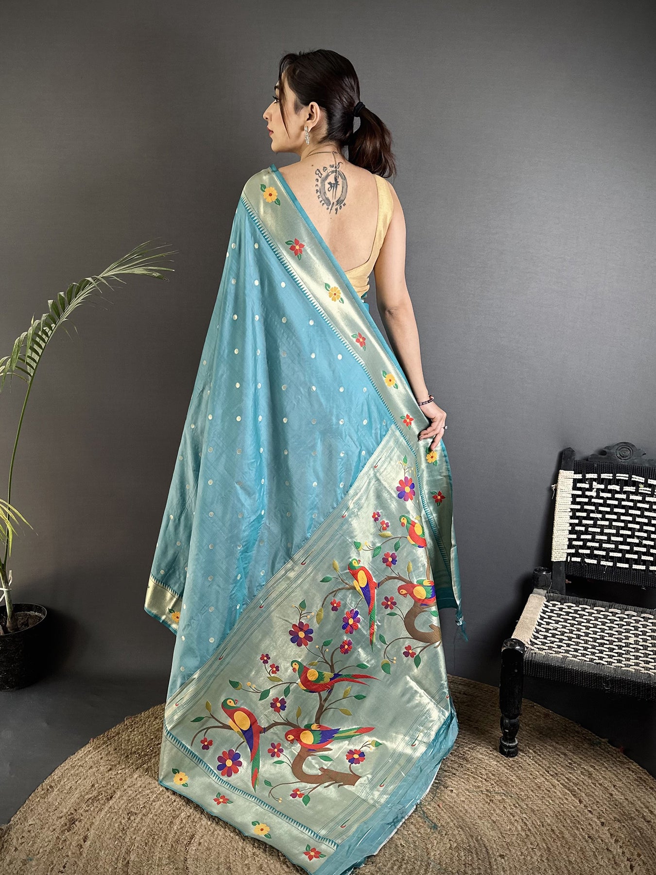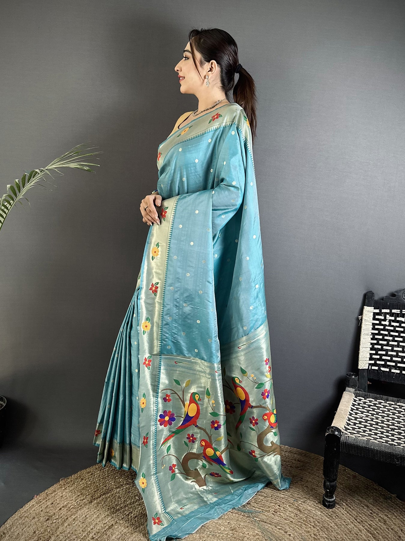 Light Blue Lichi Silk Parrot & Floral Woven Design Zari Weaving Paithani Saree