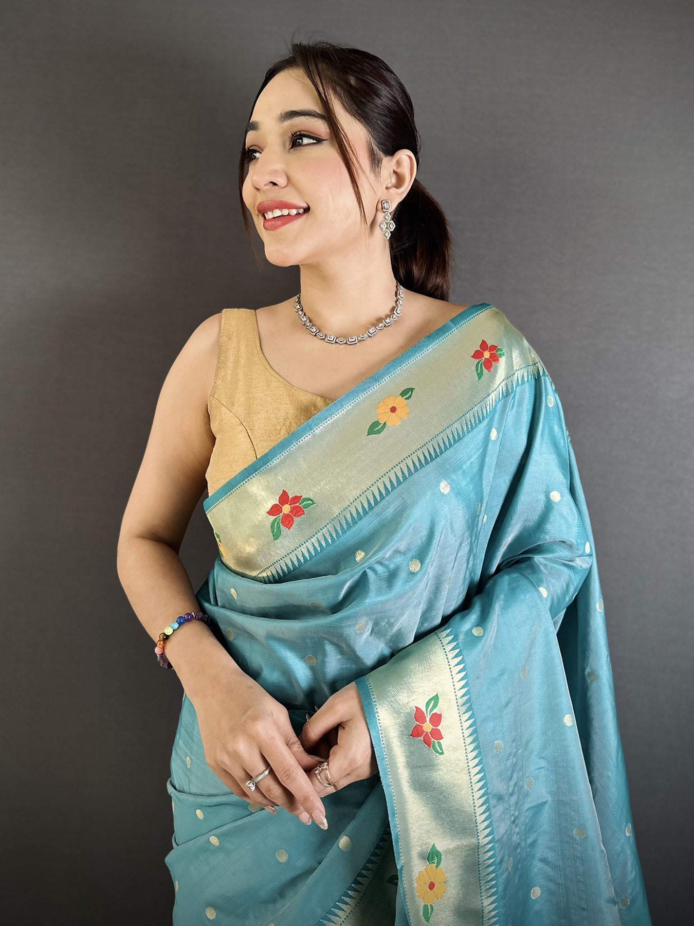 Ideal for gifting or festive wear, the vibrant light blue shade with intricate motifs enhances your wardrobe. Celebrate heritage and elegance with this classic Paithani saree that radiates charm.
