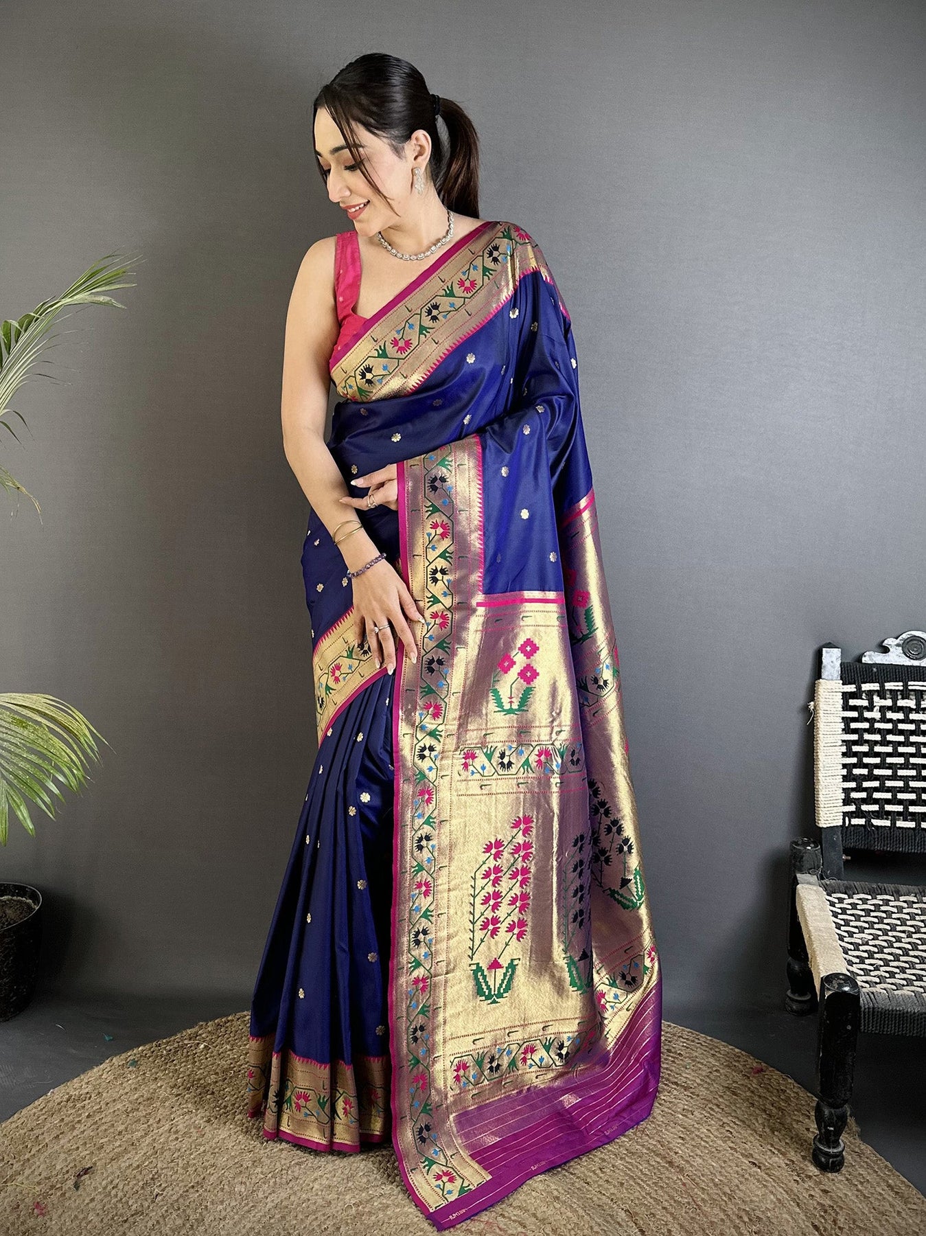 Add elegance to your wardrobe with this Royal Blue Lichi Silk Paithani Saree, featuring intricate Ikkat weaving and delicate floral motifs with zari work. Perfect for weddings and festive occasions.