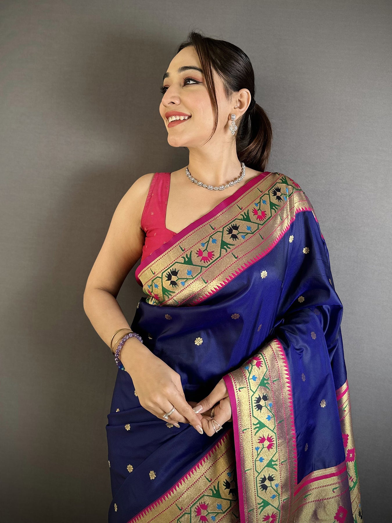 Pair this floral Ikkat Paithani with gold jewelry for a sophisticated ethnic look. Its lightweight drape and vibrant hue make it perfect for daytime functions, evening parties, and cultural ceremonies.