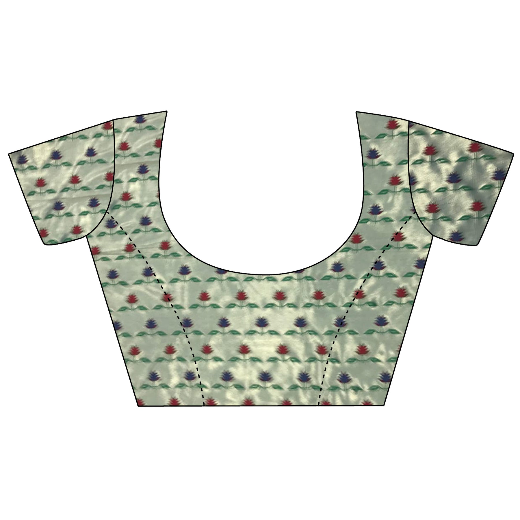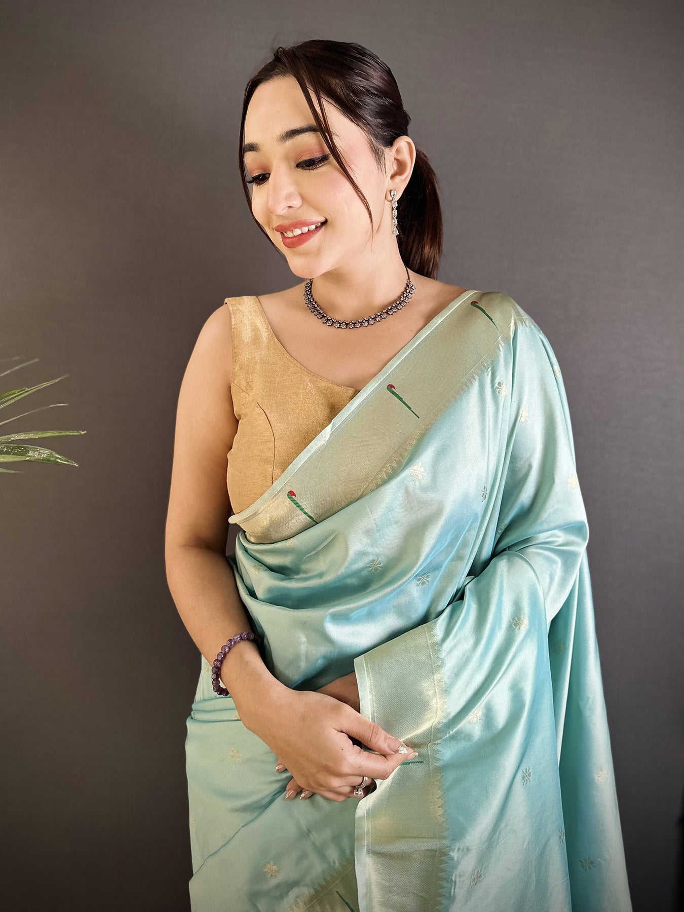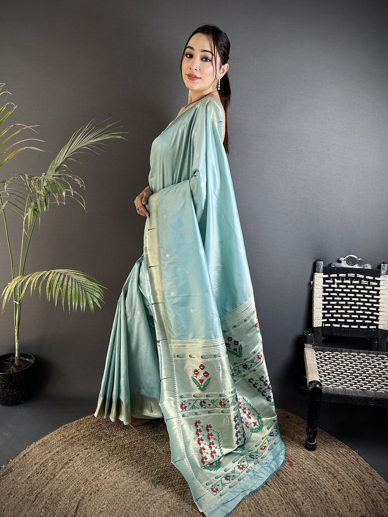 Feel radiant in this Sky Blue Lichi Silk Paithani Saree, adorned with floral Ikkat motifs and intricate zari weaving. Perfect for weddings, festivals, and special traditional occasions.