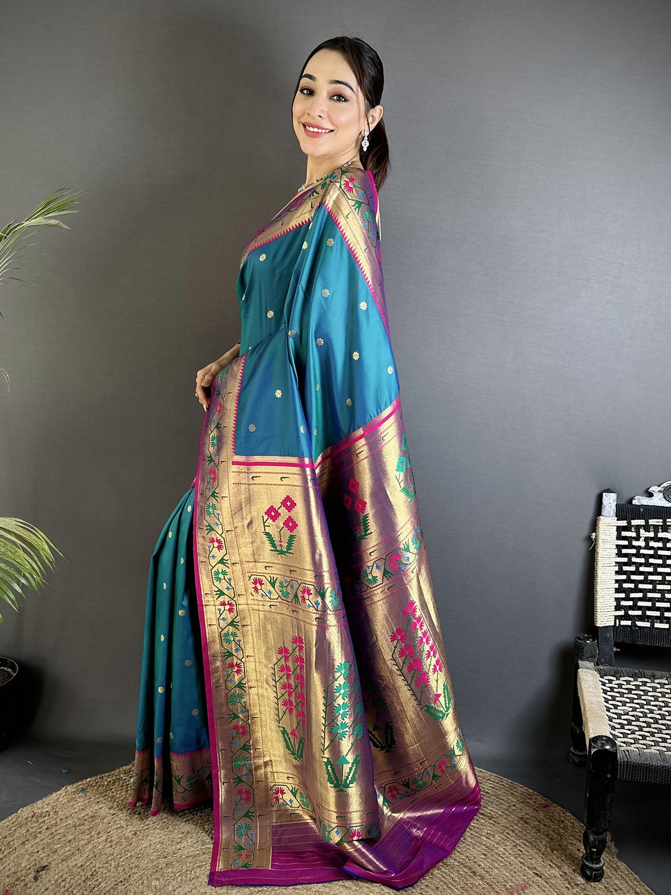 Elevate your ethnic style with this Teal Blue Lichi Silk Paithani Saree, featuring traditional Ikkat weaving and intricate floral motifs with zari work. Perfect for weddings and festive occasions.
