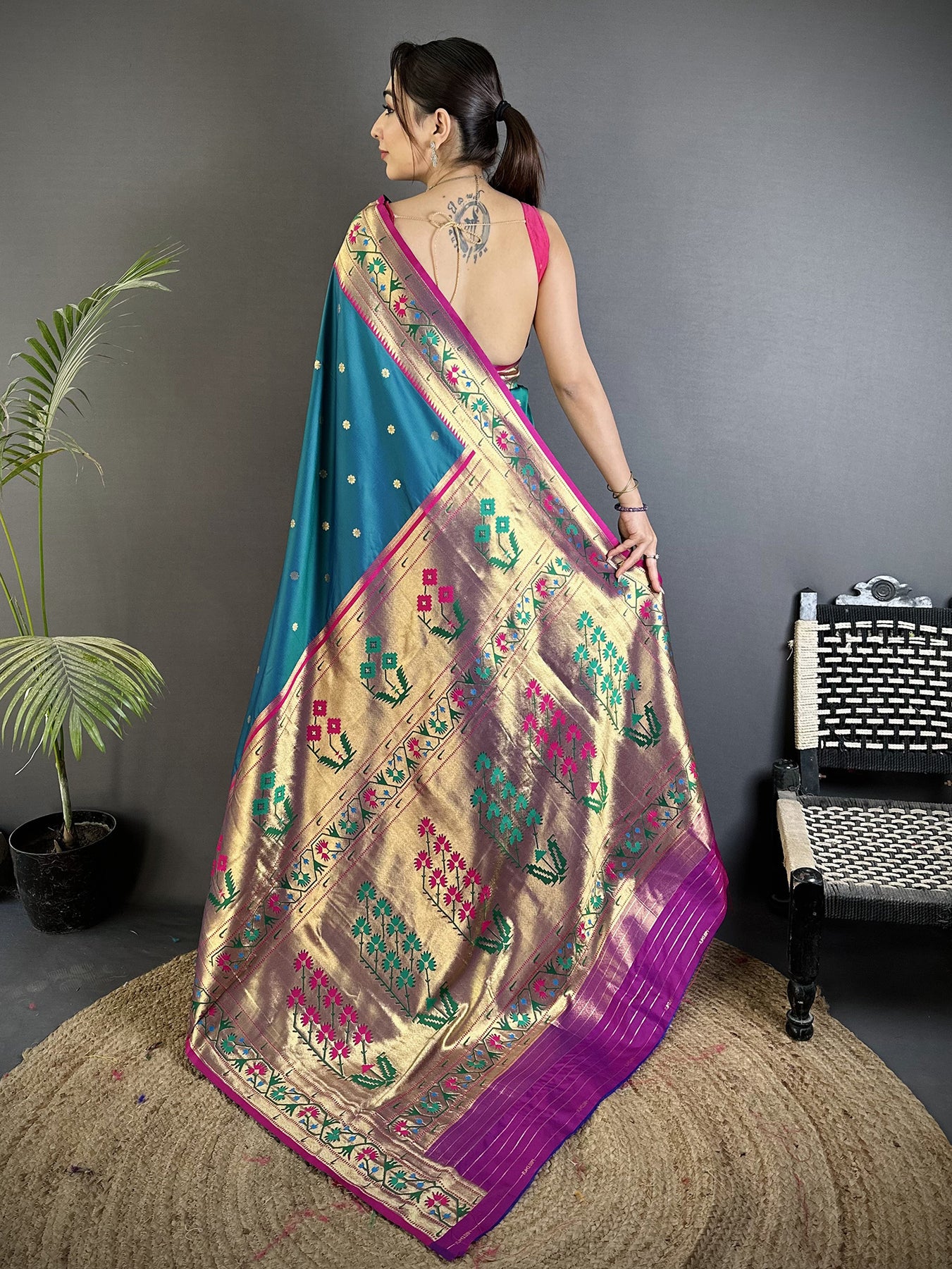 Pair this floral Ikkat Paithani with gold accessories for a graceful look. The lightweight drape and vibrant finish make it perfect for day or evening celebrations, parties, and traditional ceremonies.