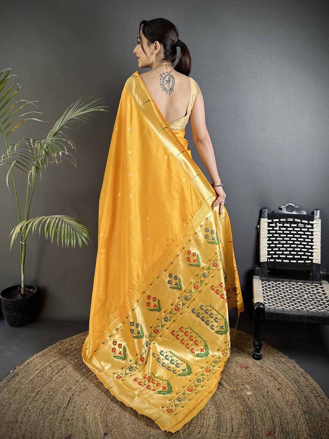 Brighten your wardrobe with this Yellow Lichi Silk Paithani Saree, featuring elegant Ikkat motifs and intricate floral zari weaving, perfect for weddings, festive events, and traditional celebrations.