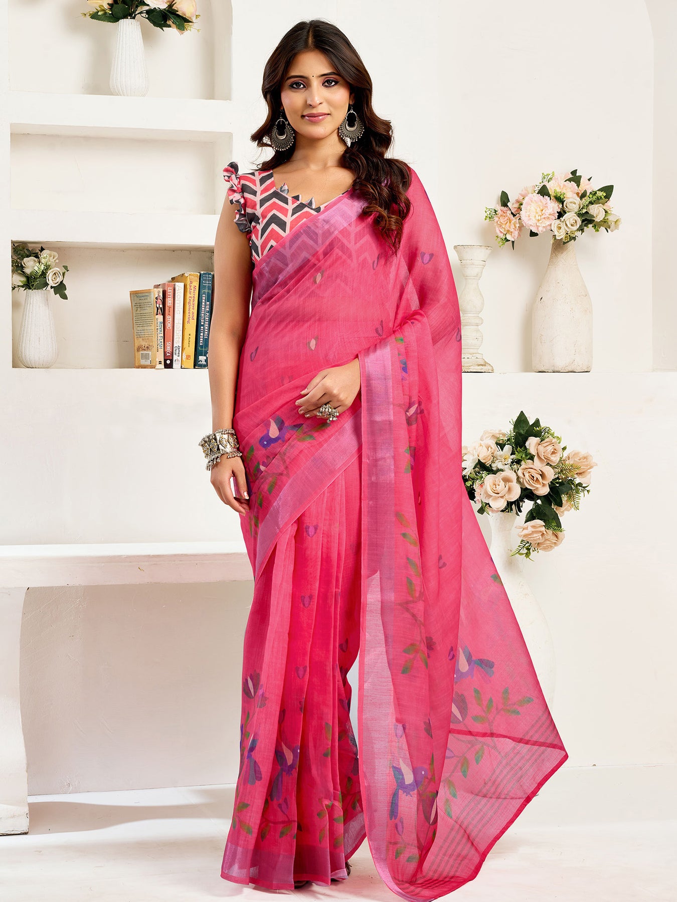 Pink Linen Bird Motifs Printed Ready To Wear Saree