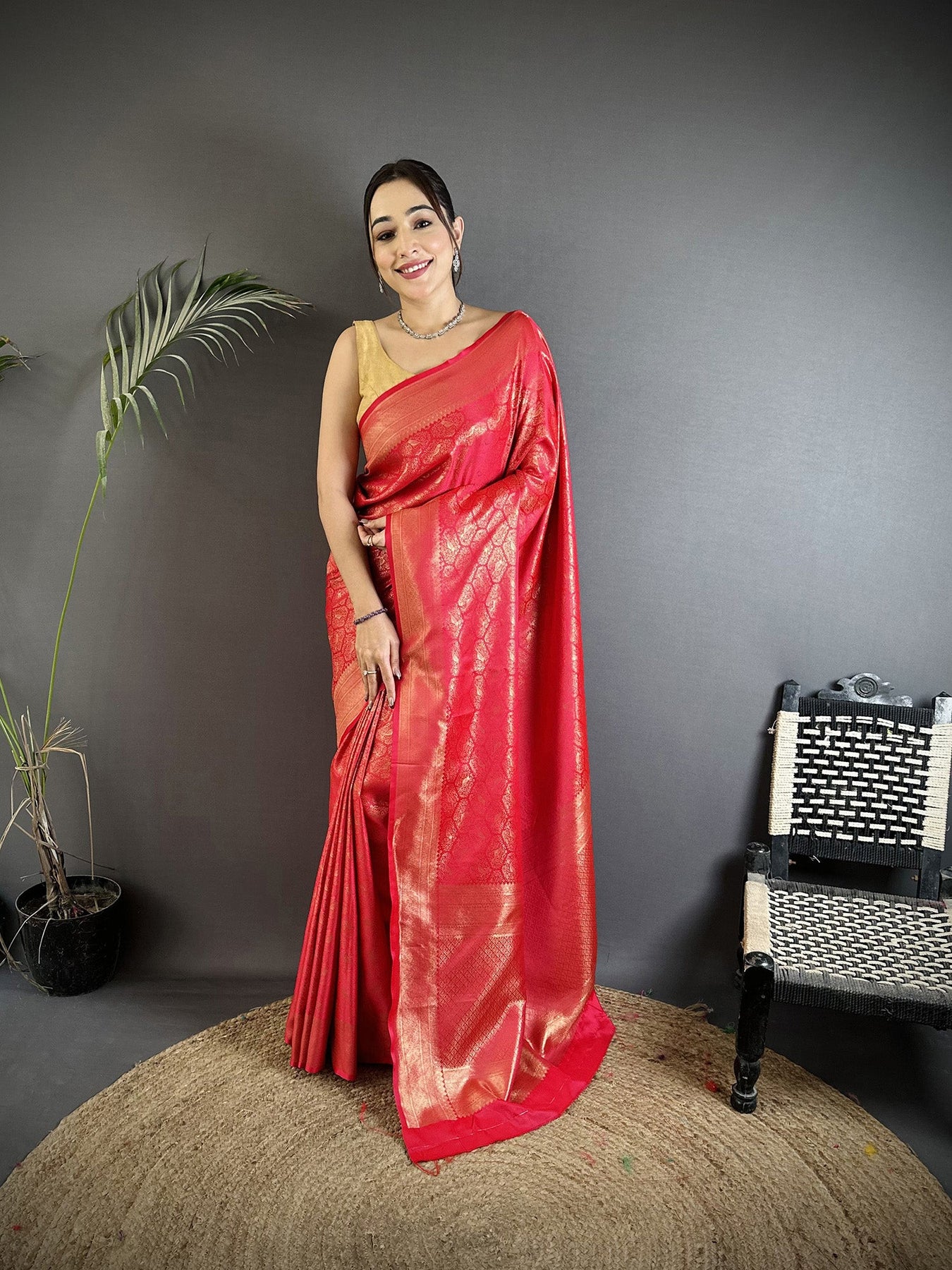Red Soft Satin Silk Paisley & Floral Banarasi Saree