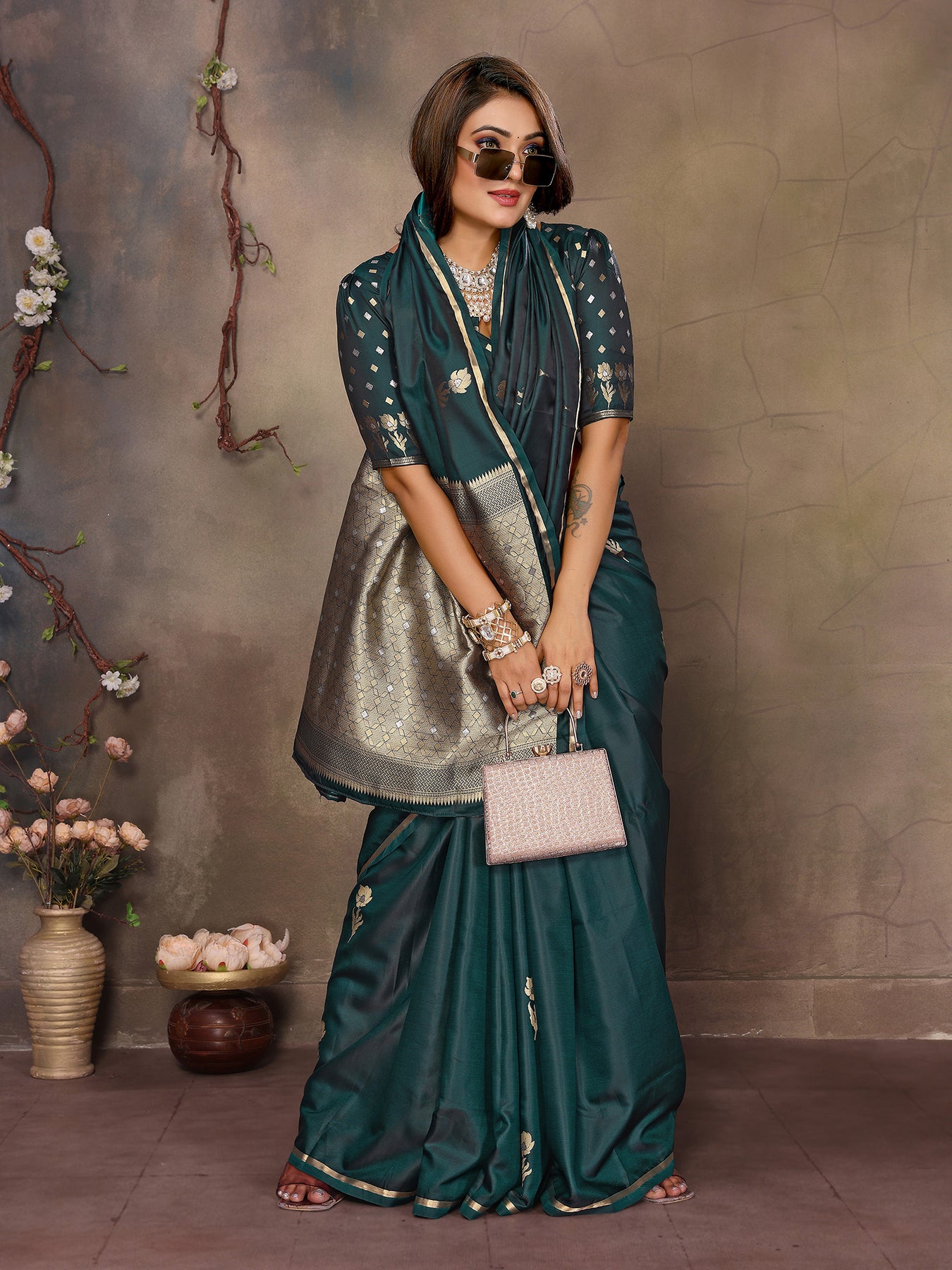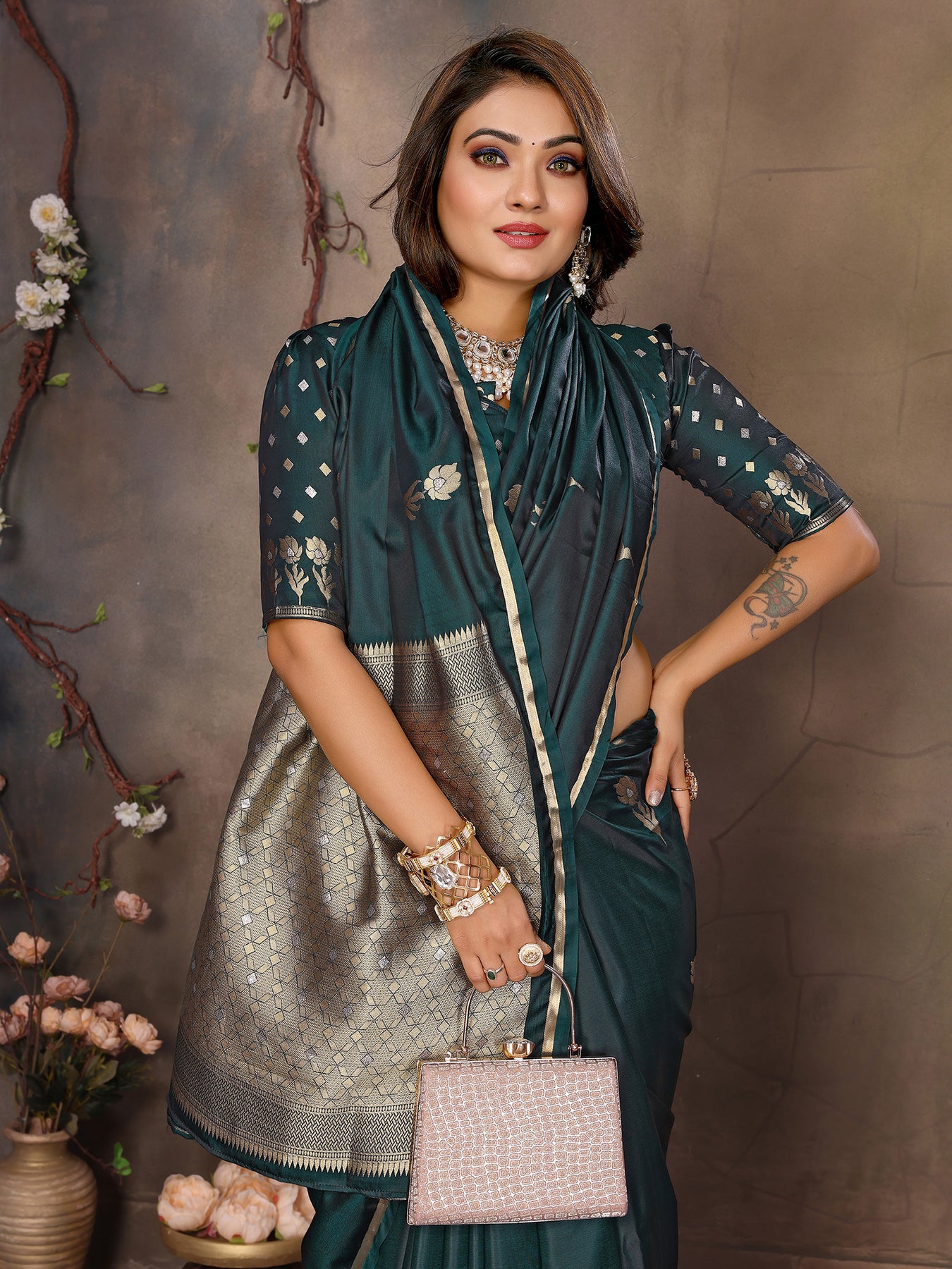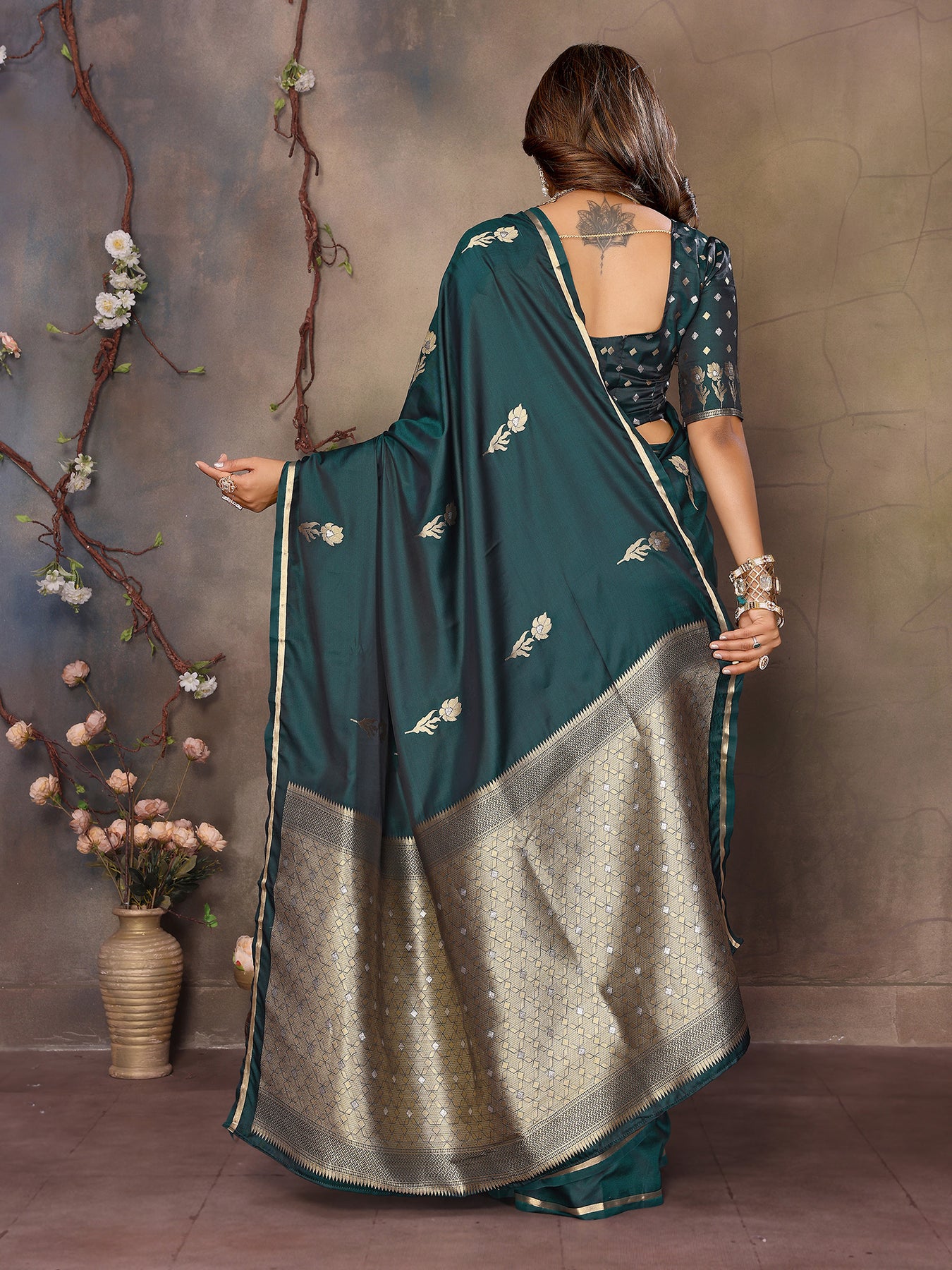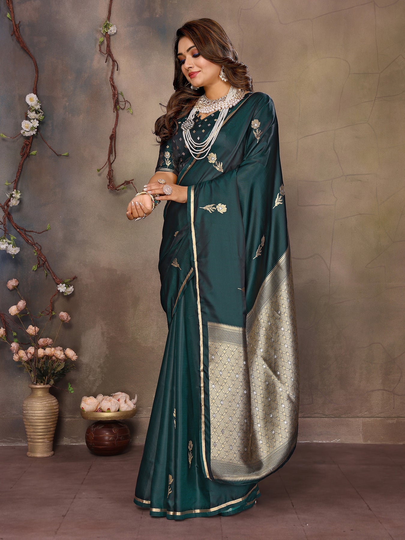 Dark Green Satin Silk Floral & Botanical Motifs Zari Woven Banarasi Saree