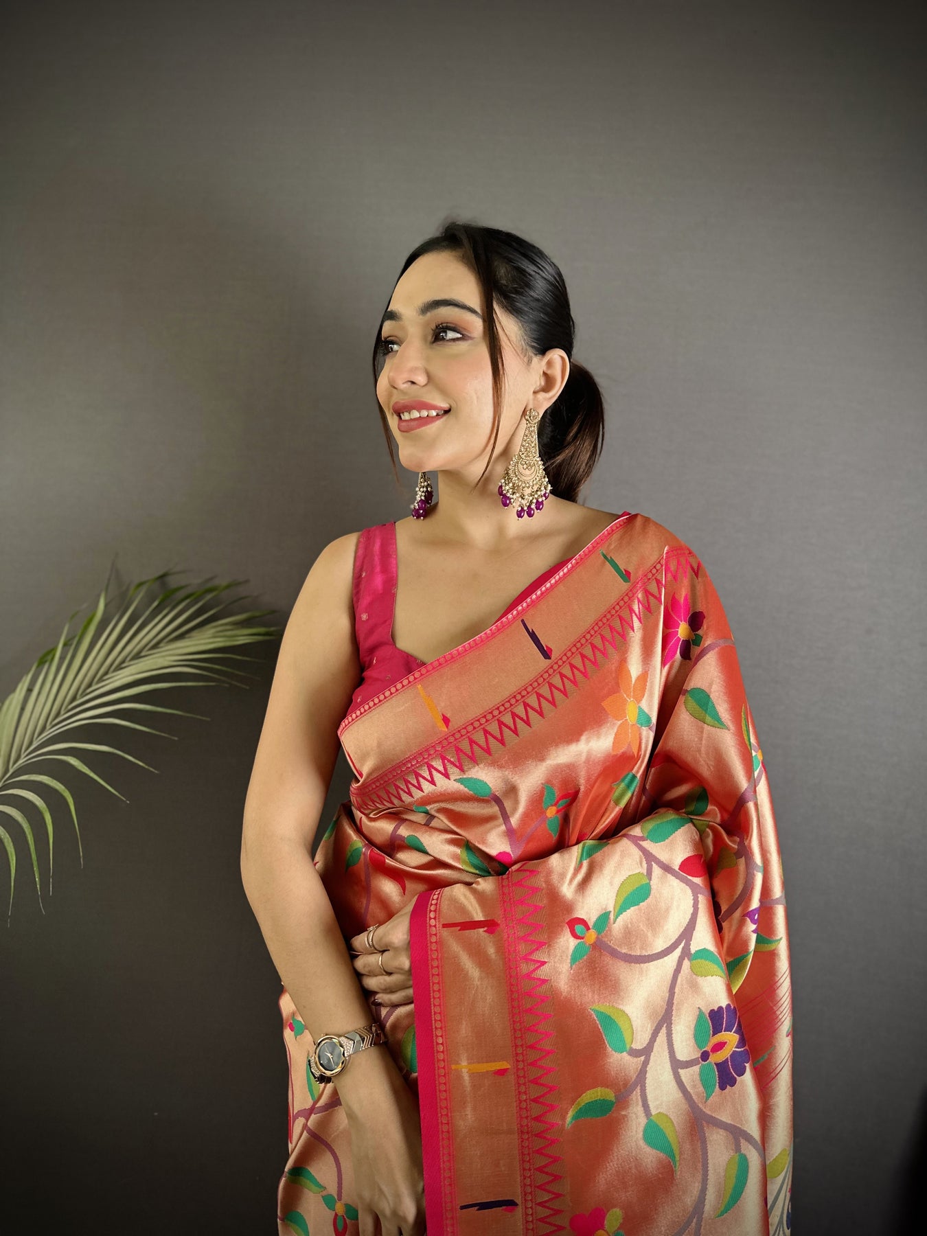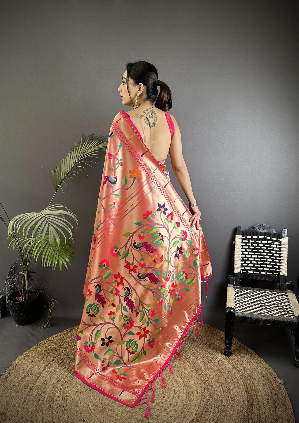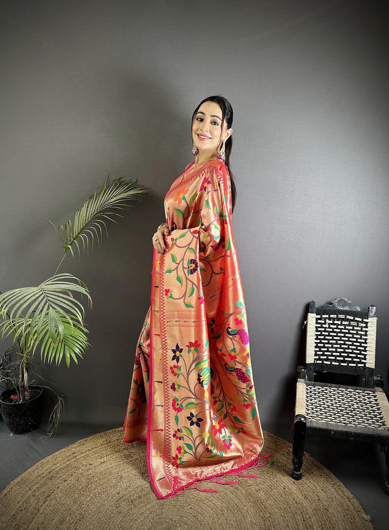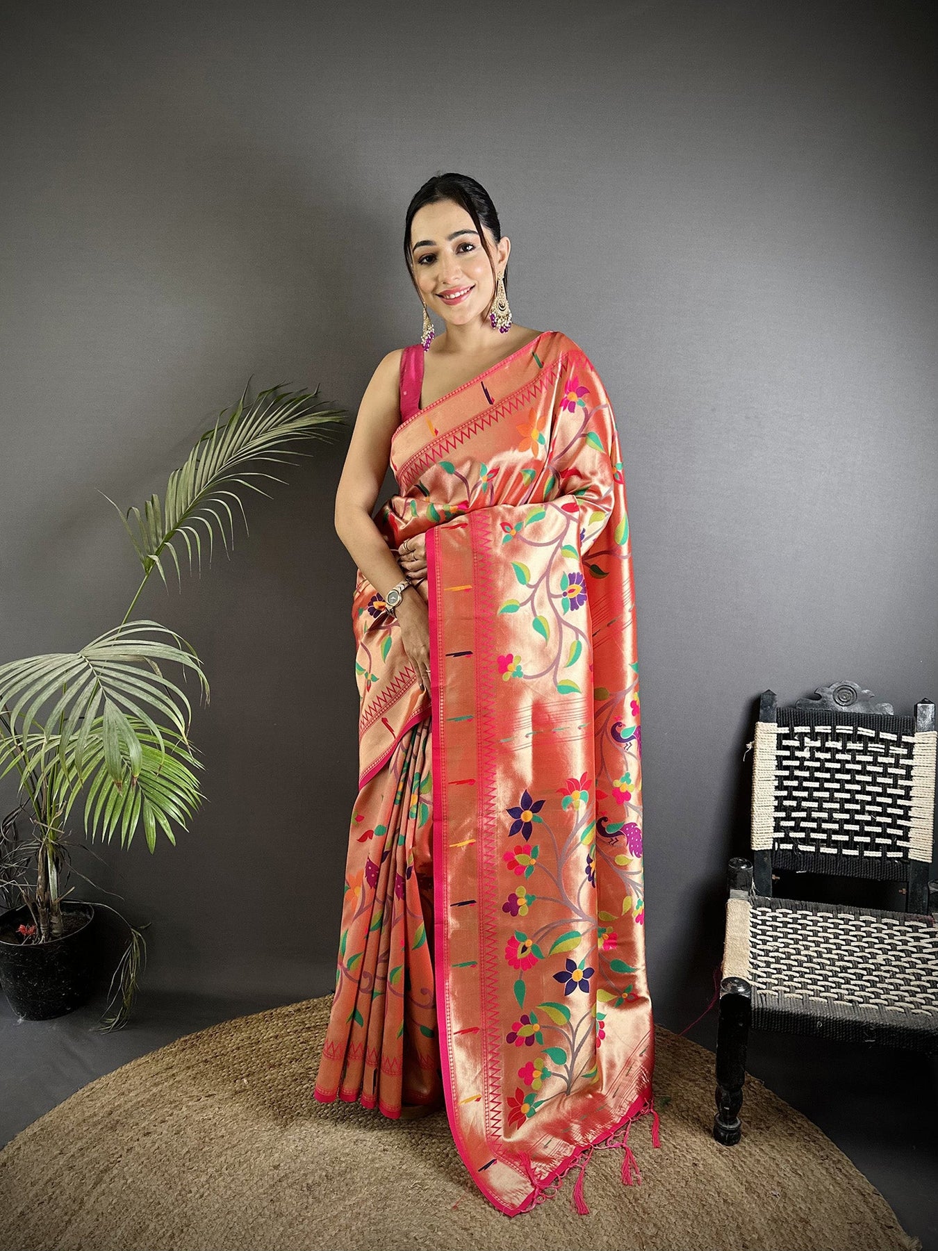 Reddish Pink Soft Silk Peacock and Floral Pattern Paithani Saree
