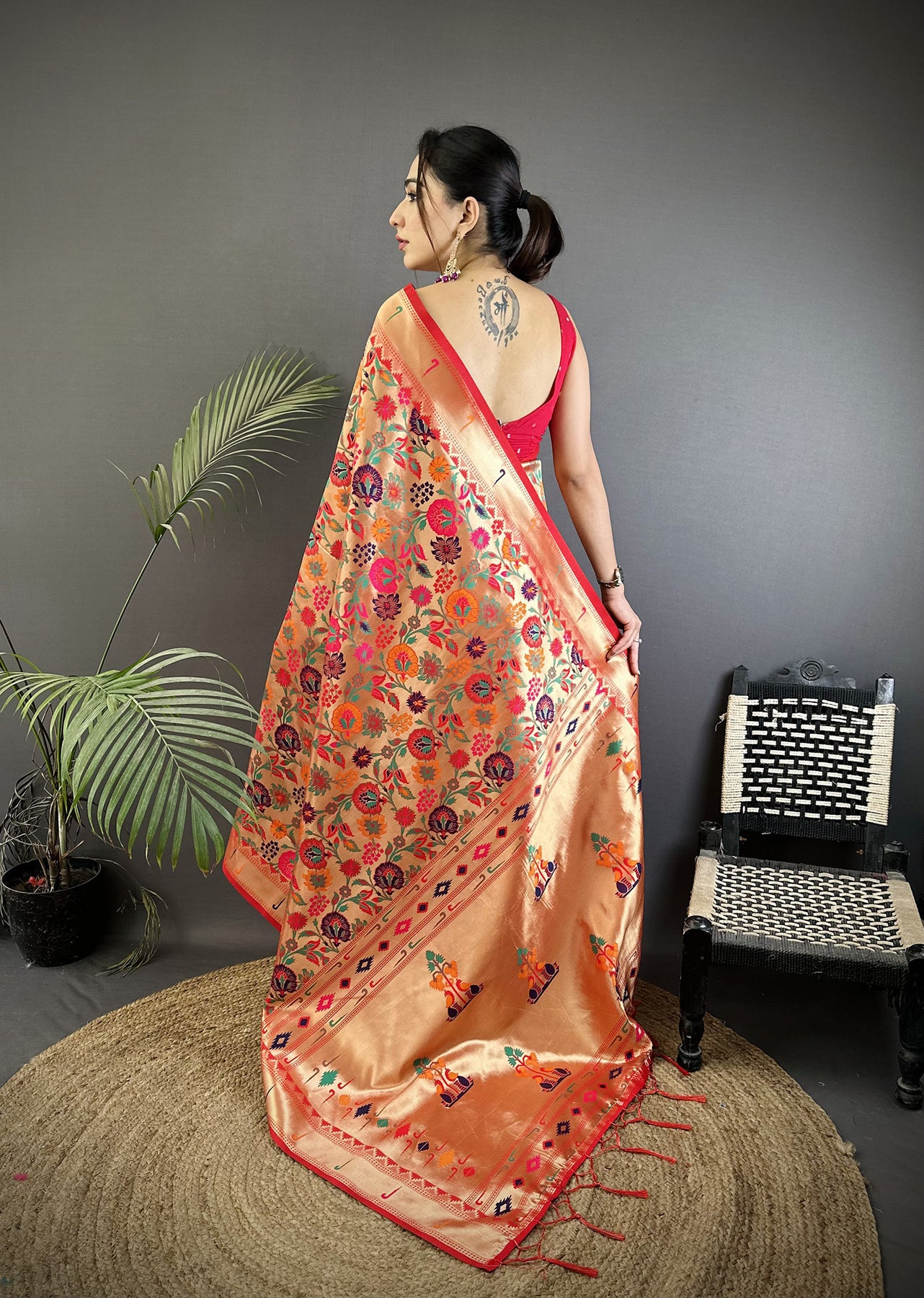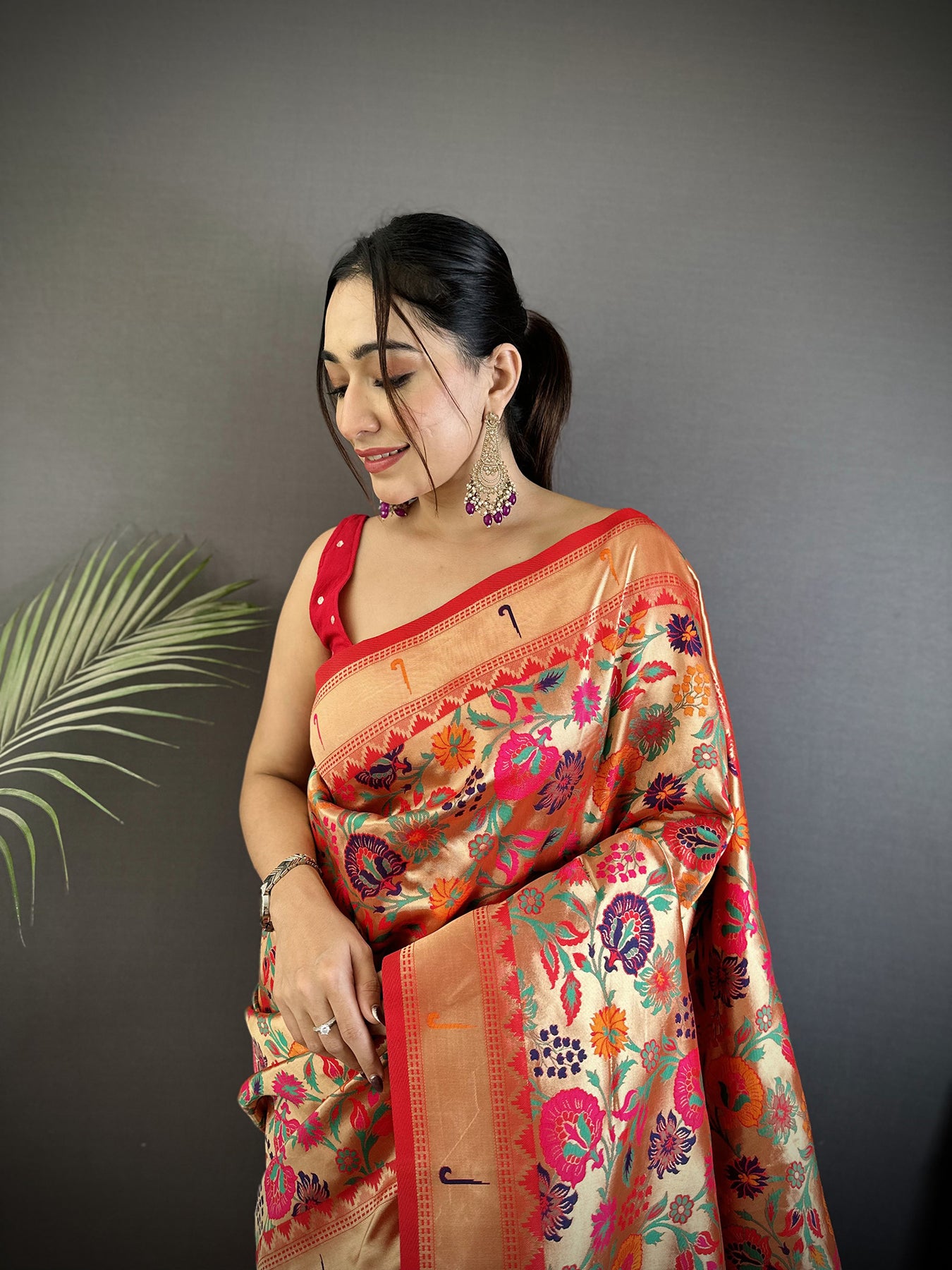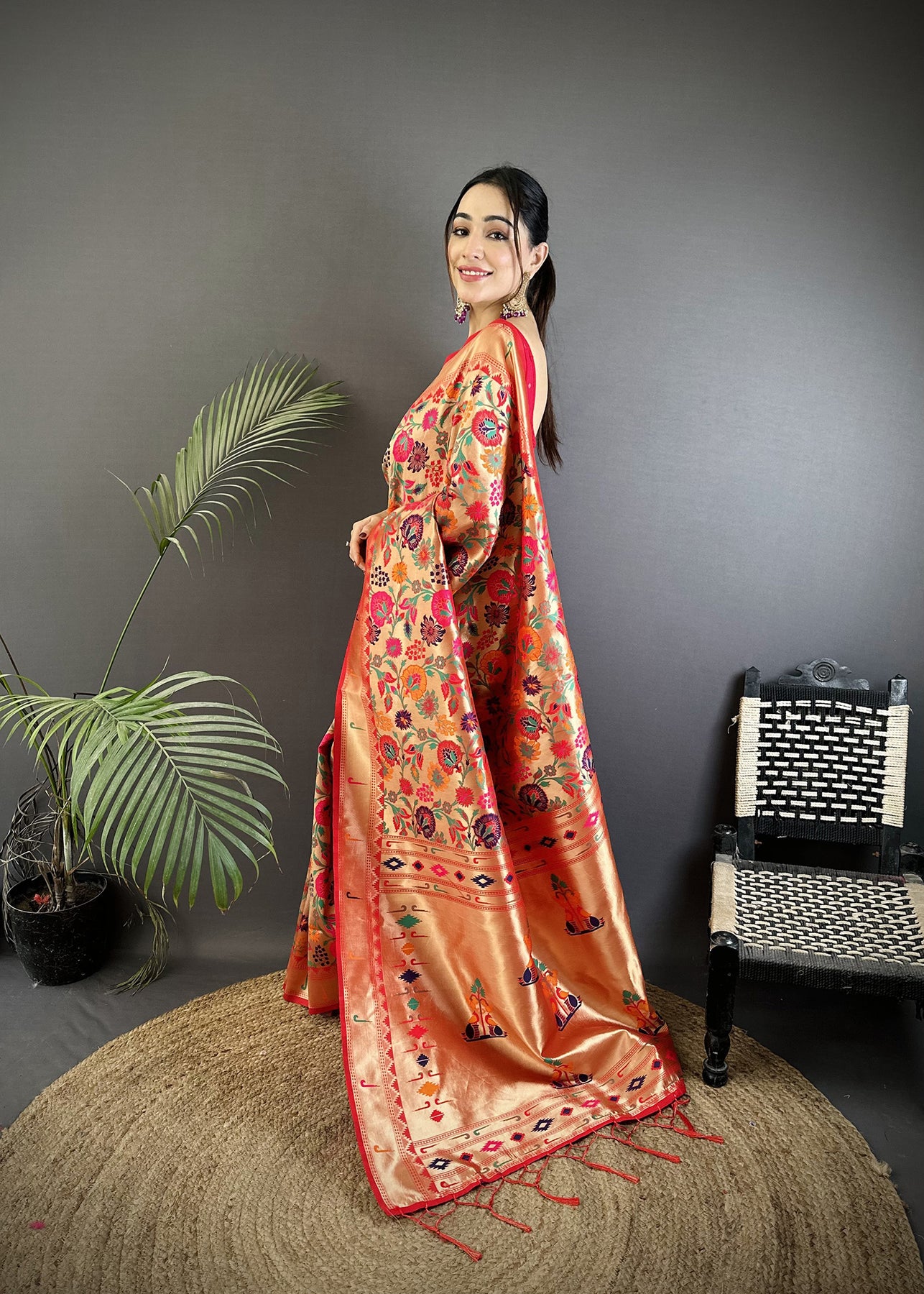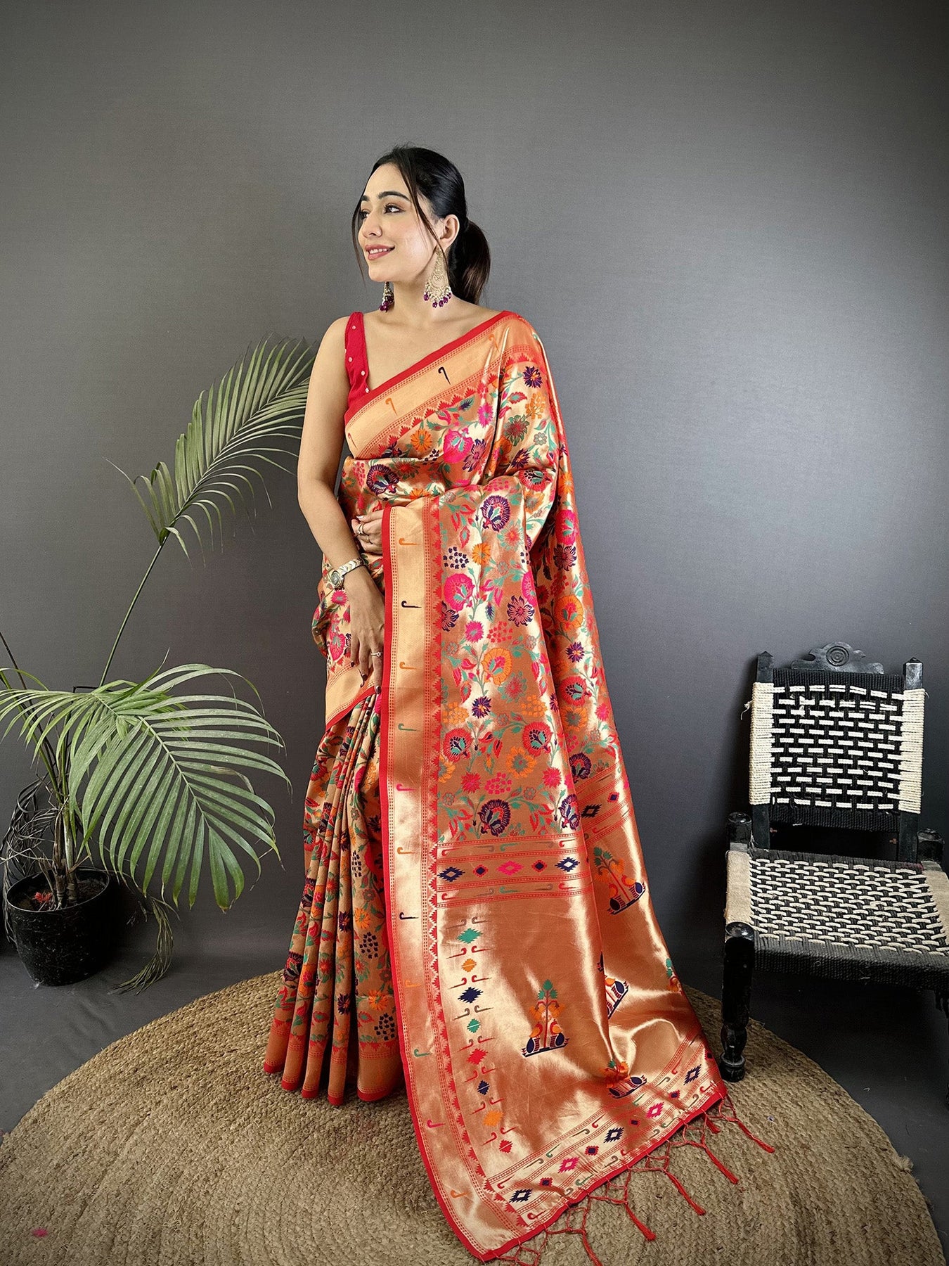Orange Soft Silk Floral & Peacock Pattern Paithani Saree