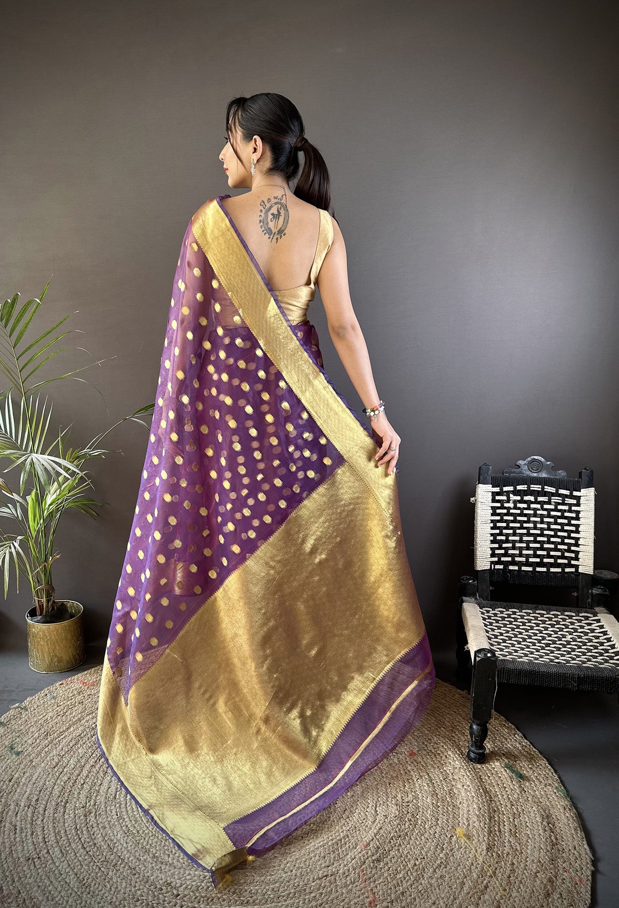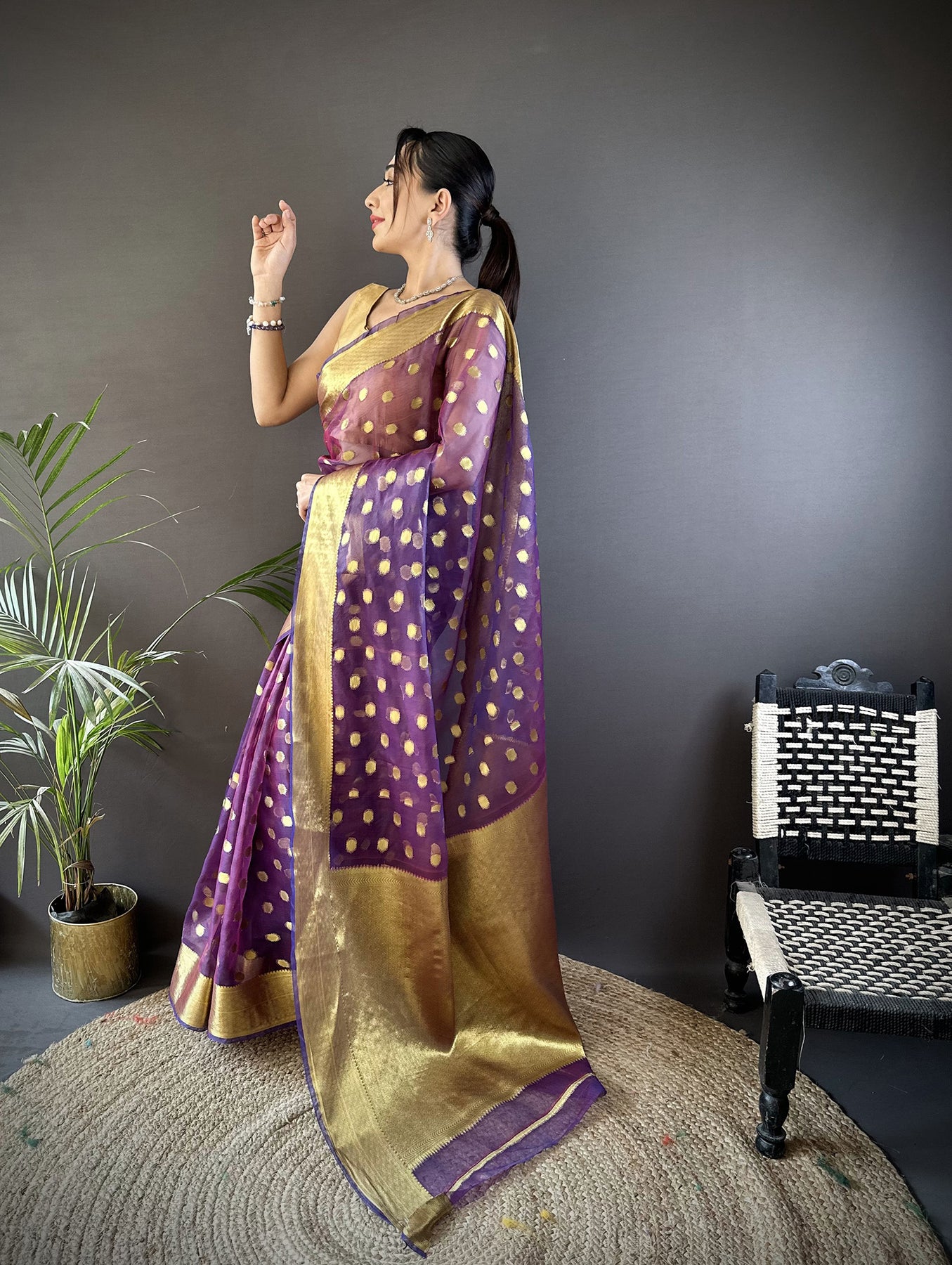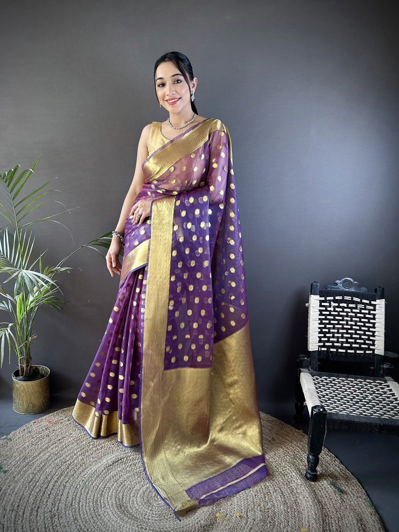 Purple Organza Silk Polka Dot Zari Weaving Banarasi Saree