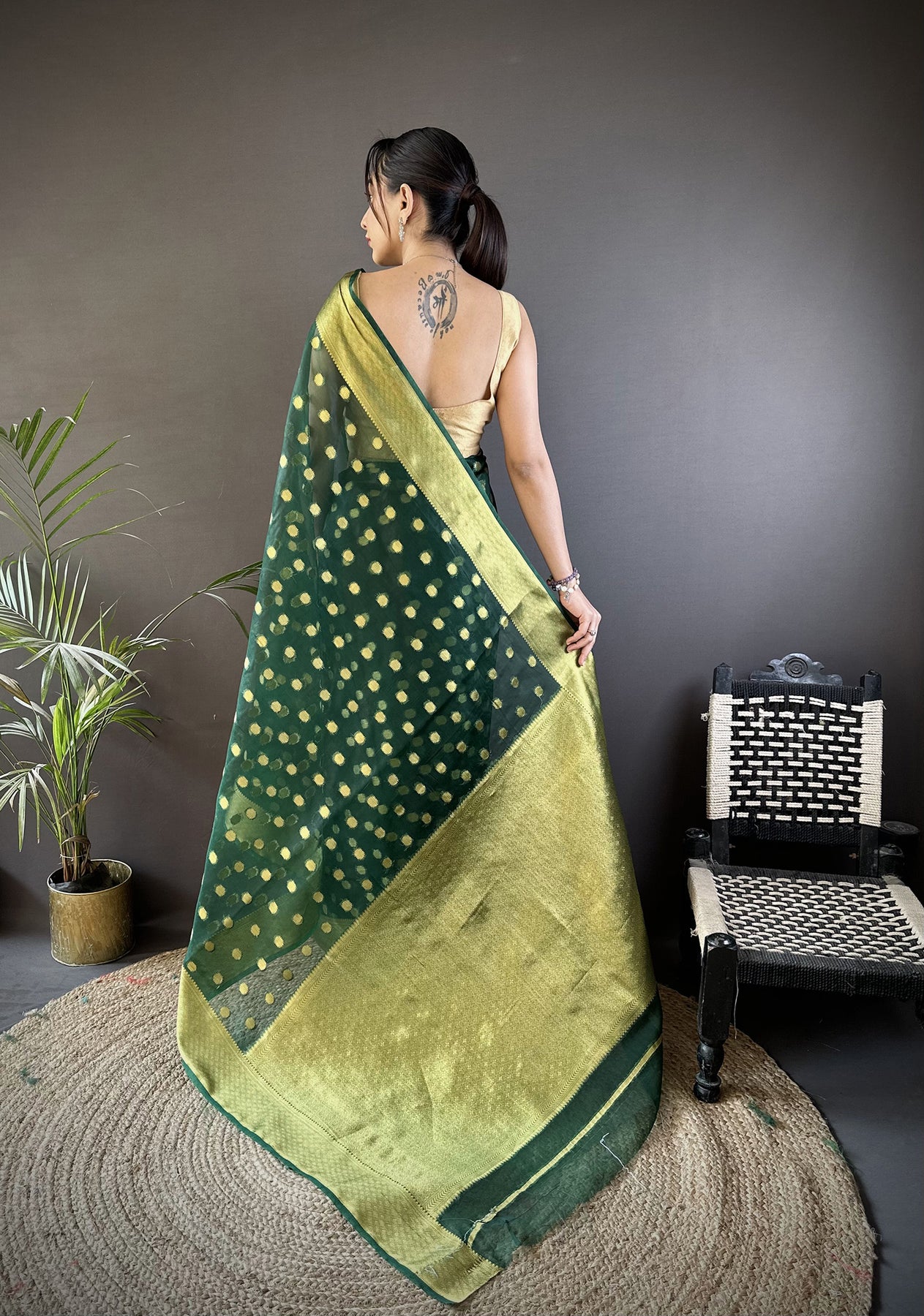 Green Organza Silk Polka Dot Zari Weaving Banarasi Saree