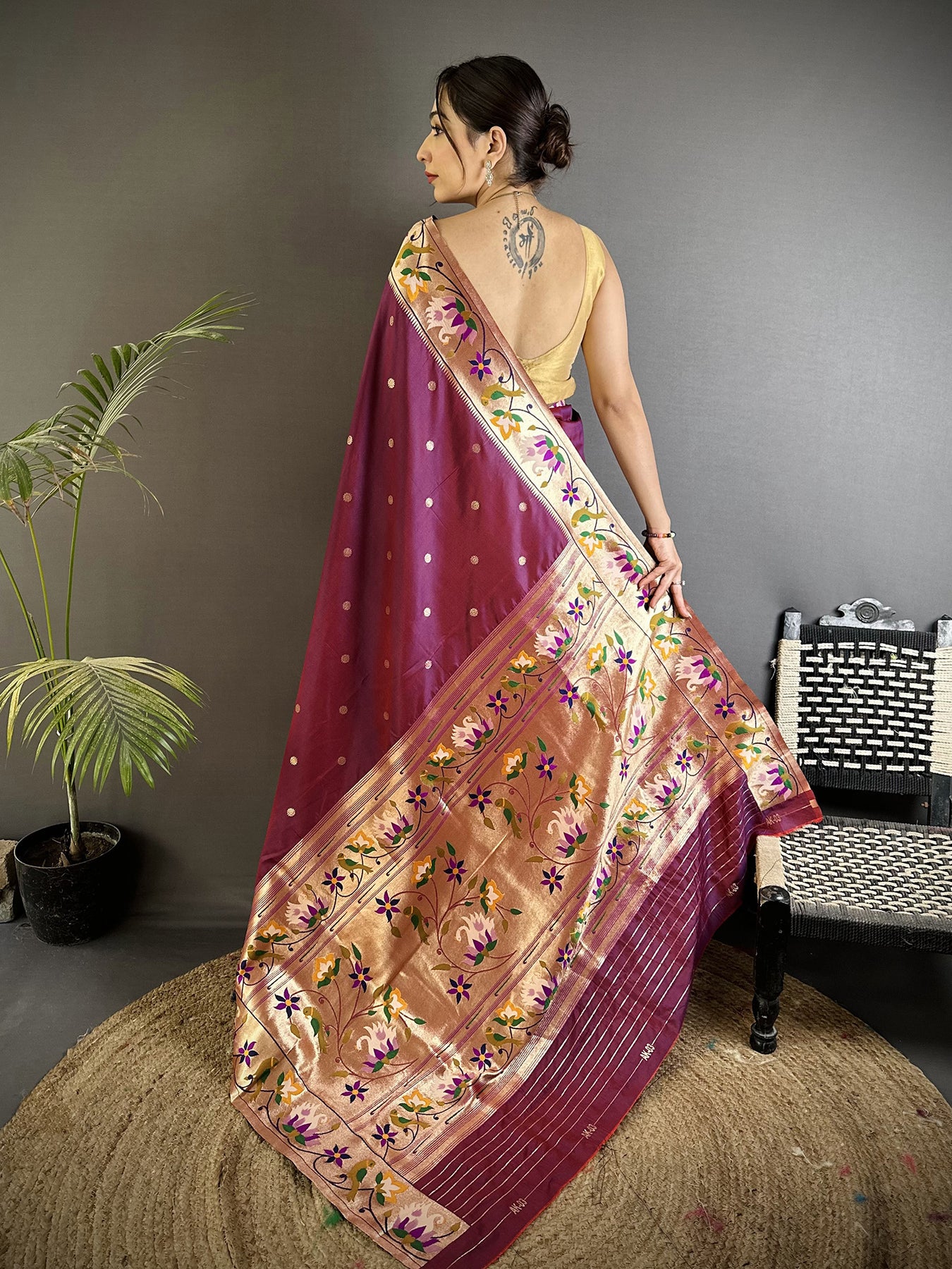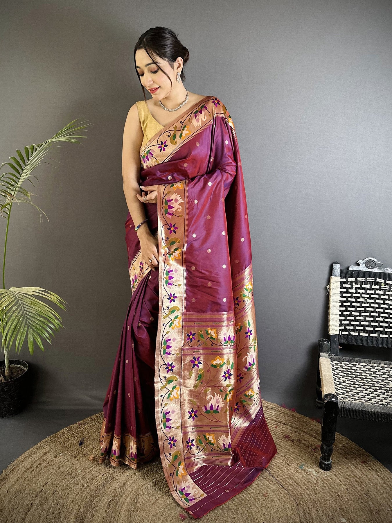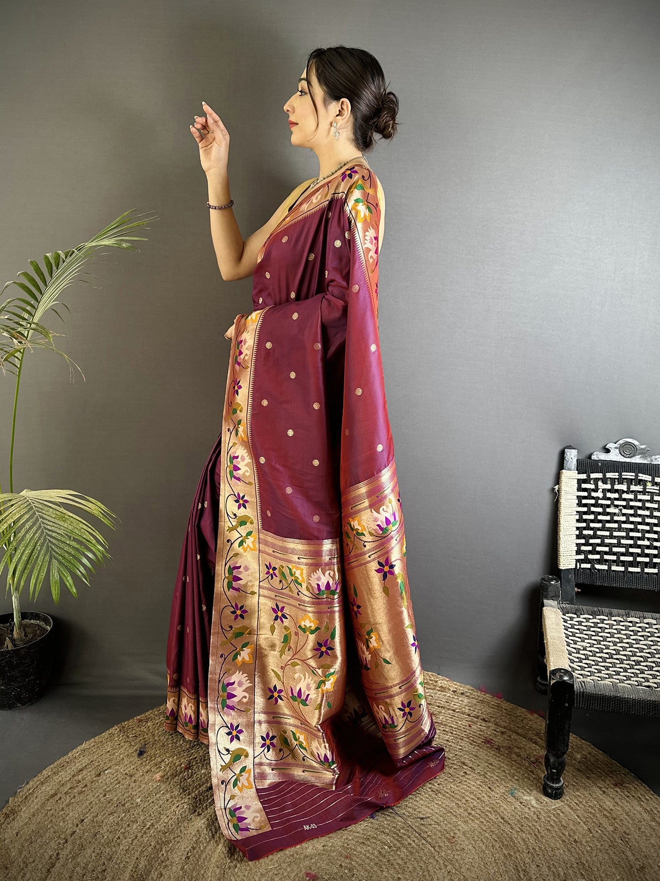Maroon Lichi Silk Floral & Meena Weaving Zari Worked Paithani Saree