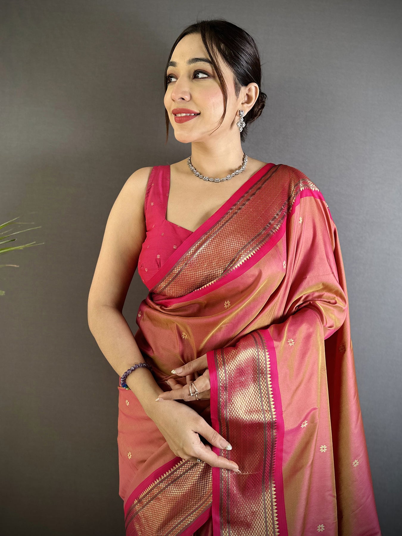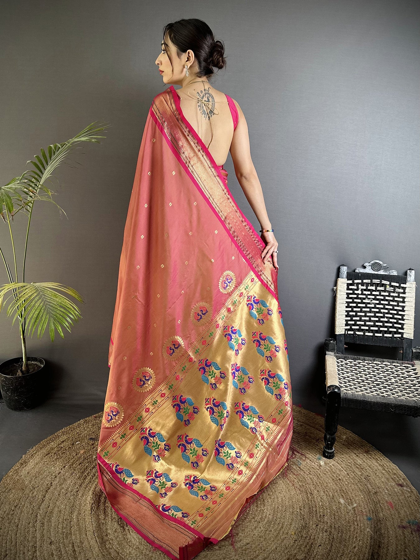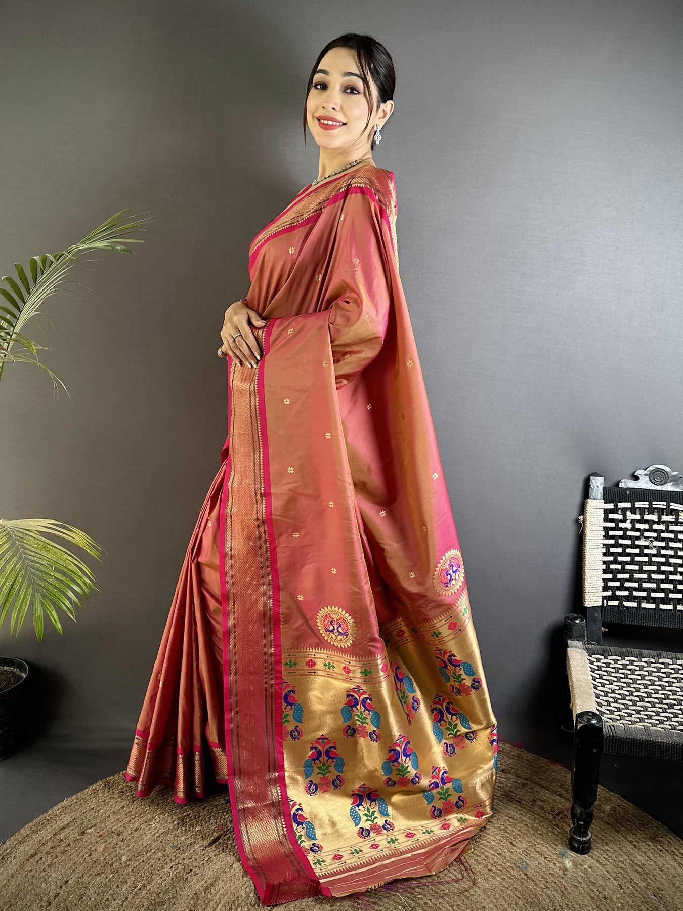 Peach Lichi Silk Peacock Ethnic Motifs Zari Woven Paithani Saree
