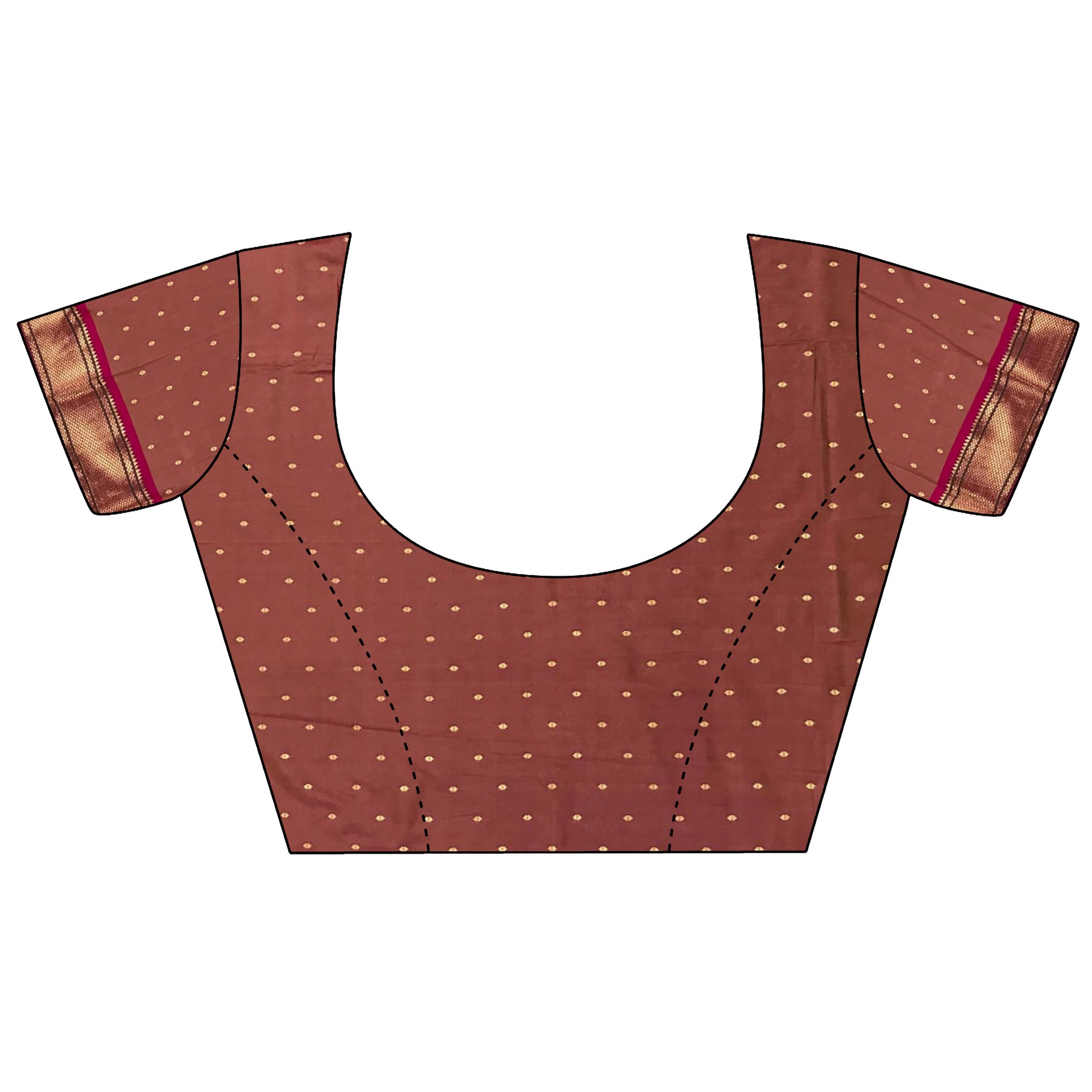 Experience the charm of this peach Lichi Silk Paithani saree, featuring intricate peacock ethnic motifs with zari weaving. Its smooth silk drape adds grace to weddings, parties, and festive occasions.The delicate peach shade highlights traditional Paithani craftsmanship, with shimmering zari details enhancing elegance. Perfect for cultural events, receptions, and celebrations, it brings timeless ethnic beauty to your wardrobe.Crafted from premium Lichi silk, this saree ensures comfort, shine, and durability. Pair with gold or kundan jewelry for a stunning look. A classic saree that blends tradition with modern sophistication.