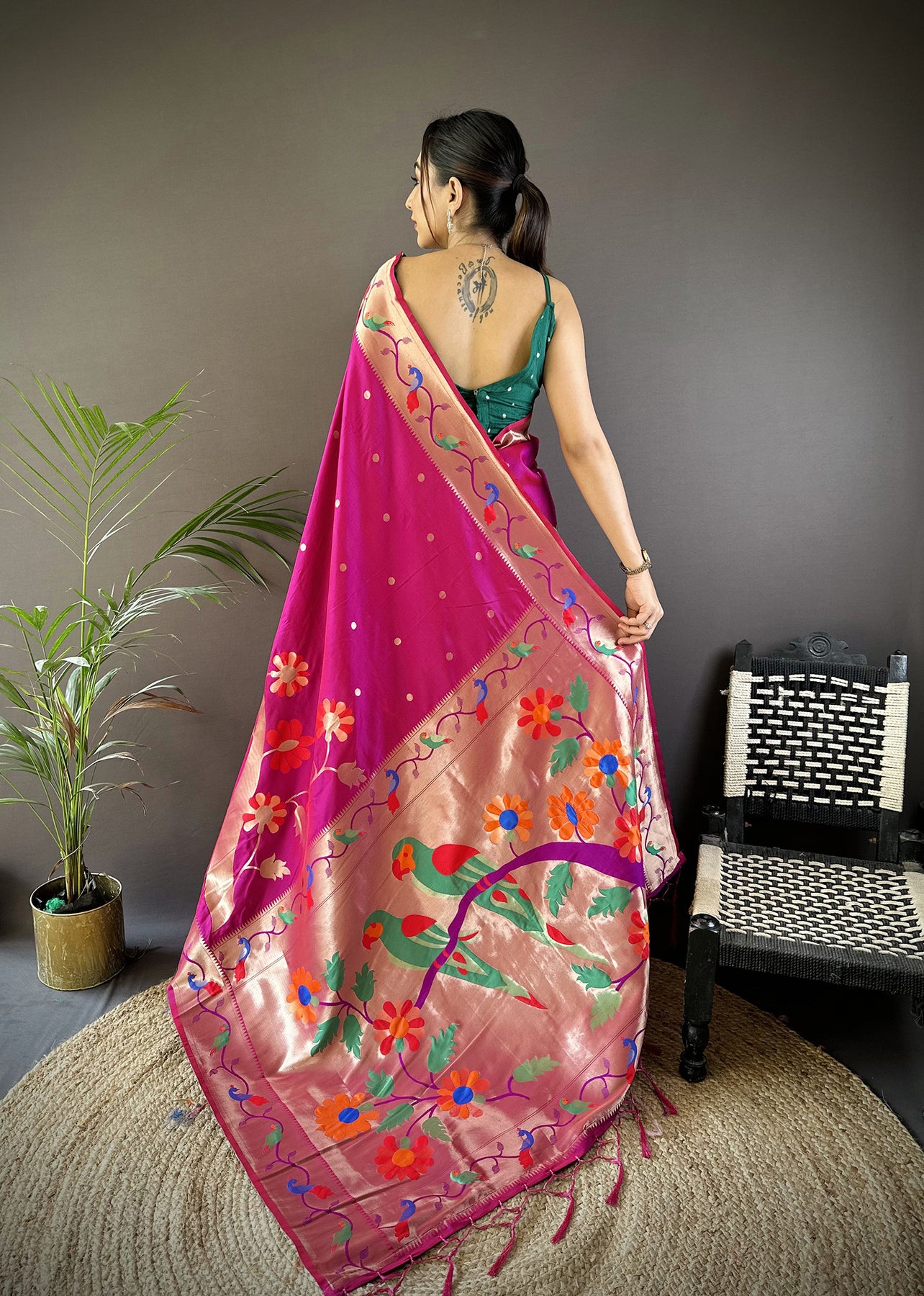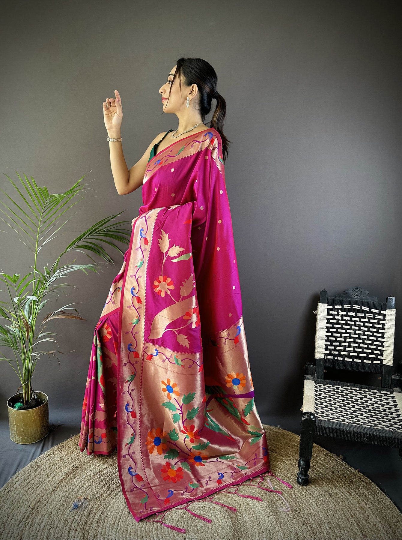 Dark Pink Soft Silk Zari Woven Floral Motifs Paithani Saree