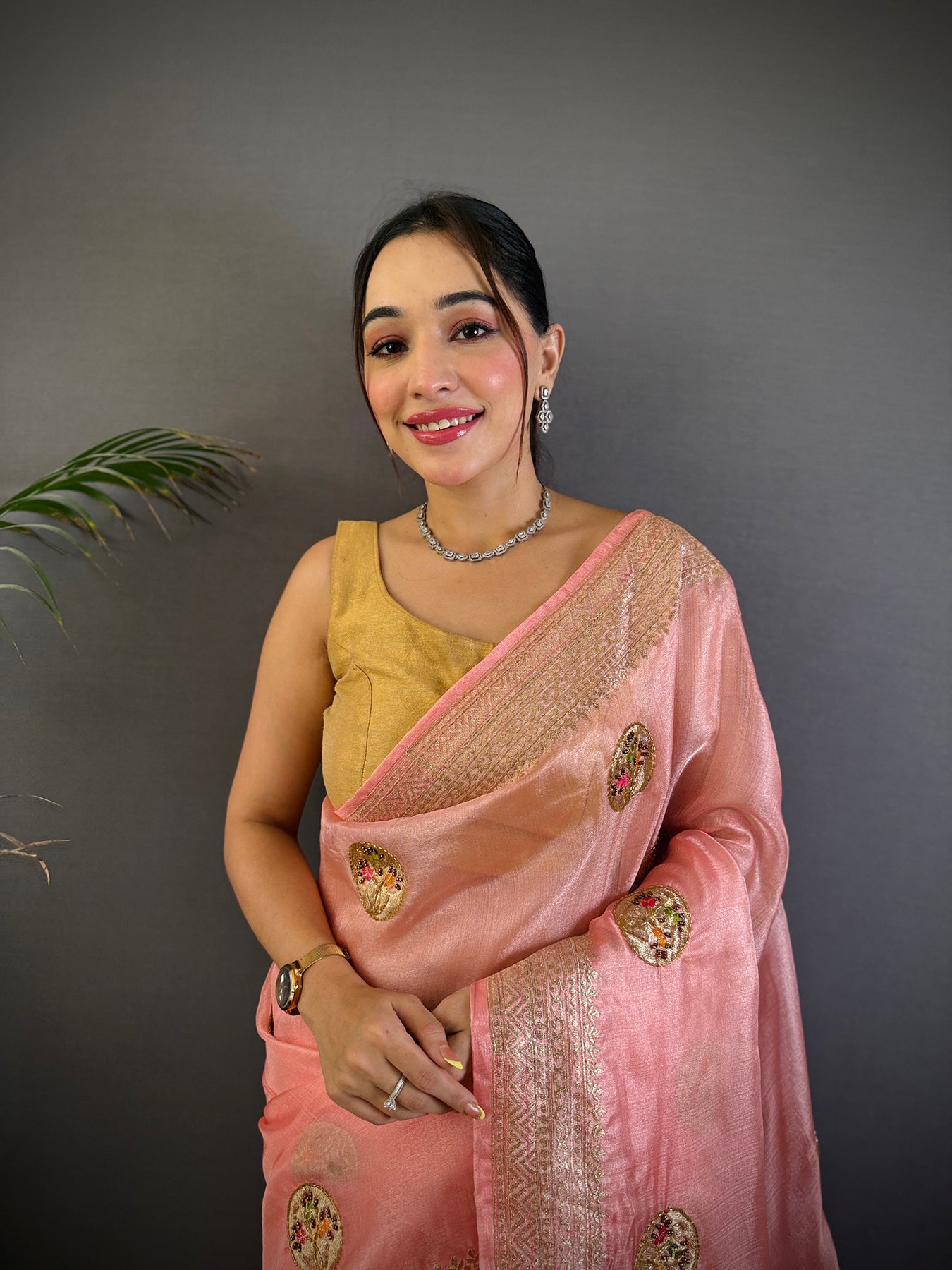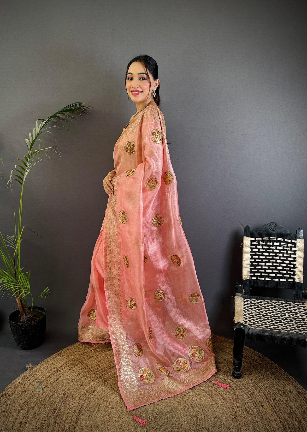 Baby Pink Organza Silk Handloom Banarasi Saree with Heavy Khatali Butta Work