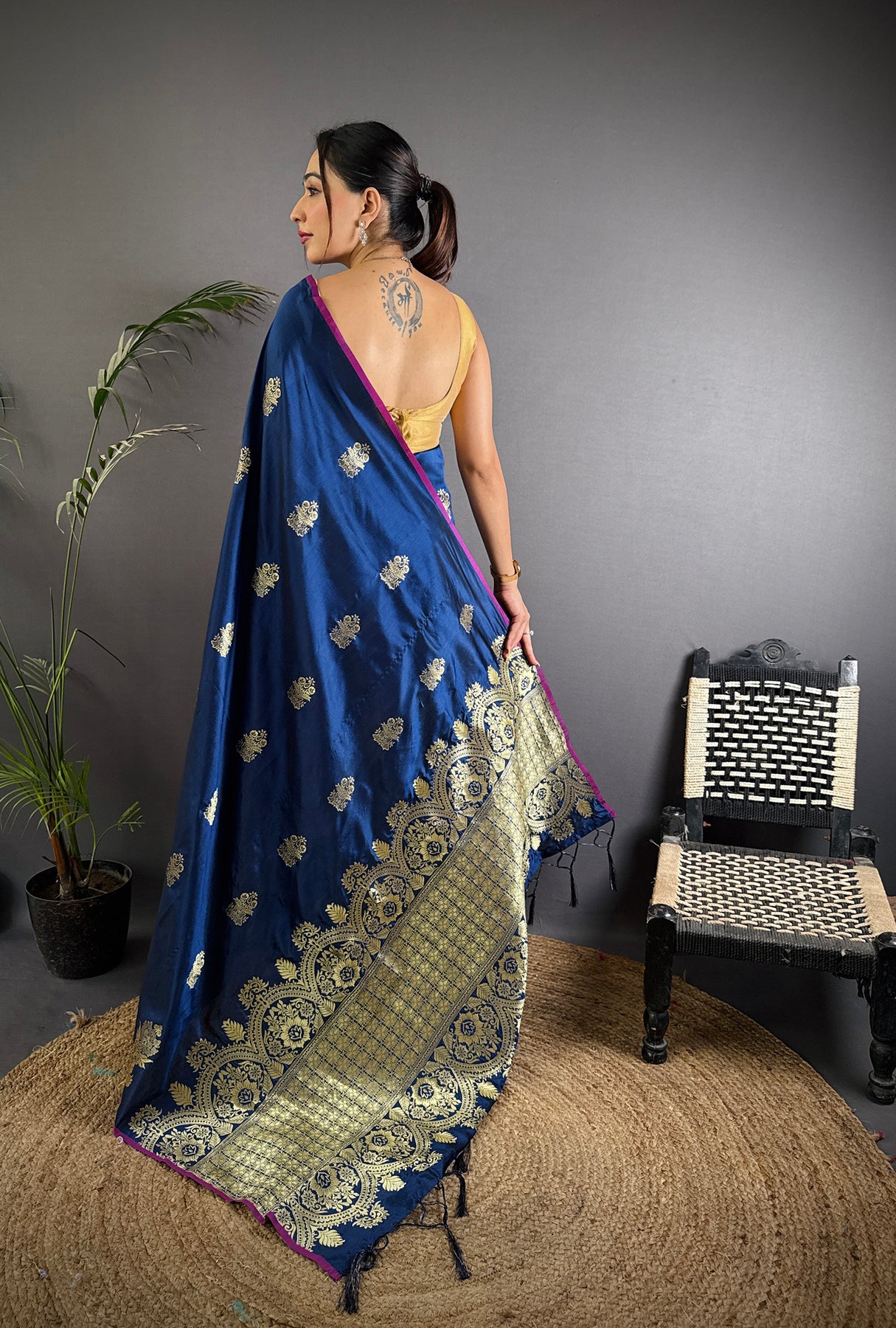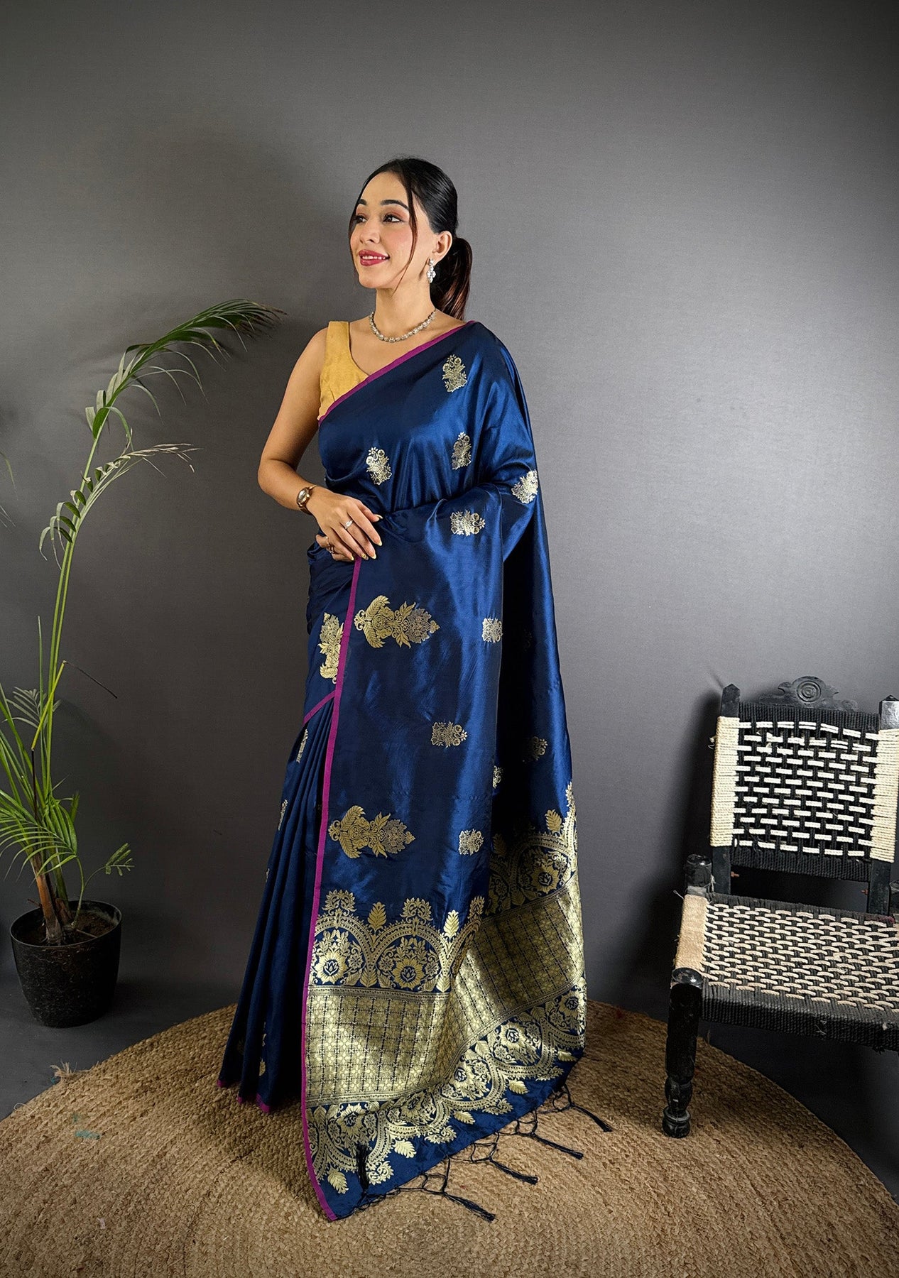 Navy Blue Lichi Silk Golen Zari Meena Weaving Banarasi Saree